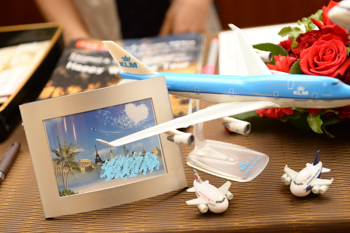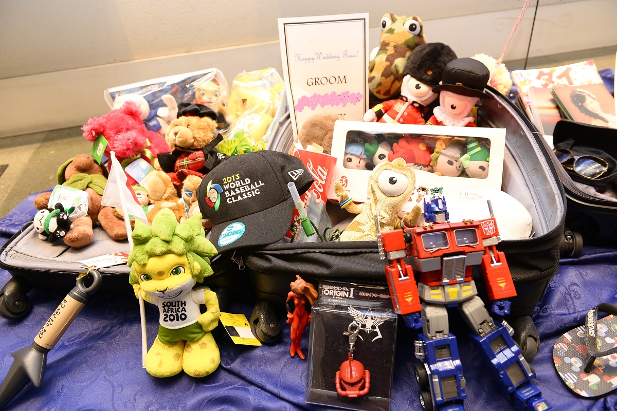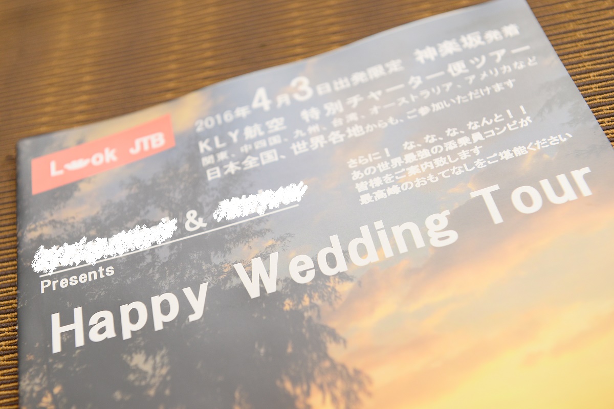 テーマを2人の共通の趣味である『旅』に設定していたので、パスポート型の招待状には航空券を模したWeddingチケットを同封して発送。席札は荷物タグに入れ、旅行会社のパンフレット風の席次表等など、全て2人で考え、作成しました。そしてプランナーさんからもアイディアをもらいながら、当日は2人の旅の思い出や写真などをレストランの様々な場所に飾り、披露宴前には新婦の私が空港の搭乗案内のようなアナウンスを流しました。