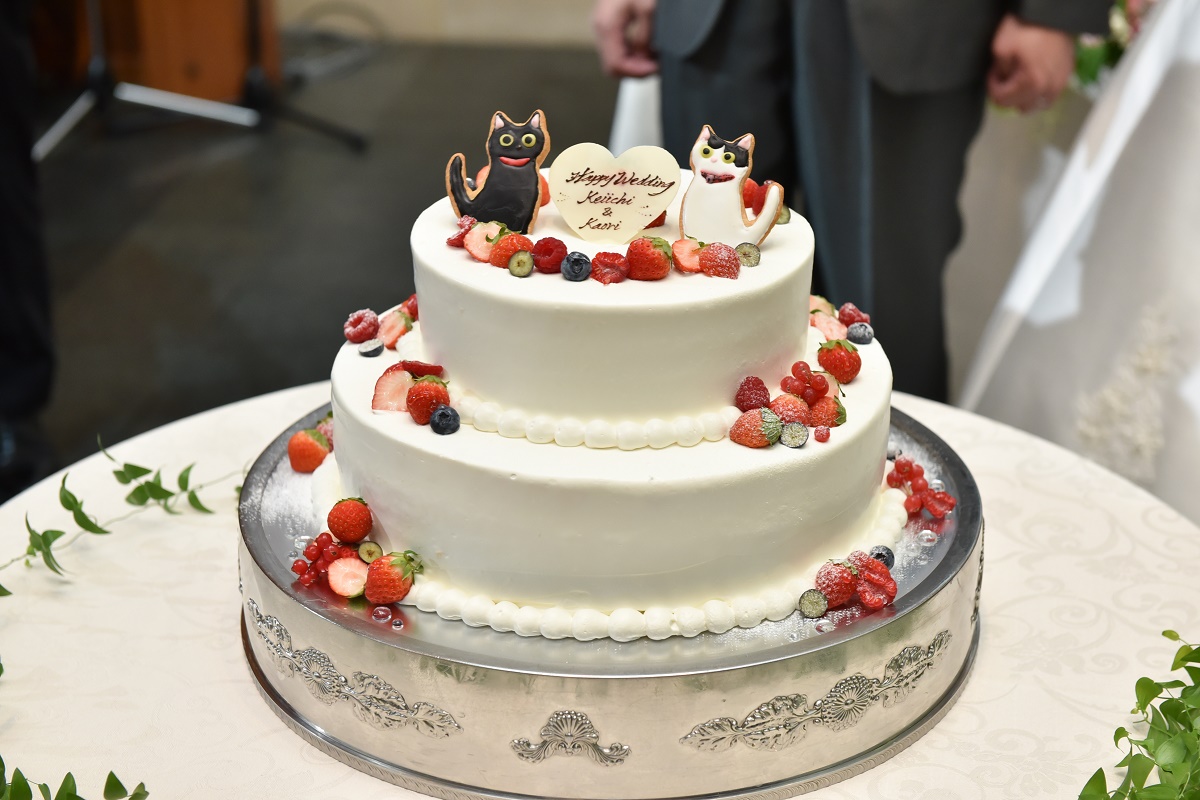 あとはウェディングケーキの装飾で、小野澤さんと相談を重ねて作っていただいた猫のクッキーです。とても似ていると(特に我が家で)好評でした。