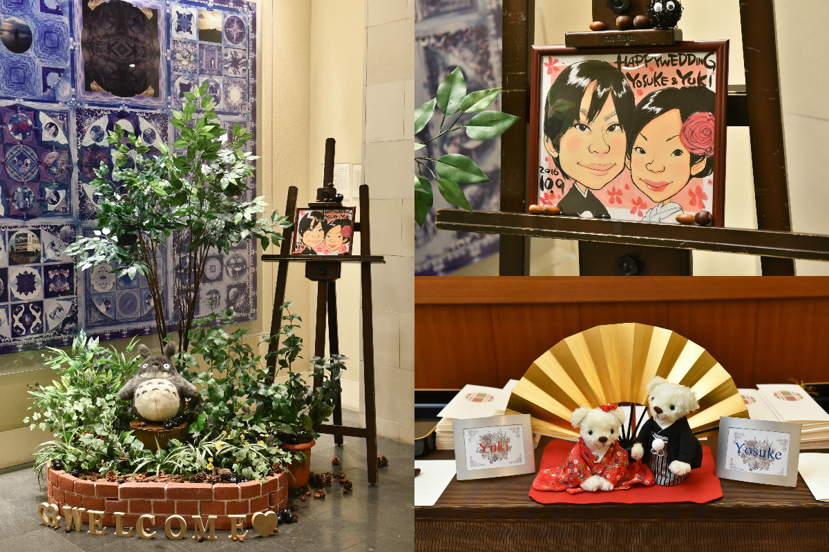 最終的なテーマがトトロになったので、ゲストテーブルに使用する装花もドウダンツツジだけではなく、自分達で作成したトトロと猫バスの造花を使用しました。この時使用した造花は、お帰りの際にゲストの人へのプレゼントとして使用しました。