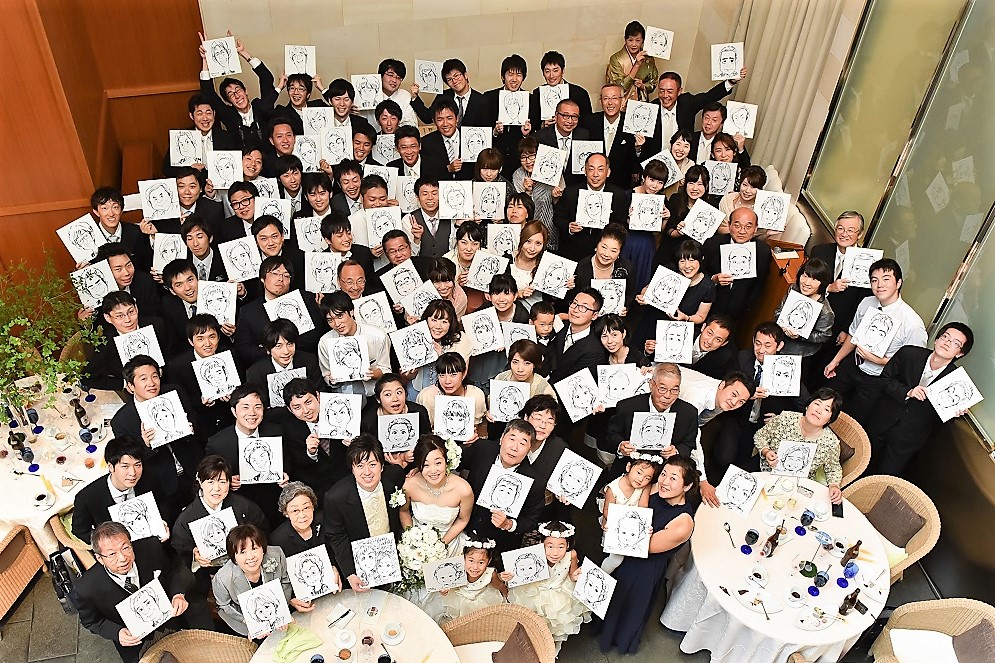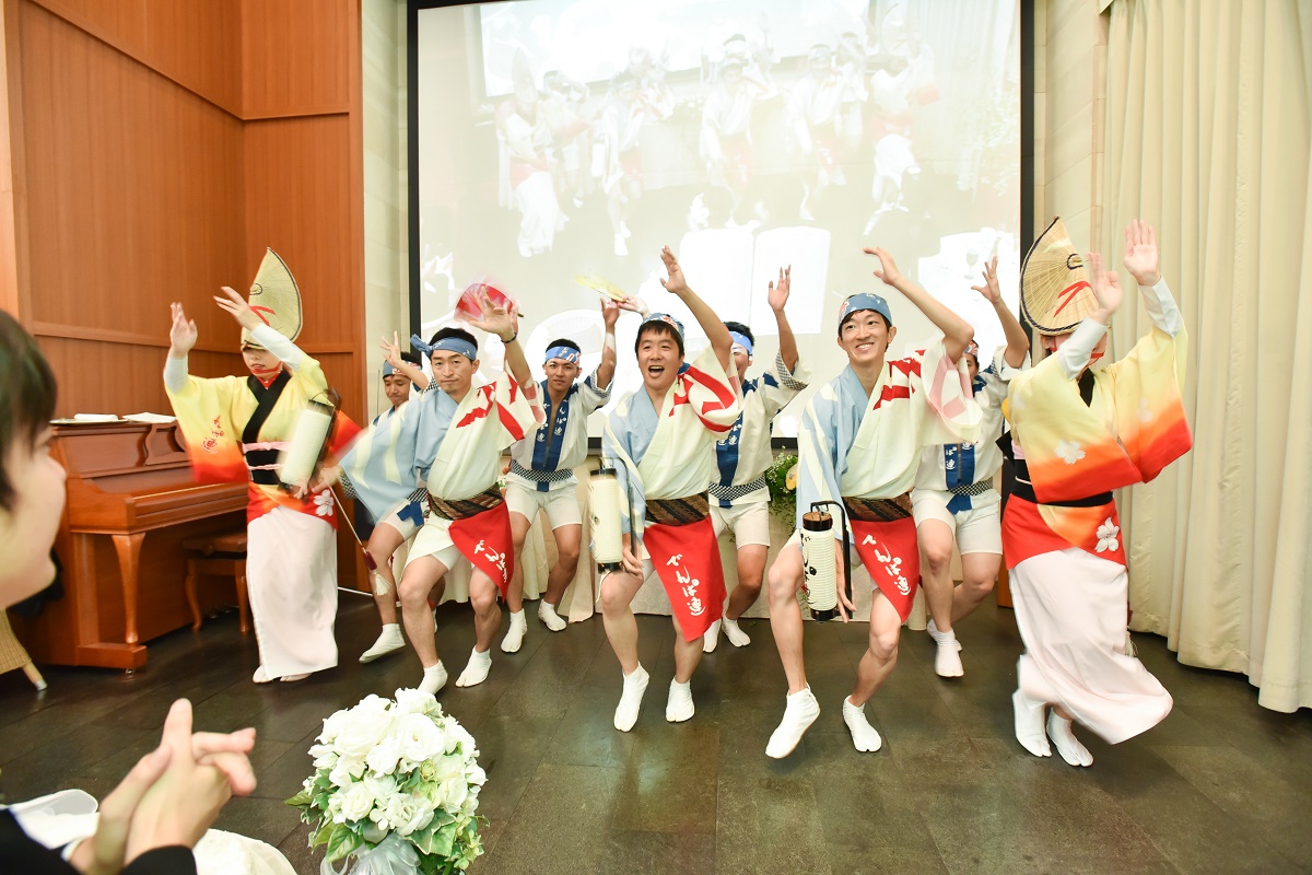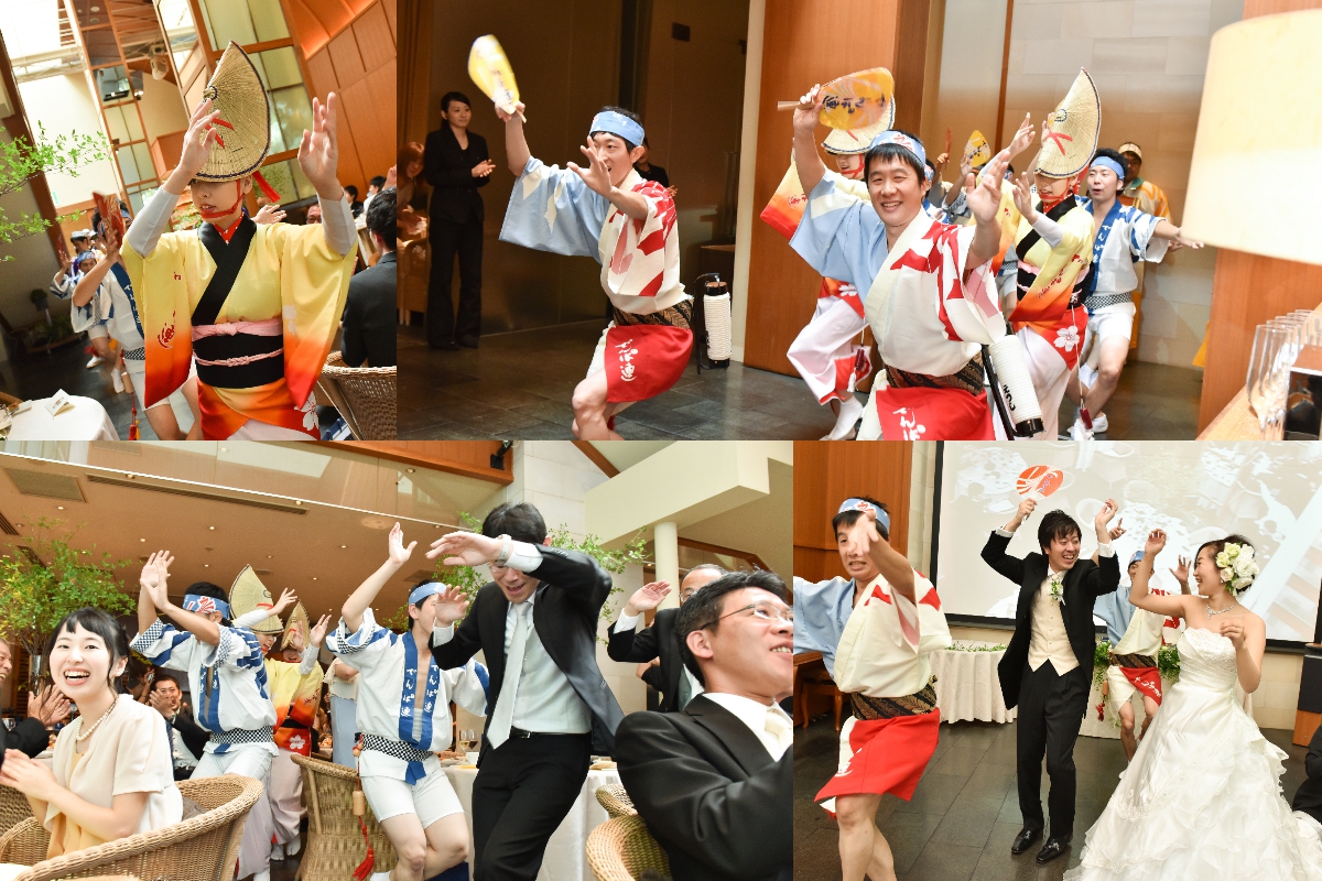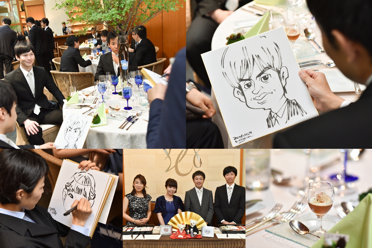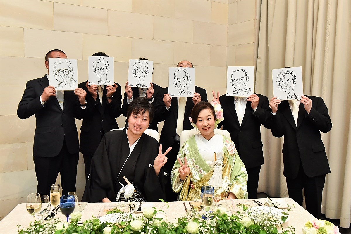 余興としては、式が始まる前に、似顔絵を描いて頂いたのと、阿波踊りをやって頂きました。