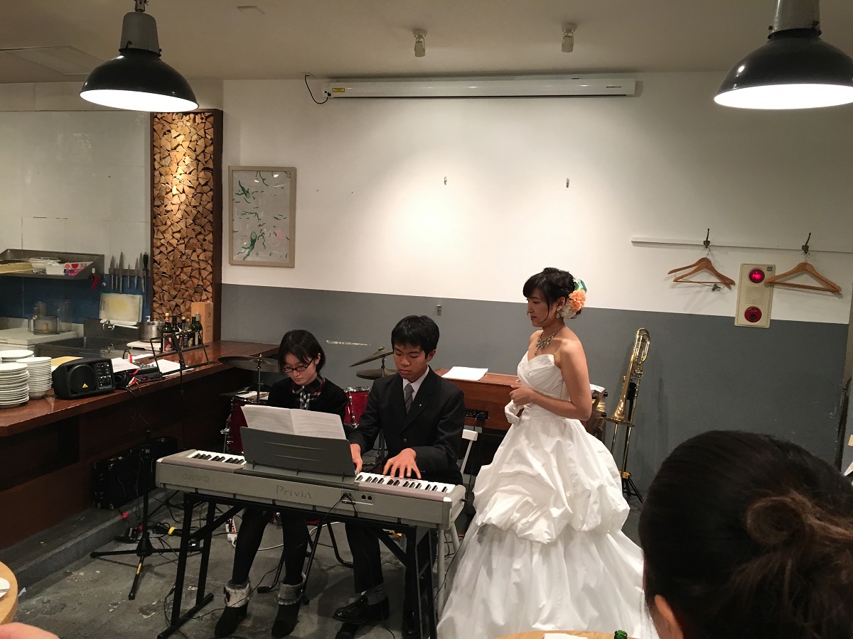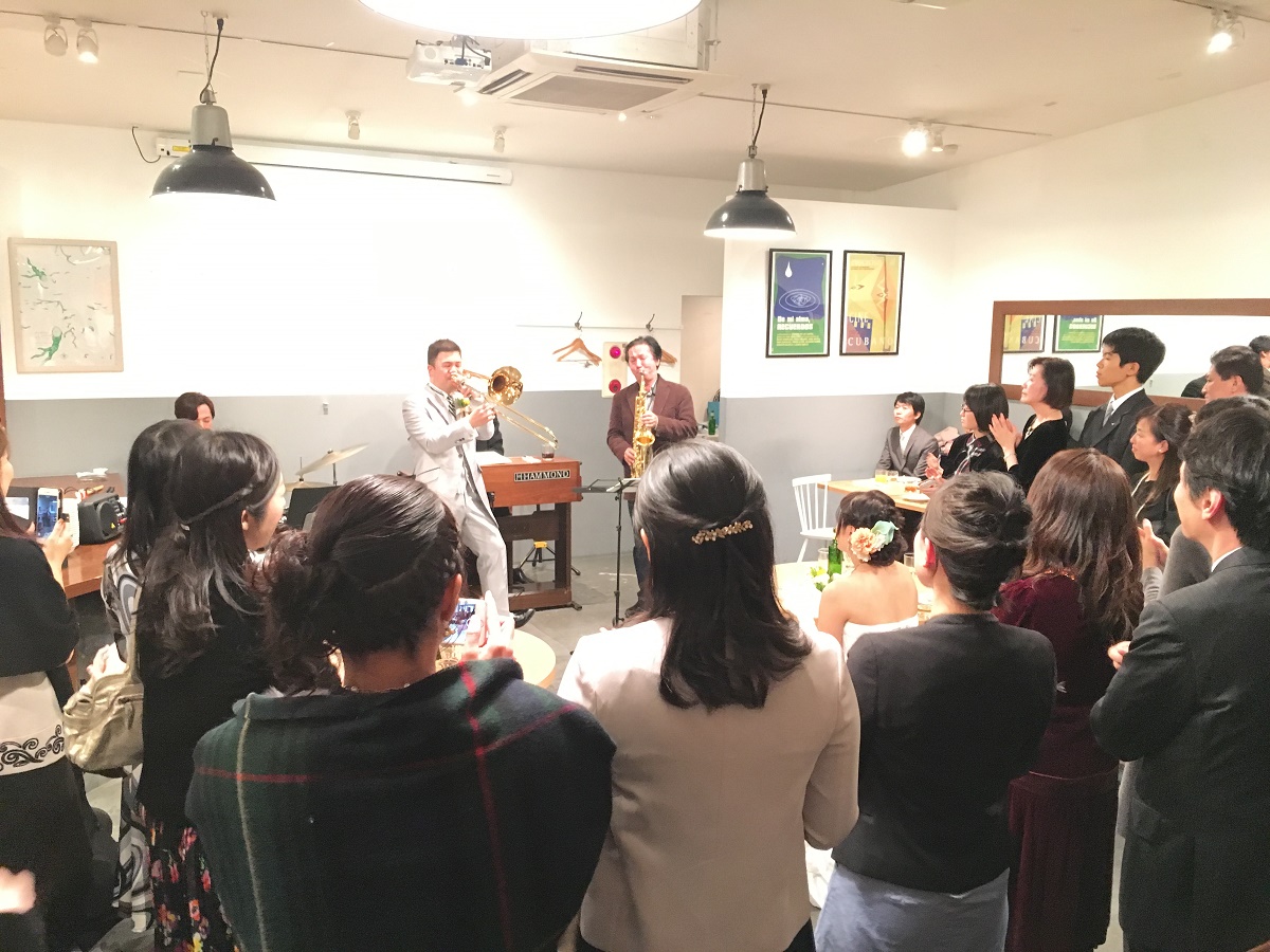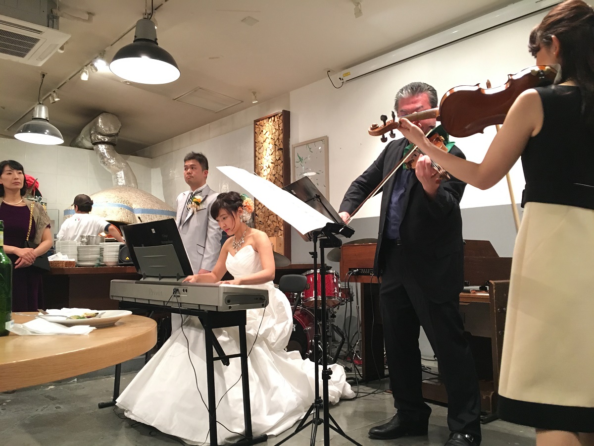 新郎新婦共に音楽関係の仕事をしているので、ゲストにも音楽家が多く、色々なジャンルの音楽を楽しんでもらい、音楽でおもてなしをしたいと思いました。セレモニーはシンプルに行い、パーティーは「音楽祭」という趣旨で、生演奏の音楽が溢れる会になるよう準備しました。当然、耳の肥えた方々が多いので、プレッシャーはありましたが、友人に多大なるご協力していただき、弦楽4重奏、ピアノ連弾、ヴァイオリン、また、ゴスペル、ジャズと幅広く、質の高い演奏を披露してくださいました。みなさん楽しんでいただいた様子で、感謝、感謝です。