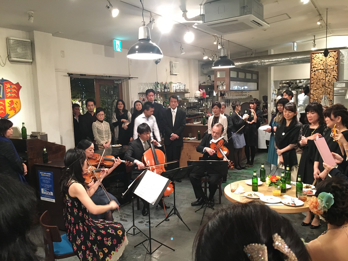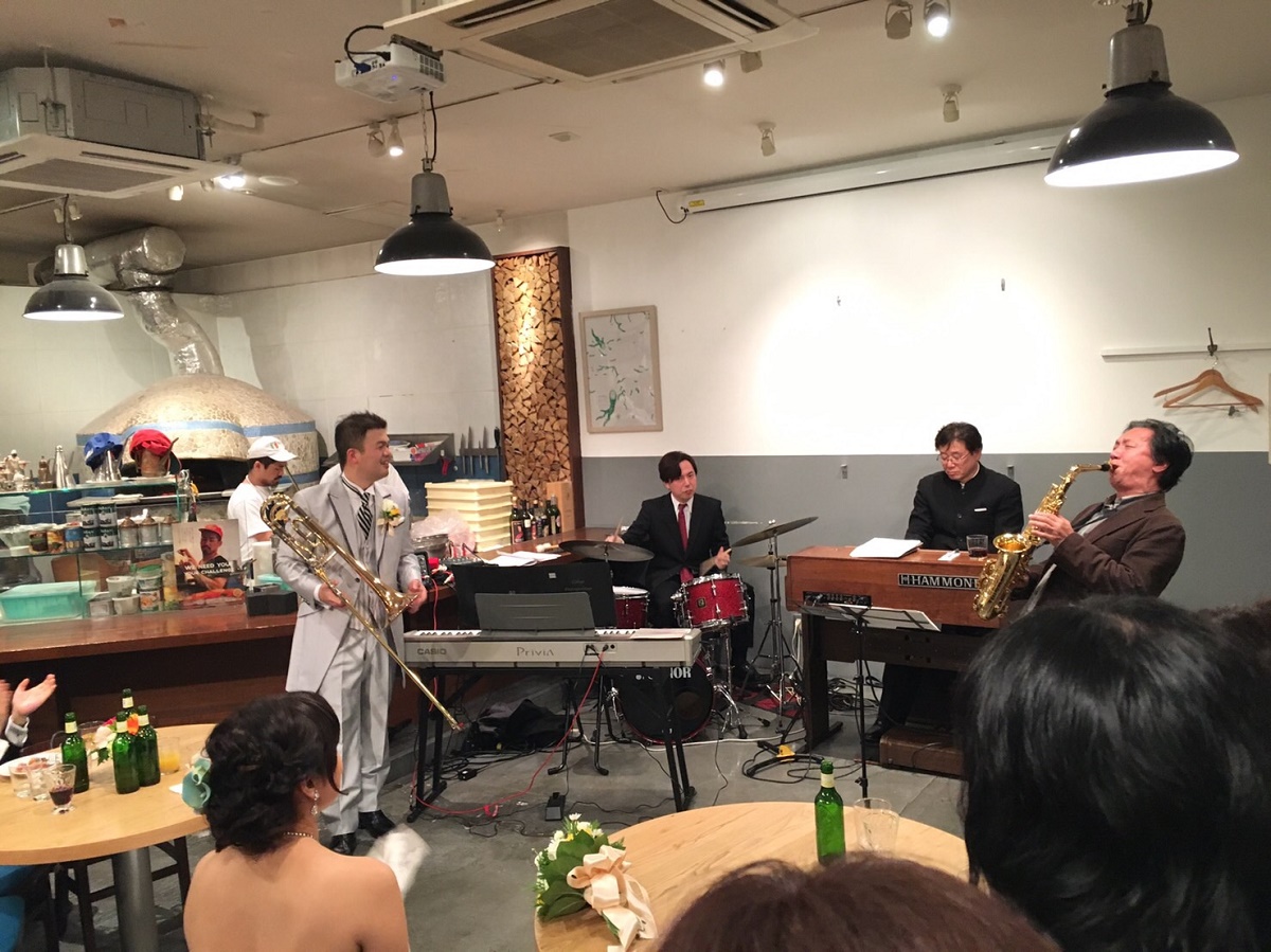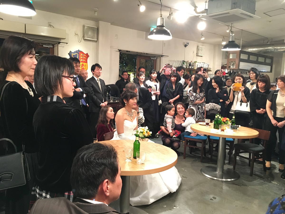 新郎新婦共に音楽関係の仕事をしているので、ゲストにも音楽家が多く、色々なジャンルの音楽を楽しんでもらい、音楽でおもてなしをしたいと思いました。セレモニーはシンプルに行い、パーティーは「音楽祭」という趣旨で、生演奏の音楽が溢れる会になるよう準備しました。当然、耳の肥えた方々が多いので、プレッシャーはありましたが、友人に多大なるご協力していただき、弦楽4重奏、ピアノ連弾、ヴァイオリン、また、ゴスペル、ジャズと幅広く、質の高い演奏を披露してくださいました。みなさん楽しんでいただいた様子で、感謝、感謝です。