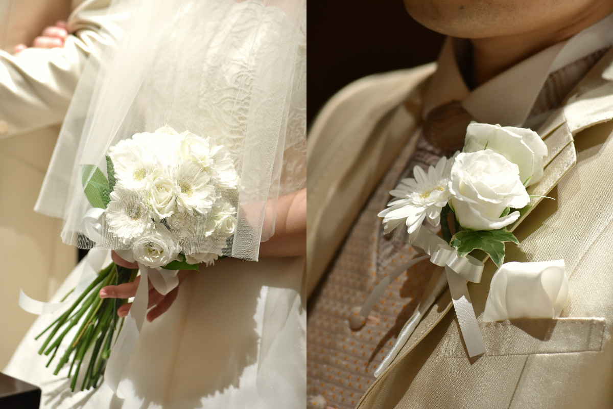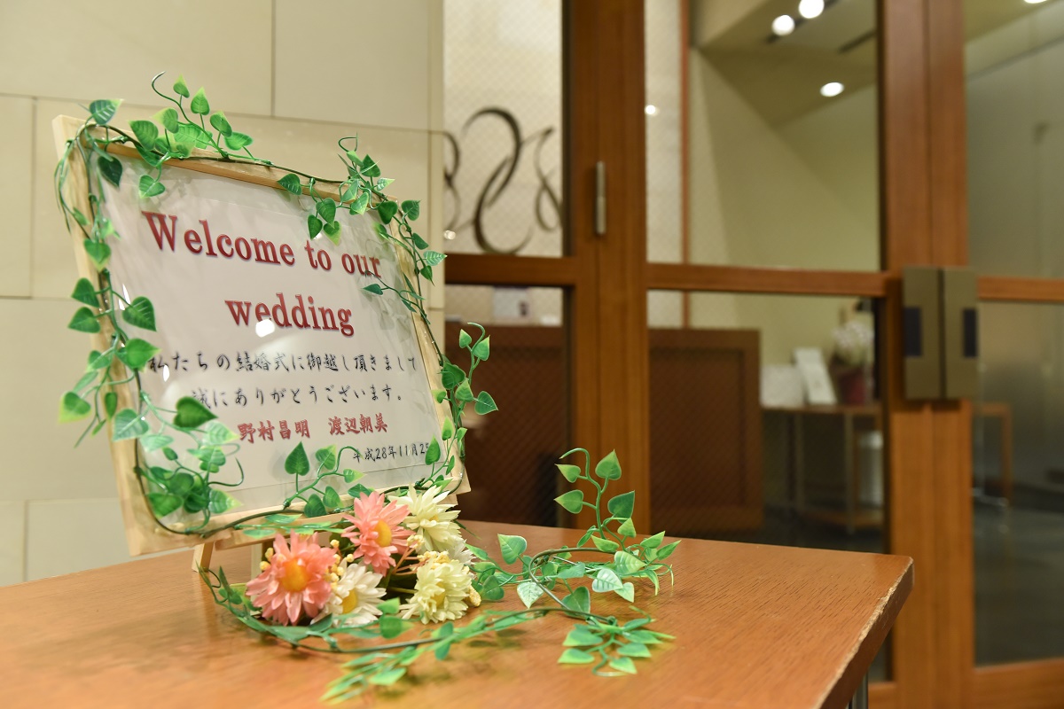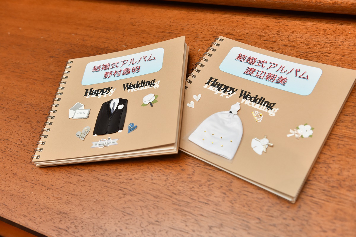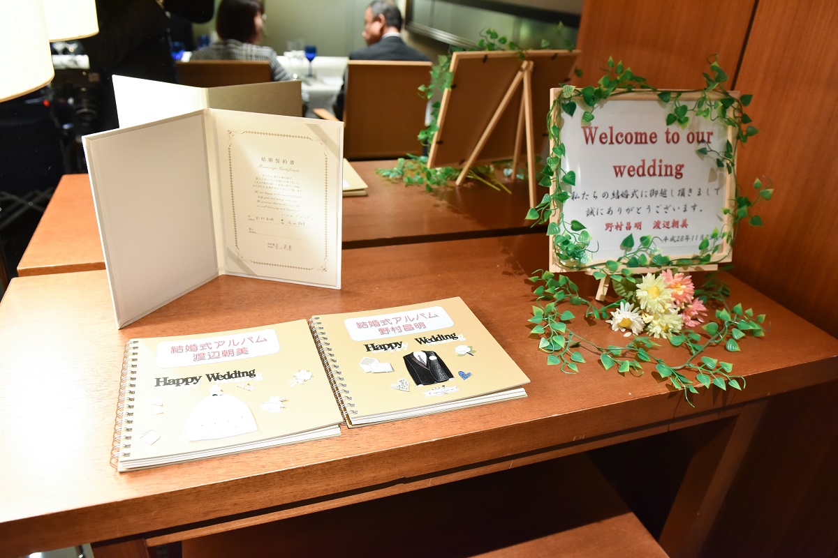 親族だけの結婚式だったので、シンプルで必要なものに絞った結婚式にしたいと思っていました。具体的にいうと、お花は両親、祖母へのプレゼント用は、どうしても欲しいので用意しました。チャペルやそれ以外の場所のお花は、少し押さえて予算を押さえ、割と過ごす時間が長い、食事のお部屋には、お花とキャンドルを用意して華やかにしました。せっかくのハレの日なので、記念になるものが欲しいと思い、プロの方に写真をお願いしてアルバムを作ってもらうこととしました。入口のウィルカムボードは、予算を抑えるためもあり二人で作り、待ち時間に、それぞれの家族親族に見てもらうために、新郎、新婦それぞれのアルバムを自分たちで作り、子供のころから、大人になるまでの写真を用意しました。派手ではないけれど、シンプルで華やかな結婚式ができたと大変満足しています。