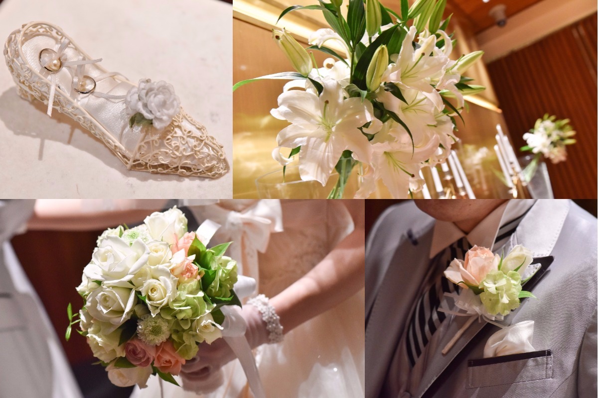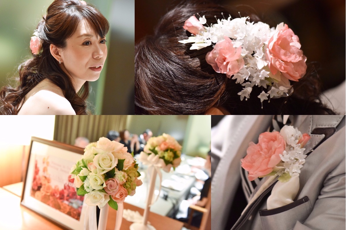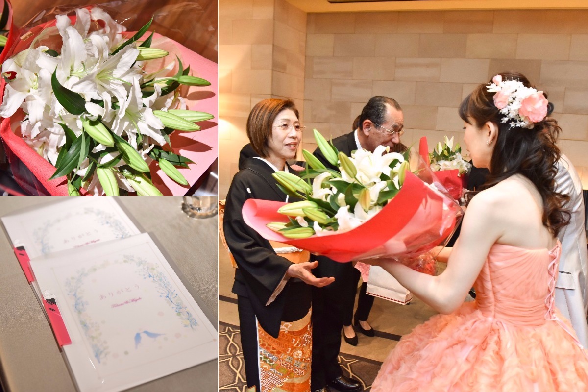 また、チャペルの祭壇の花を花束にしてもらい、用意しておいた引き菓子と一緒に食事会の終わりに家族に渡すことで、感謝の気持ちを伝えました。