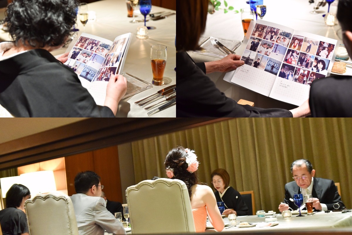なるべく両家の家族でたくさん話をしてもらいたかったのでイベントは特に行いませんでしたが、その代わりに2人の成長が分かる写真や、家族で出かけた時の写真などを用意し、お互いの家族のことを少しでも知ることが出来るようなアルバムを作成しました。