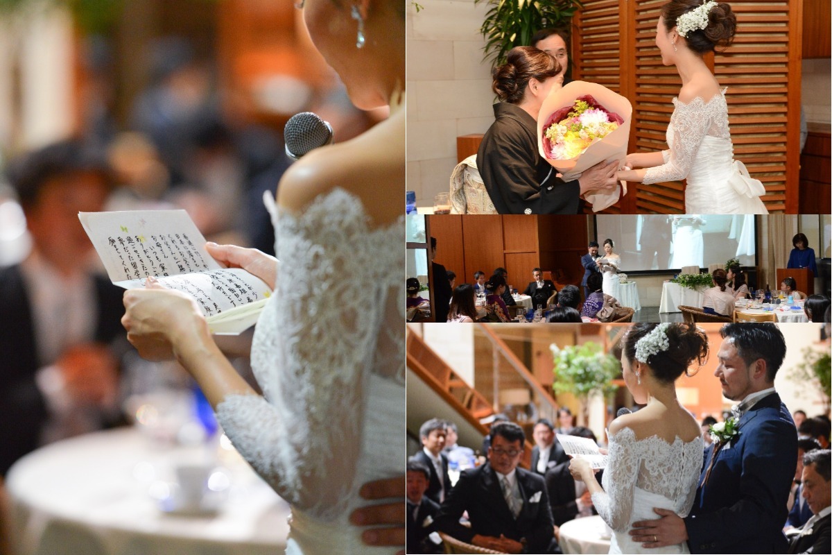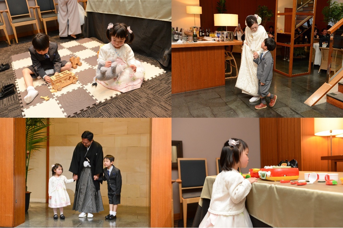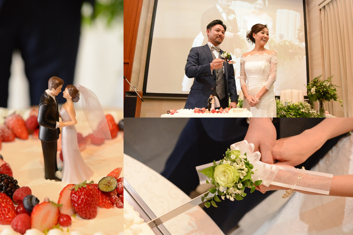 和装で入場し、お色直しの退場の時は新郎新婦それぞれの甥っ子と姪っ子と退場し、再入場は二人で洋装で階段から降りてきました。その後は新郎新婦の同僚より、それぞれビデオメッセージの余興をやっていただきました。その後ケーキ入刀やゲストとの写真撮影をやりました。写真撮影は各テーブルを新郎新婦が回る時間も設けたため、ゲストとお話がたくさんできたのでとても良かったと思います。最後は新郎からのスピーチと新婦からの両親への手紙を読みました。あまりフォーマルになりすきないようゲストがカジュアルな雰囲気で楽しんでいただけるようにしました。