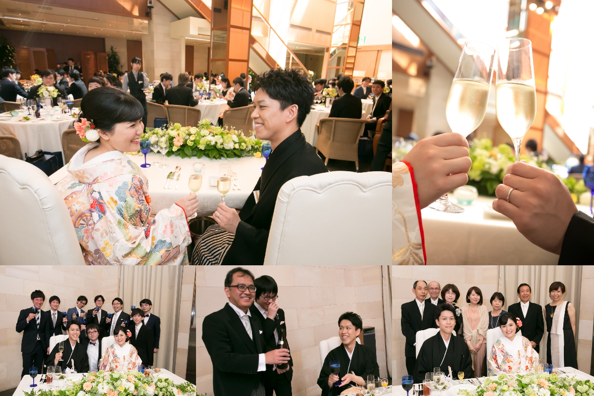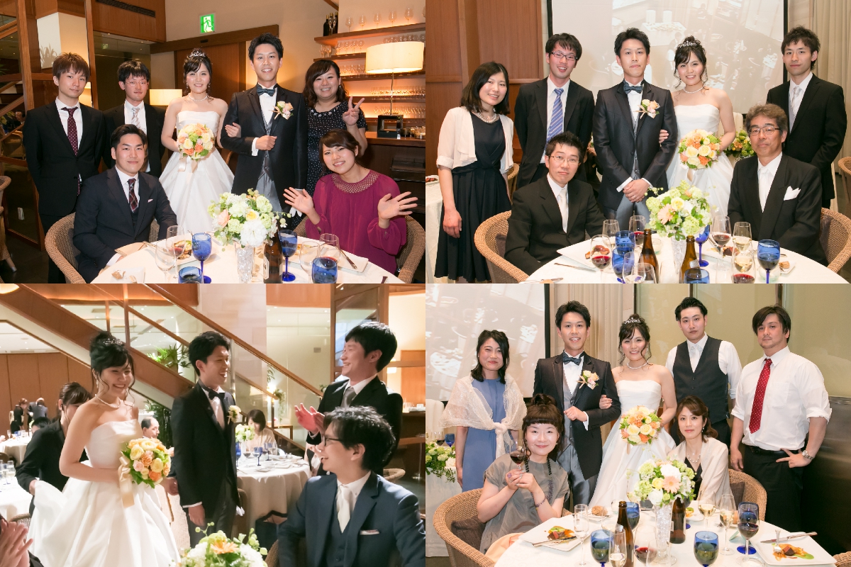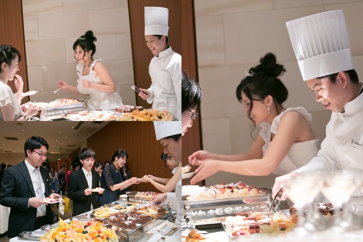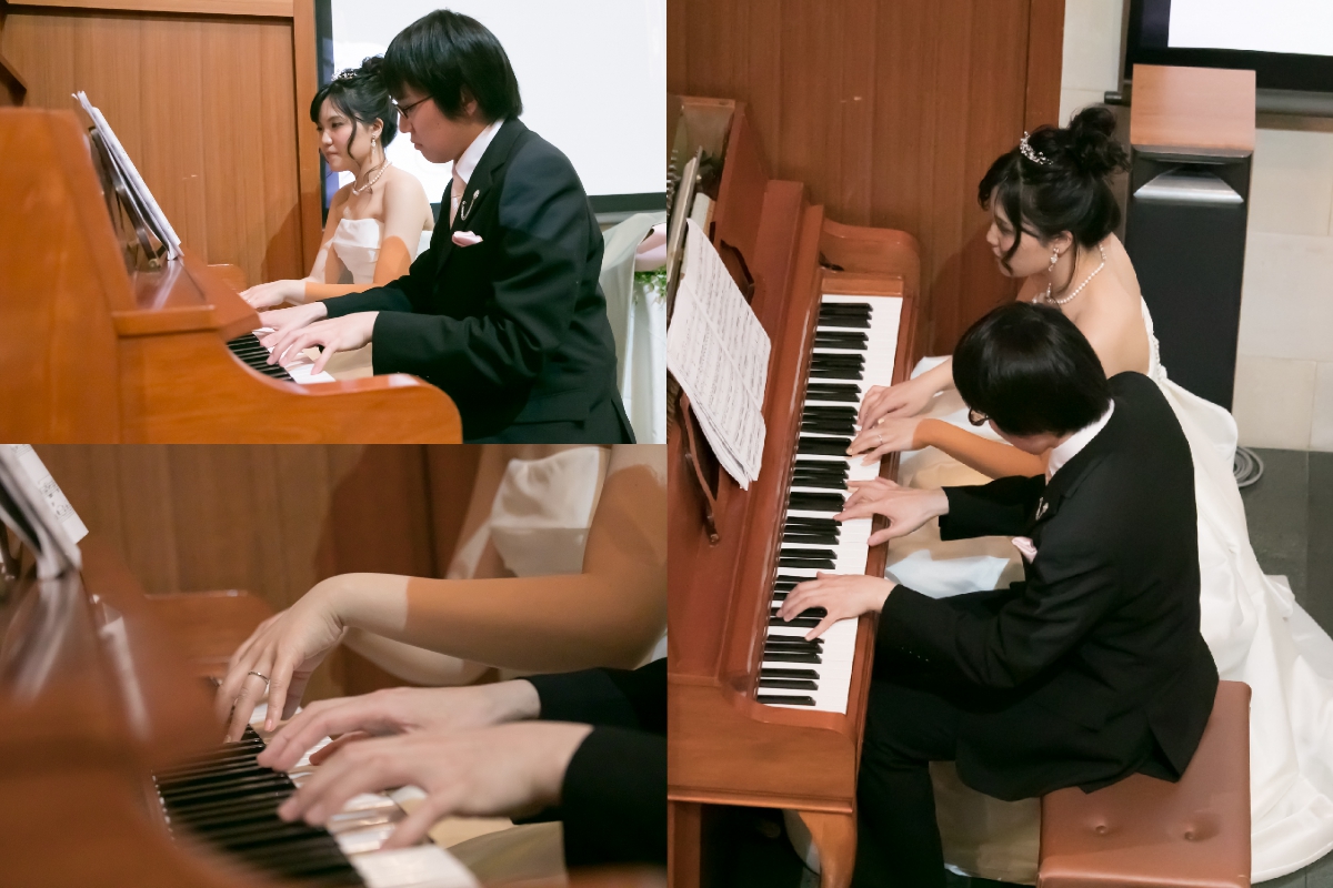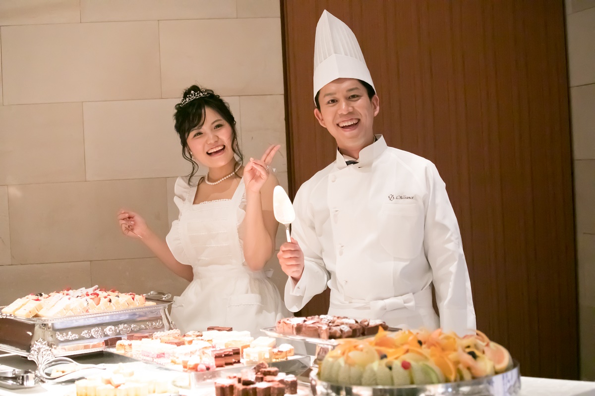 ゲストの皆さまに美味しい食事をゆったりと楽しんでいただくことをコンセプトとして披露宴の演出を考えました。始めは利き酒大会をしようと計画していましたが、兄とのピアノ連弾の余興も予定していたため時間的に余裕がなく、利き酒大会は断念しました。その代わりとして、プランナーの西田さんから提案頂き「デザートビュッフェの際にコックとエプロン姿に着替えて皆さまにサーブする演出」を行いました。ゲストの方にもかなり好評で、レストランならではの素敵な演出ができたと感じています。コックの衣装は実際にレストランで使用しているものと同じで本格的であり、エプロンも後ろから見た時に肩のフリルが羽のように見えてとても可愛かったです(笑)兄とのピアノの連弾も行いましたが、天井が高く、程よい奥行のため、生音でも十分でした。パーティー終盤での演奏だったためドキドキしましたが、とても気持ち良く演奏することができました。