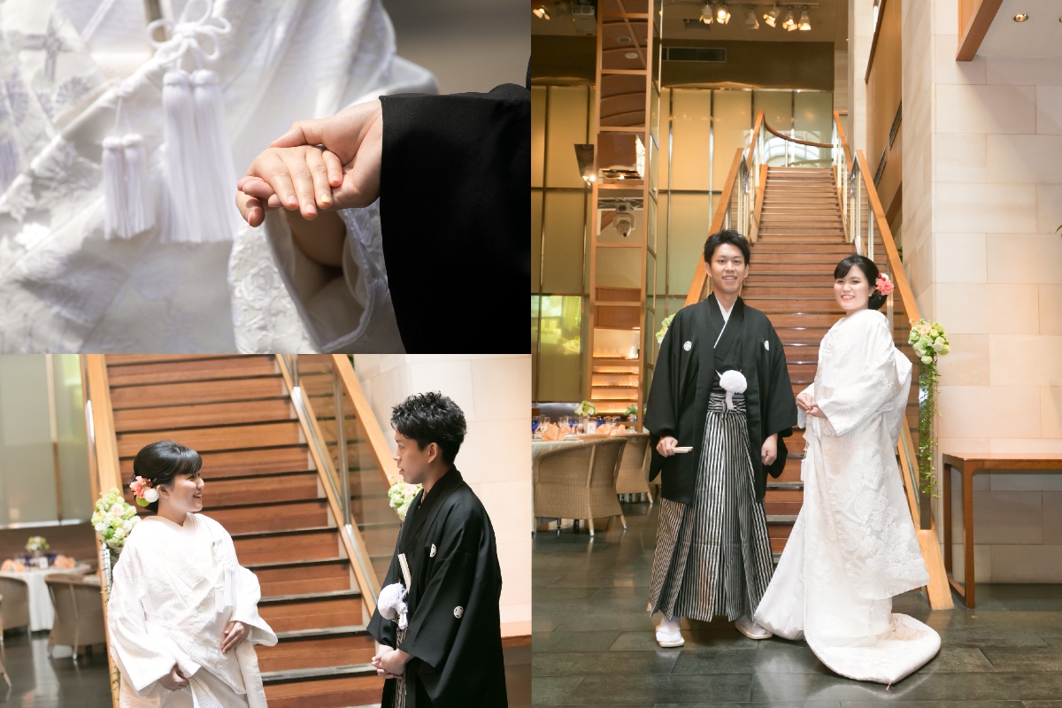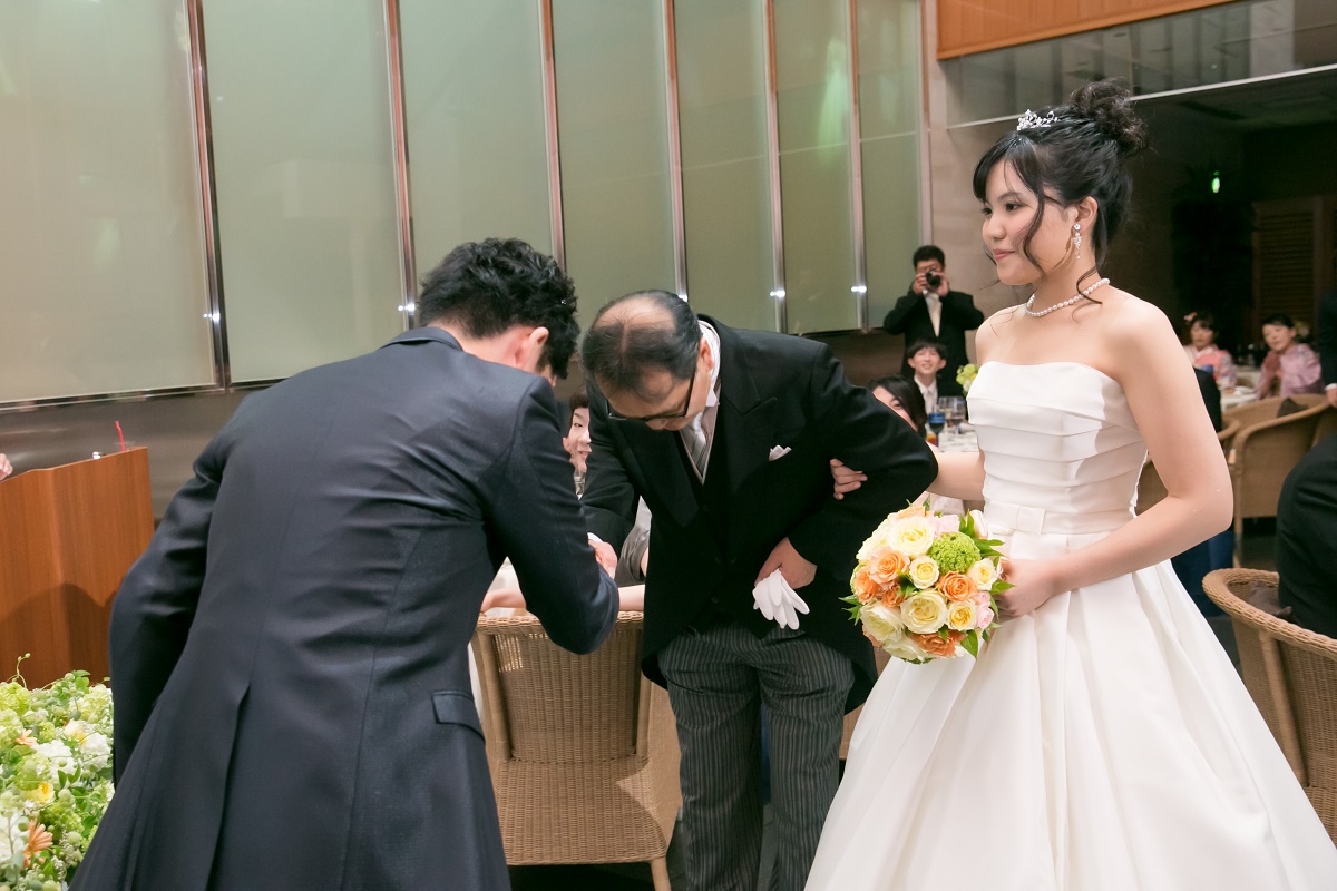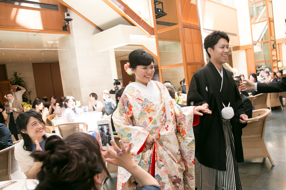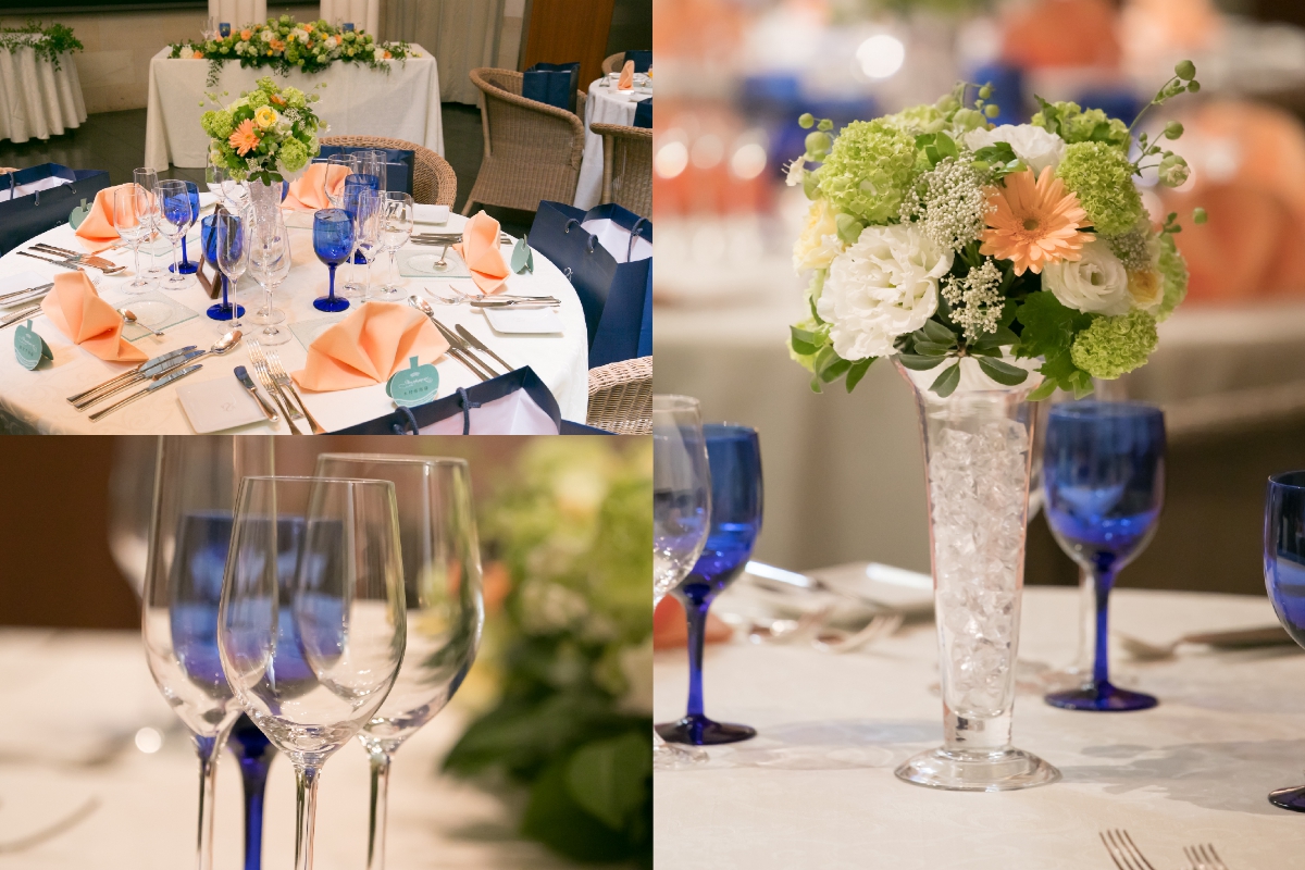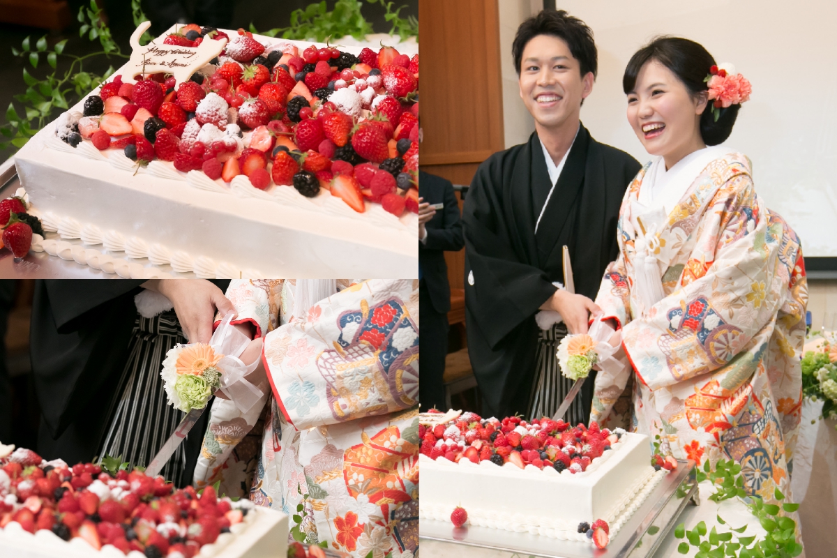 ゲストの皆さまに美味しい食事をゆったりと楽しんでいただくことをコンセプトとして披露宴の演出を考えました。始めは利き酒大会をしようと計画していましたが、兄とのピアノ連弾の余興も予定していたため時間的に余裕がなく、利き酒大会は断念しました。その代わりとして、プランナーの西田さんから提案頂き「デザートビュッフェの際にコックとエプロン姿に着替えて皆さまにサーブする演出」を行いました。ゲストの方にもかなり好評で、レストランならではの素敵な演出ができたと感じています。コックの衣装は実際にレストランで使用しているものと同じで本格的であり、エプロンも後ろから見た時に肩のフリルが羽のように見えてとても可愛かったです(笑)兄とのピアノの連弾も行いましたが、天井が高く、程よい奥行のため、生音でも十分でした。パーティー終盤での演奏だったためドキドキしましたが、とても気持ち良く演奏することができました。