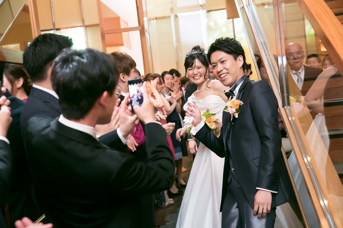 お料理、ワインにとてもこだわりがあり、美味しい料理でゲストの皆さまをおもてなししたい!記憶に残るような食事にしたい!との考えから、「ここなら叶えられるかも」と思いました。また、会場の雰囲気も一目で気に入りました。入り口は小さいけれどそこからの長いエスカレーター、ここからどんな素敵な場所に行けるのだろうとワクワクしました。そしてその先には15メートルもある高い天井、吹き抜けの天井もあり、とても開放的でおしゃれな空間が広がっていました。直観でラリアンスさん以上の会場はないなと思い、すぐに決めさせていただきました。