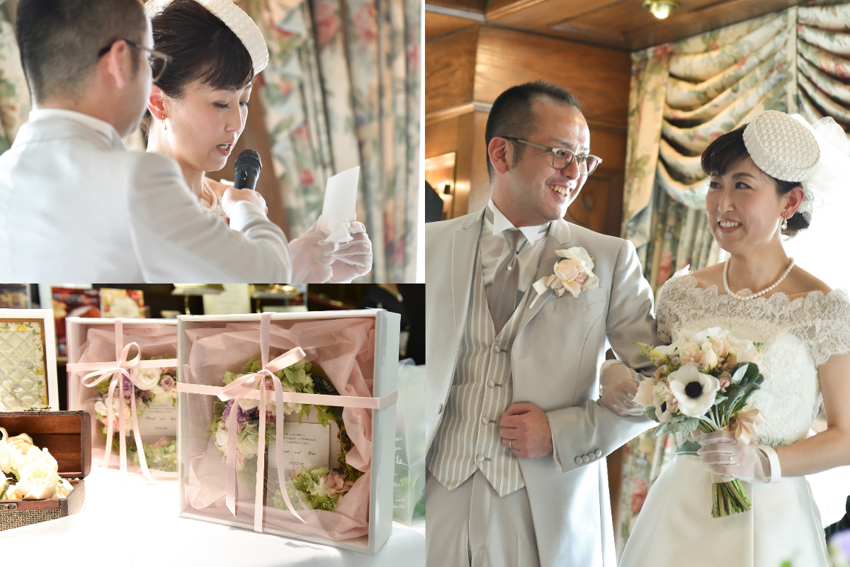 テーマとしては堅苦しい式にしたくありませんでした。そのため、歓談の時間を出来る限り長くし、ゲストの方々と触れ合う時間を極力多くすることを考えました。また、披露宴会場がクラシカルな雰囲気で茶系のイメージが強かったため、可能な限り装花は緑を多く取り入れてもらい、バランスを取りました。そして、ペーパーアイテムは自分たちで作成し、音楽は我々が好きなものを多く取り入れ、オリジナリティーな要素を前面に出しながら、そこからもゲストと話せるネタを広げることができるよう努力しました。
