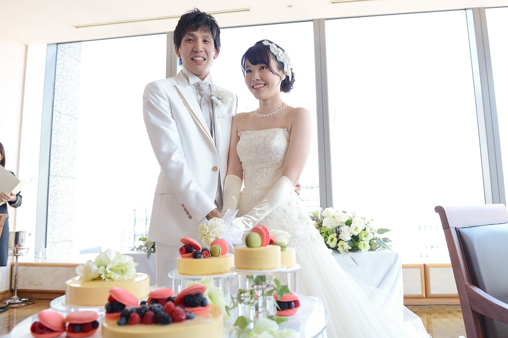 最後にウェディングケーキですが、こちらもデルポンテさんのオリジナルのマカロンケーキでお願いをしました。こちらのケーキ、味ももちろんですが、マカロンがのっていて本当に可愛いので、お勧めです!!