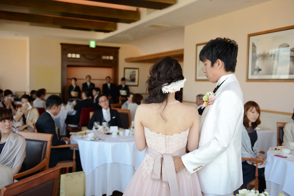 披露宴では、ケーキカット・お色直し・テーブルラウンドなど本当に自分たちがしたい演出のみを行いました。テーブルラウンドを入れたことで、ゲスト全員の席をまわることができ、よかったと思っています。
