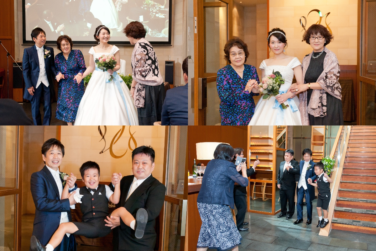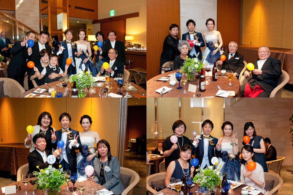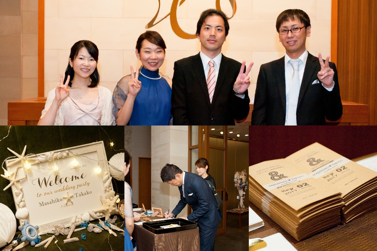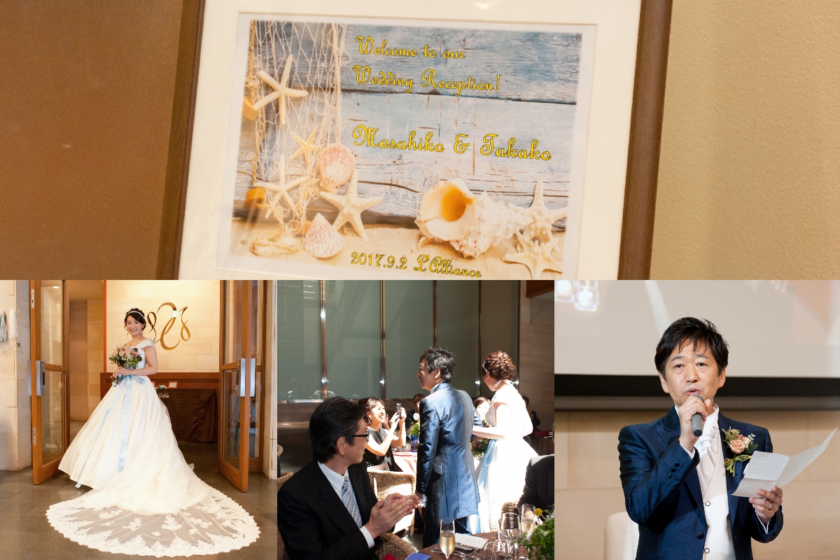 海・山・自然をテーマに全員がまったり楽しく幸せな気分になる事を望んで結婚式にあたりました。余興はオープンキッチン・ケーキカット(サードバイトまで)中座1回ずつ・プロフィール上映・リングボーイとフラワーガールのプレゼント・テーブルラウンド・ラウンジスパークバルーンでのプレゼント・デザートビュッフェ・全員集合写真・ライブエンドロール上映くらいでも忙しくて客観的に見れずに終わった感じでしたが、何年振りかで会った親戚・友人達、後輩や同級生達が2グループに分かれて勝手に2次会をやって余韻を楽しんでた事、家出してた親子が27年振りに実家に行き一晩共に過ごす事が出来た事、従姉の姉妹同士が数年振りに話をしていた事、私も胃癌で4月3日入院4月4日手術で長引いて5月28日退院の状態からの結婚式の準備で妻にとても助けられた事、色々なエピソードが有った中で全員が楽しくとても良い結婚式だったと言ってくれました。
