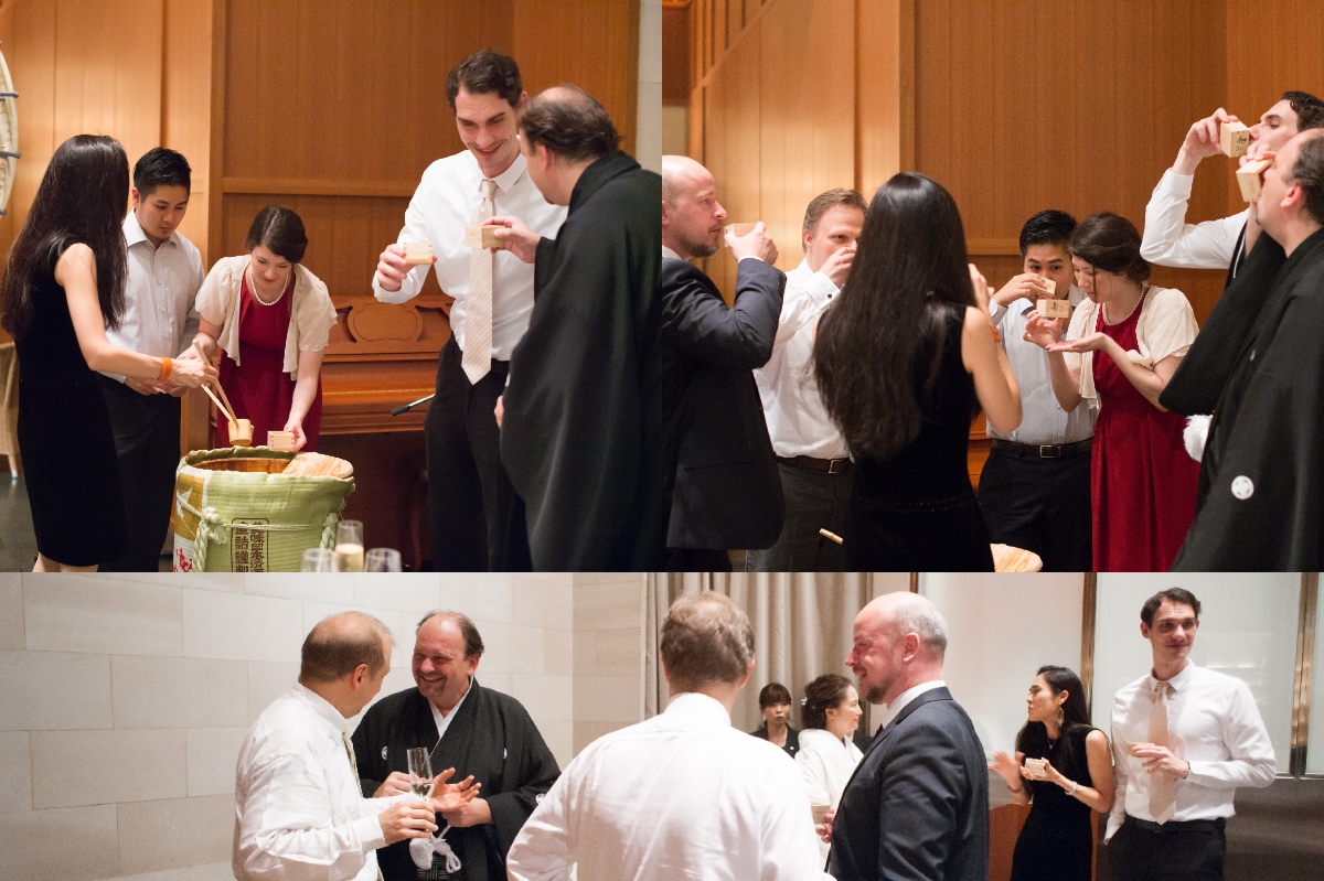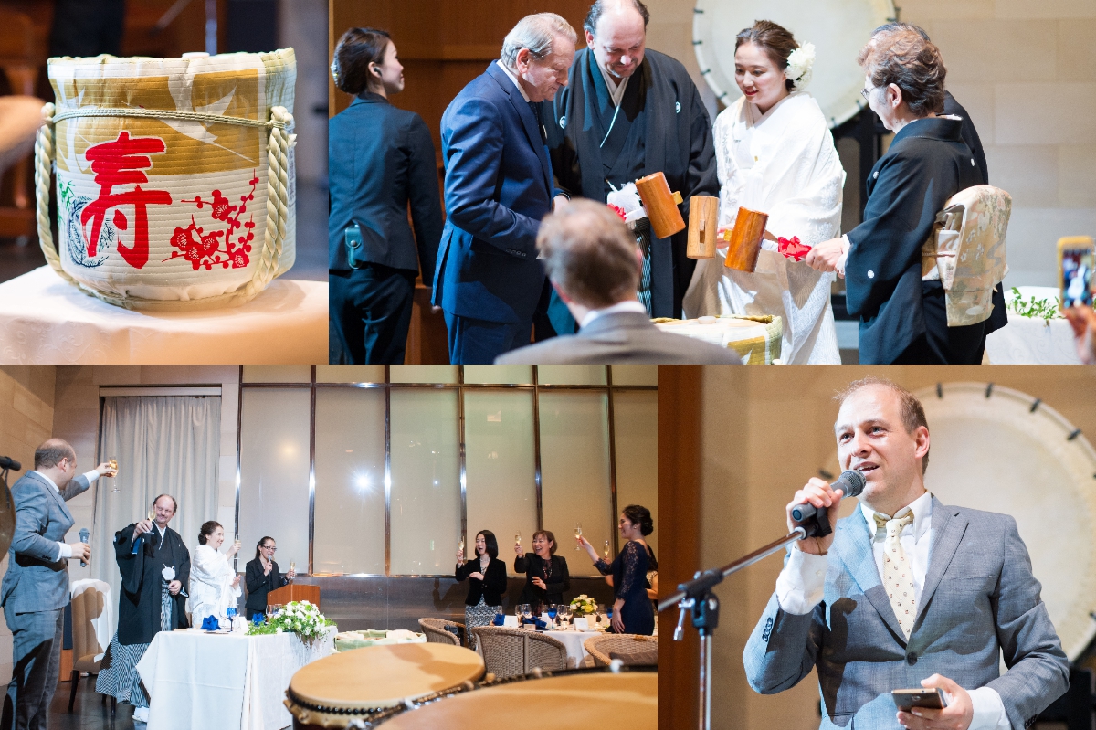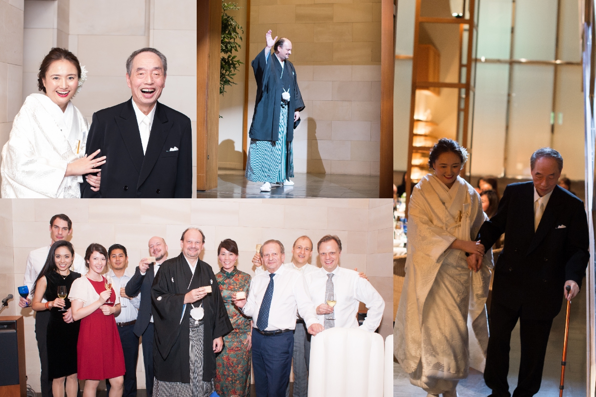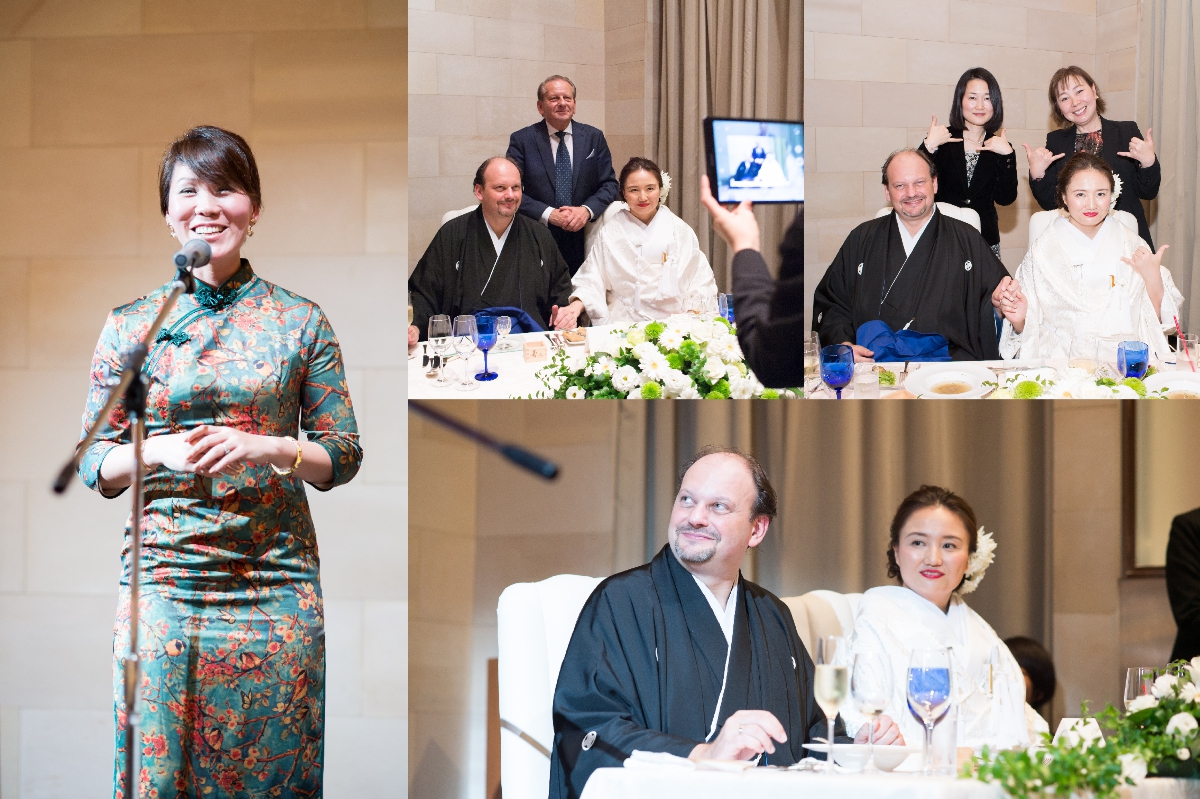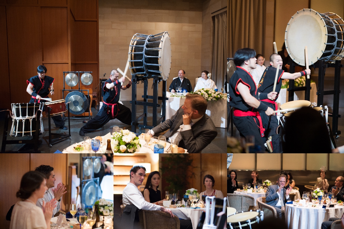 友人の和太鼓演奏者を招いて、和装での入場時と祝辞として打って貰いました。和太鼓演奏は、日本の文化代表!的な印象があり好きな方も多いと思うのですが、反面、何しろ音が大きい物ですから都内の殆どの会場でNGだと思います。その点、ラリアンスさんは1軒丸々レストランですので、近隣に騒音の心配が無いとの事で快諾してくださいました。和太鼓の生演奏は日本人ゲストは元より、外国人ゲストに大好評。みんな、生演奏を楽しむというよりビデオ、写真を撮るのに大忙し!こんなに間近で何か演奏を感じる事が出来るチャンスはそう無いですもんね。きっと母国に帰ってから、今日の事を来日が叶わなかった家族、親戚、友人にシェアしてくれるんだろうな~と感じた時、2つの国のかけ橋の一員に慣れて自分の夢が一つ叶った瞬間でもありました。