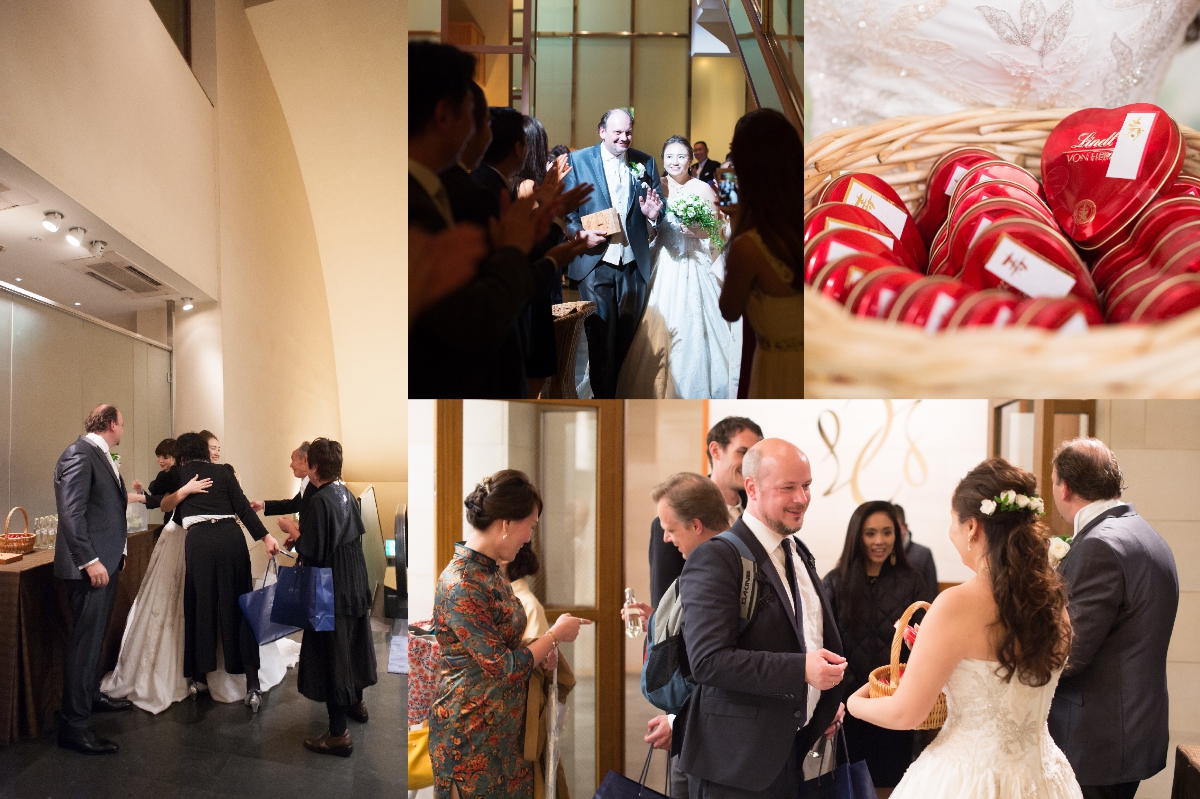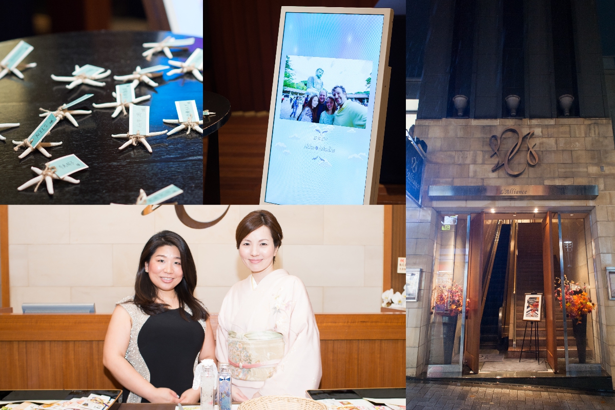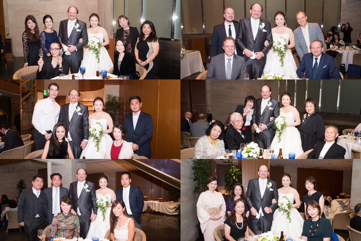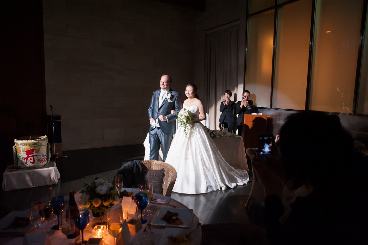 友人の和太鼓演奏者を招いて、和装での入場時と祝辞として打って貰いました。和太鼓演奏は、日本の文化代表!的な印象があり好きな方も多いと思うのですが、反面、何しろ音が大きい物ですから都内の殆どの会場でNGだと思います。その点、ラリアンスさんは1軒丸々レストランですので、近隣に騒音の心配が無いとの事で快諾してくださいました。和太鼓の生演奏は日本人ゲストは元より、外国人ゲストに大好評。みんな、生演奏を楽しむというよりビデオ、写真を撮るのに大忙し!こんなに間近で何か演奏を感じる事が出来るチャンスはそう無いですもんね。きっと母国に帰ってから、今日の事を来日が叶わなかった家族、親戚、友人にシェアしてくれるんだろうな~と感じた時、2つの国のかけ橋の一員に慣れて自分の夢が一つ叶った瞬間でもありました。
