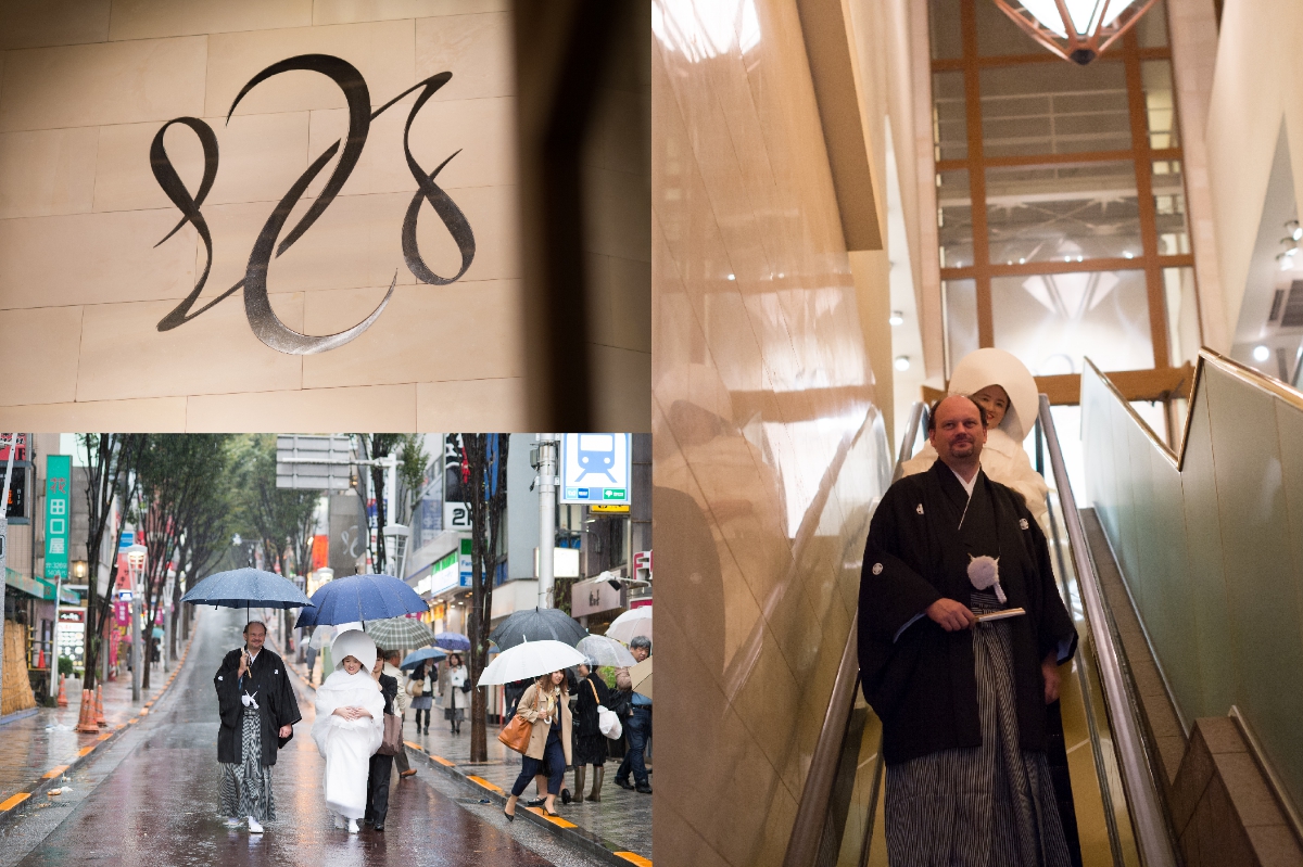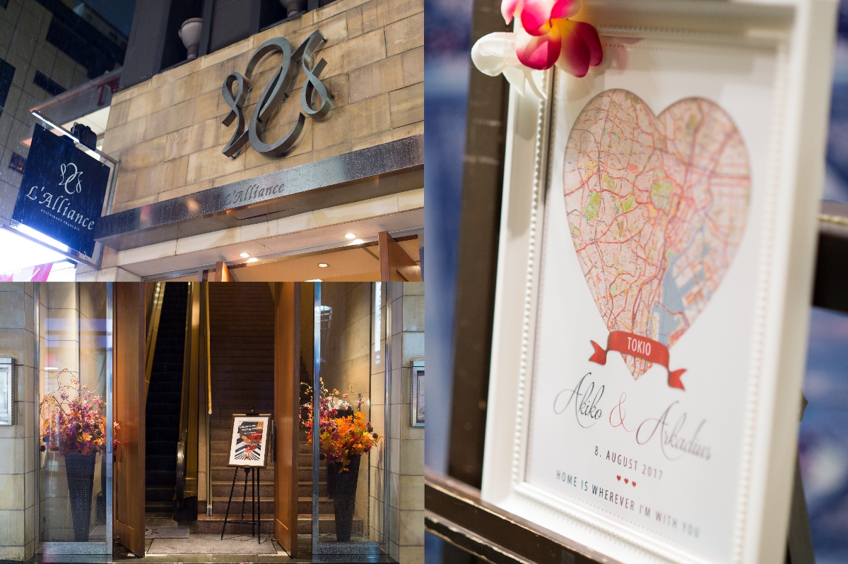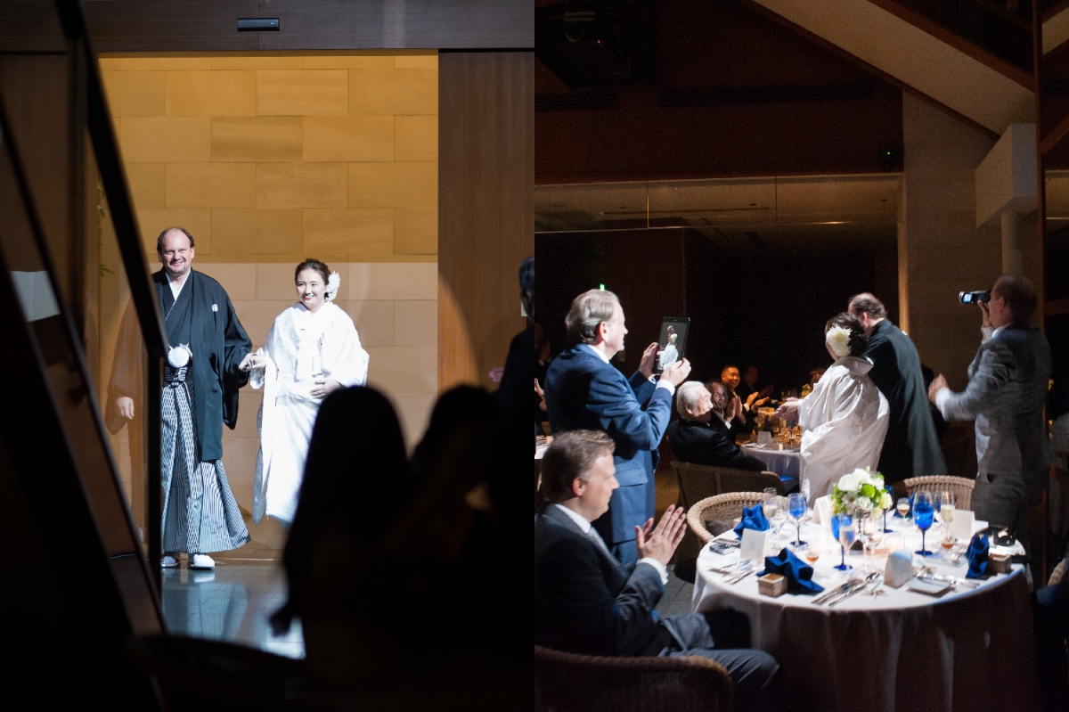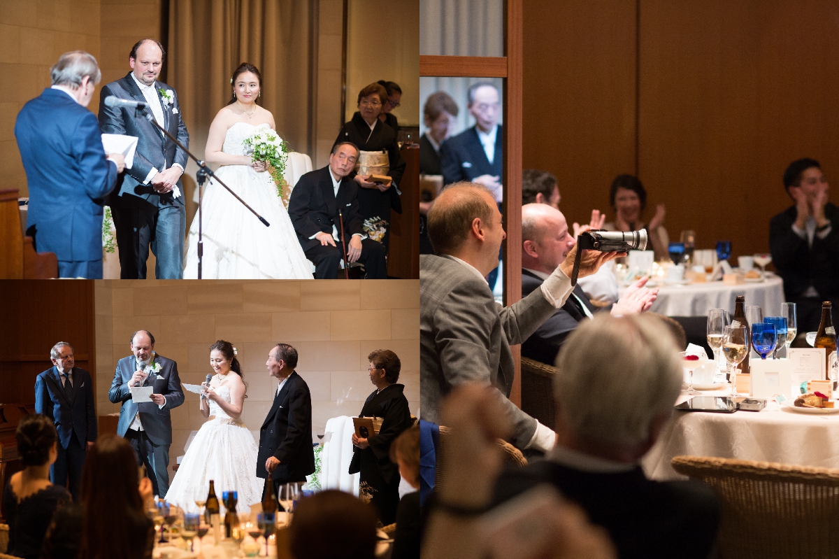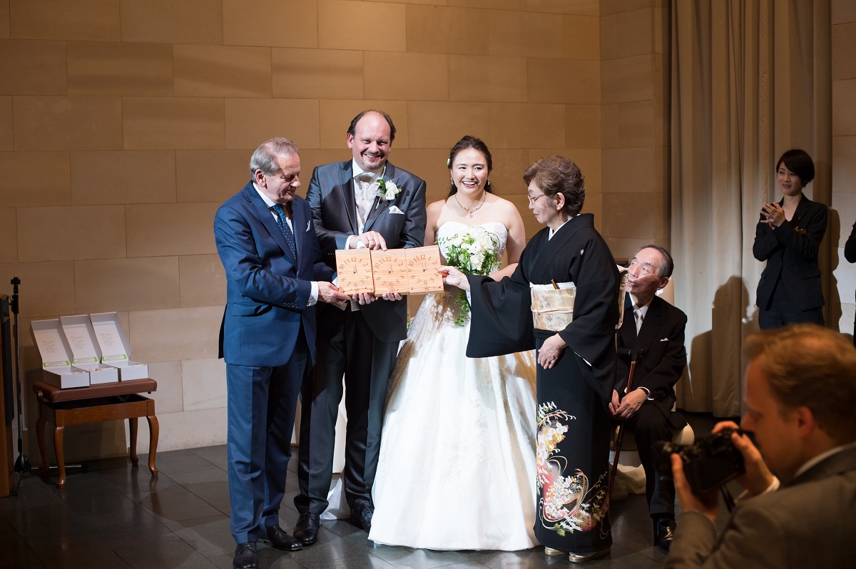 友人の和太鼓演奏者を招いて、和装での入場時と祝辞として打って貰いました。和太鼓演奏は、日本の文化代表!的な印象があり好きな方も多いと思うのですが、反面、何しろ音が大きい物ですから都内の殆どの会場でNGだと思います。その点、ラリアンスさんは1軒丸々レストランですので、近隣に騒音の心配が無いとの事で快諾してくださいました。和太鼓の生演奏は日本人ゲストは元より、外国人ゲストに大好評。みんな、生演奏を楽しむというよりビデオ、写真を撮るのに大忙し!こんなに間近で何か演奏を感じる事が出来るチャンスはそう無いですもんね。きっと母国に帰ってから、今日の事を来日が叶わなかった家族、親戚、友人にシェアしてくれるんだろうな~と感じた時、2つの国のかけ橋の一員に慣れて自分の夢が一つ叶った瞬間でもありました。
