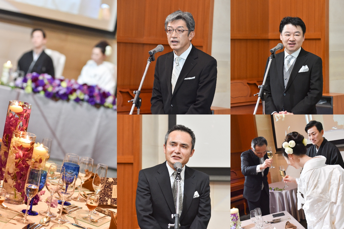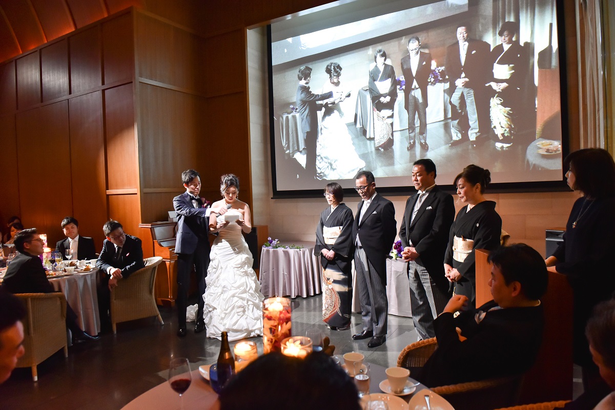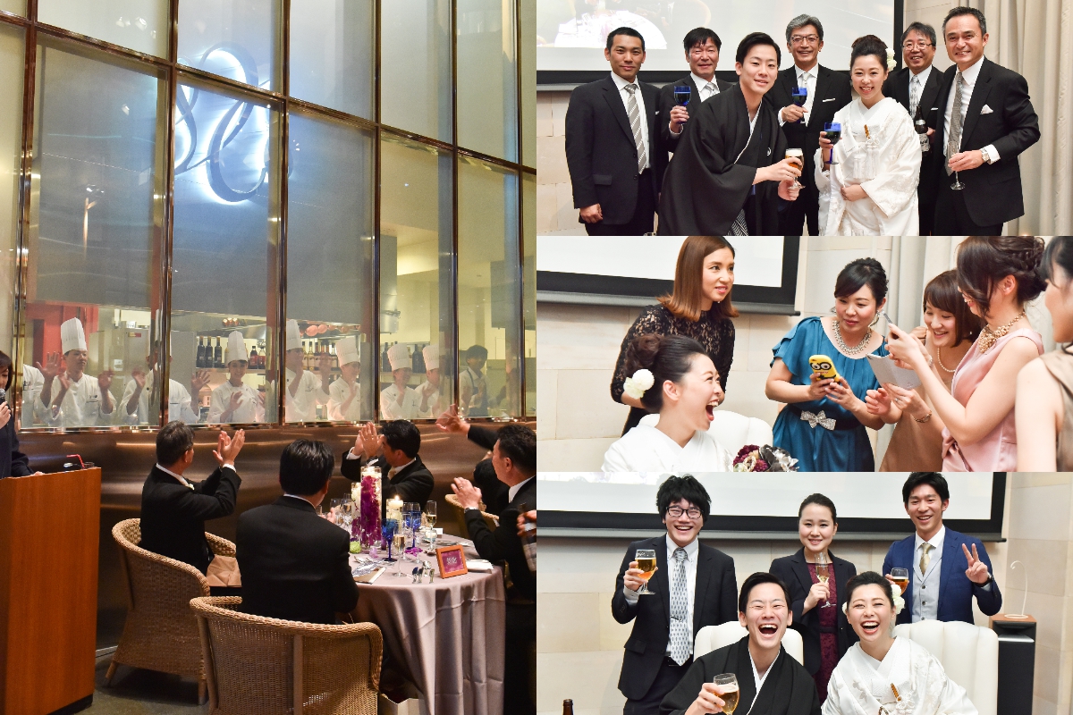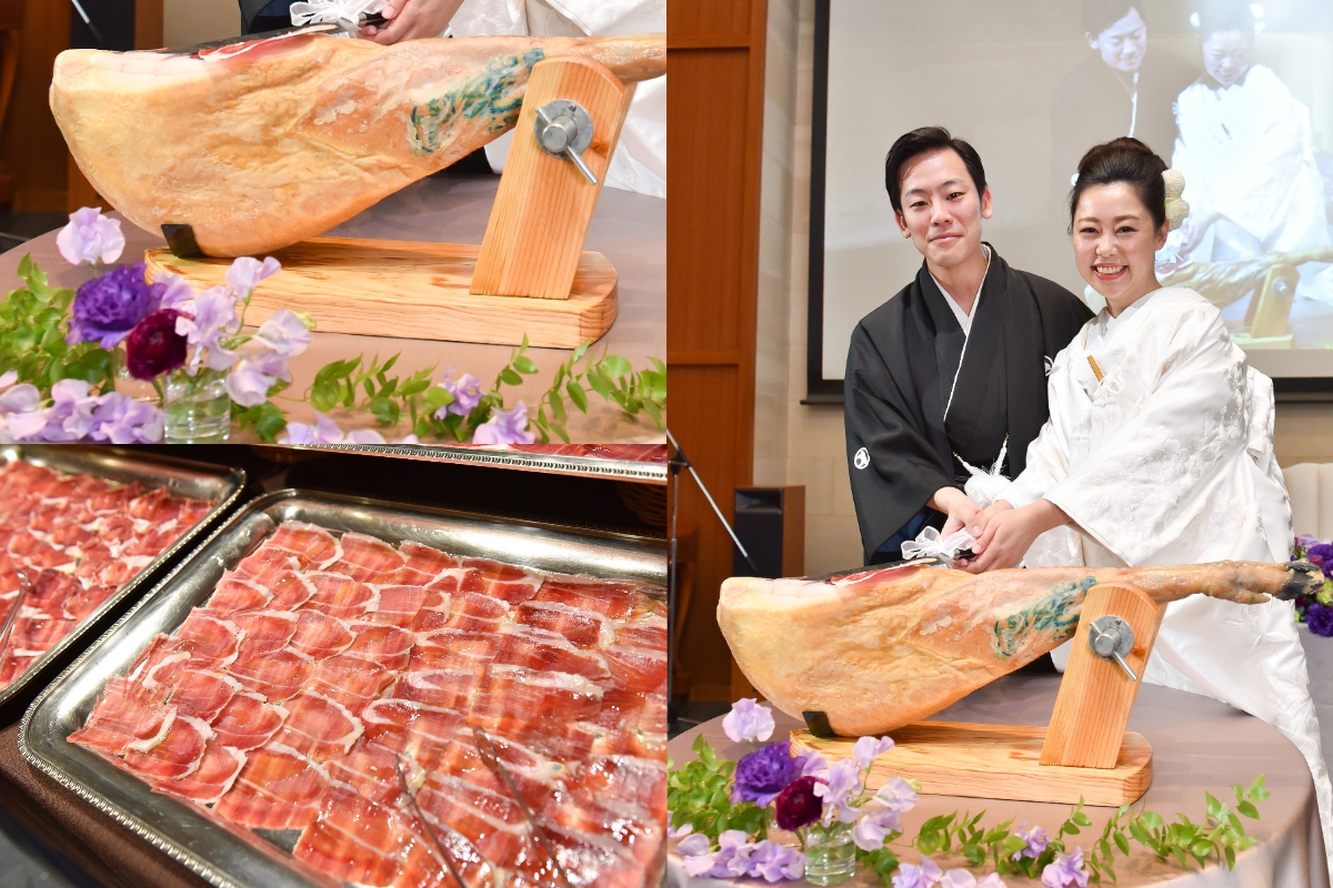 とにかく参加いただく方々にお食事とお酒を楽しんでいただきたいというのが二人の気持ちでした。①メニューは【ゲストが選ぶ♪】グルマンコースで式前からワクワクした気持ちになってもらう!!②ケーキ入刀ではなく生ハム入刀で!!(みなさん初めての経験だとおっしゃっていました)③チーズブッフェだけでなく、2人に縁のある福岡(おまおう)・埼玉(狭山茶)を使用した小菓子を用意(しょっぱいもの甘いもの両方召し上がりたい方が絶対いるはずだと思い用意をしました)