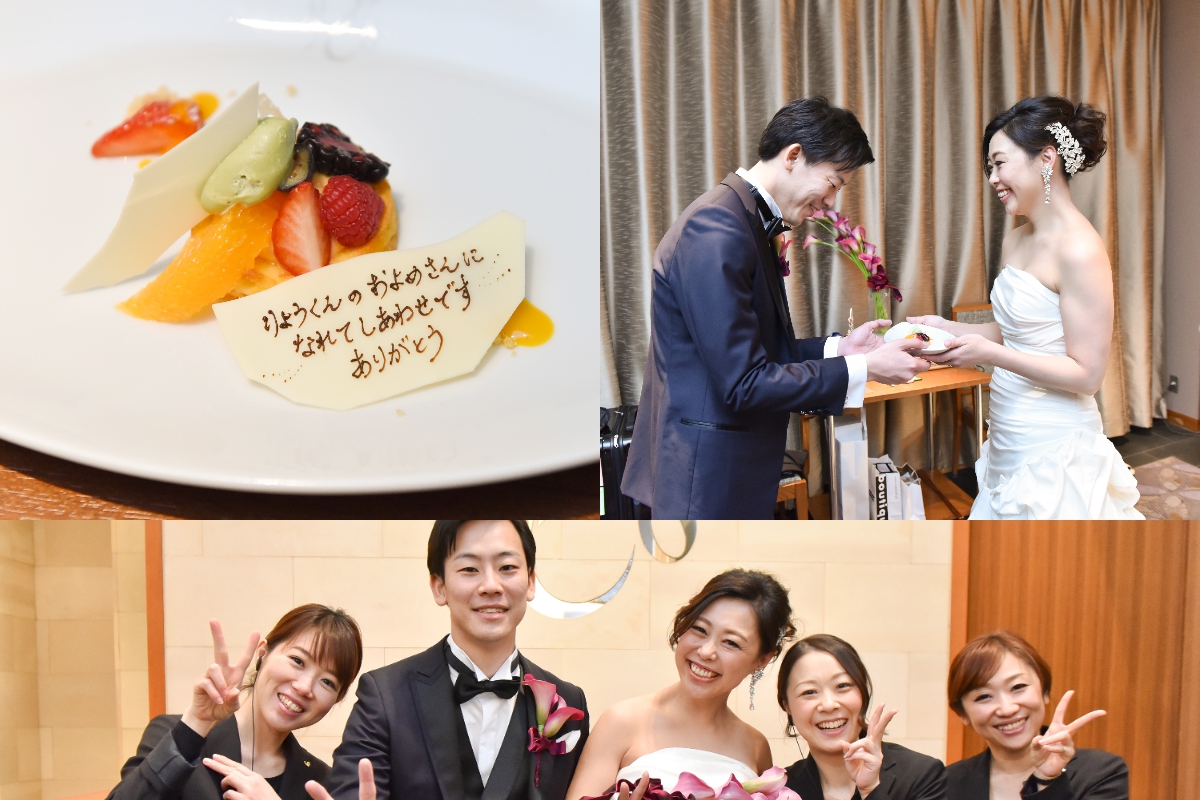 お料理はどれを食べてもおいしく、ゲストの皆さんも喜んでくれると自信をもって言えるものでした。私が感動したのは、私たちに縁のある福岡のあまおう、埼玉の狭山茶を使った手作りチョコレートです。見た目も、味も本当に本当に最高でした!!また私がチーズが大好きなので、チーズブッフェは絶対に取り入れたいと思っていました。ゲストの方もワインがお好きな方が多かったので、喜んでくださいました。なにより、式の間私たちはまったく食事を頂くことができませんでしたが、式終了後に温かなお料理を提供してくださり、本当に嬉しかったです。レストランだからこそできるサービスだと思いました。