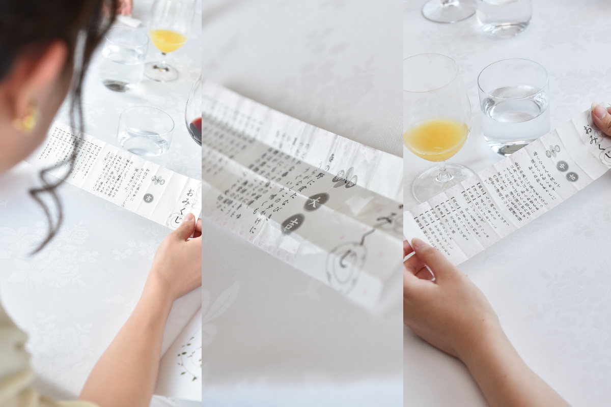 結果的にテーブルラウンドにておみくじを配布し、皆さまに二人の将来を占って頂くという形で演出を行いました。