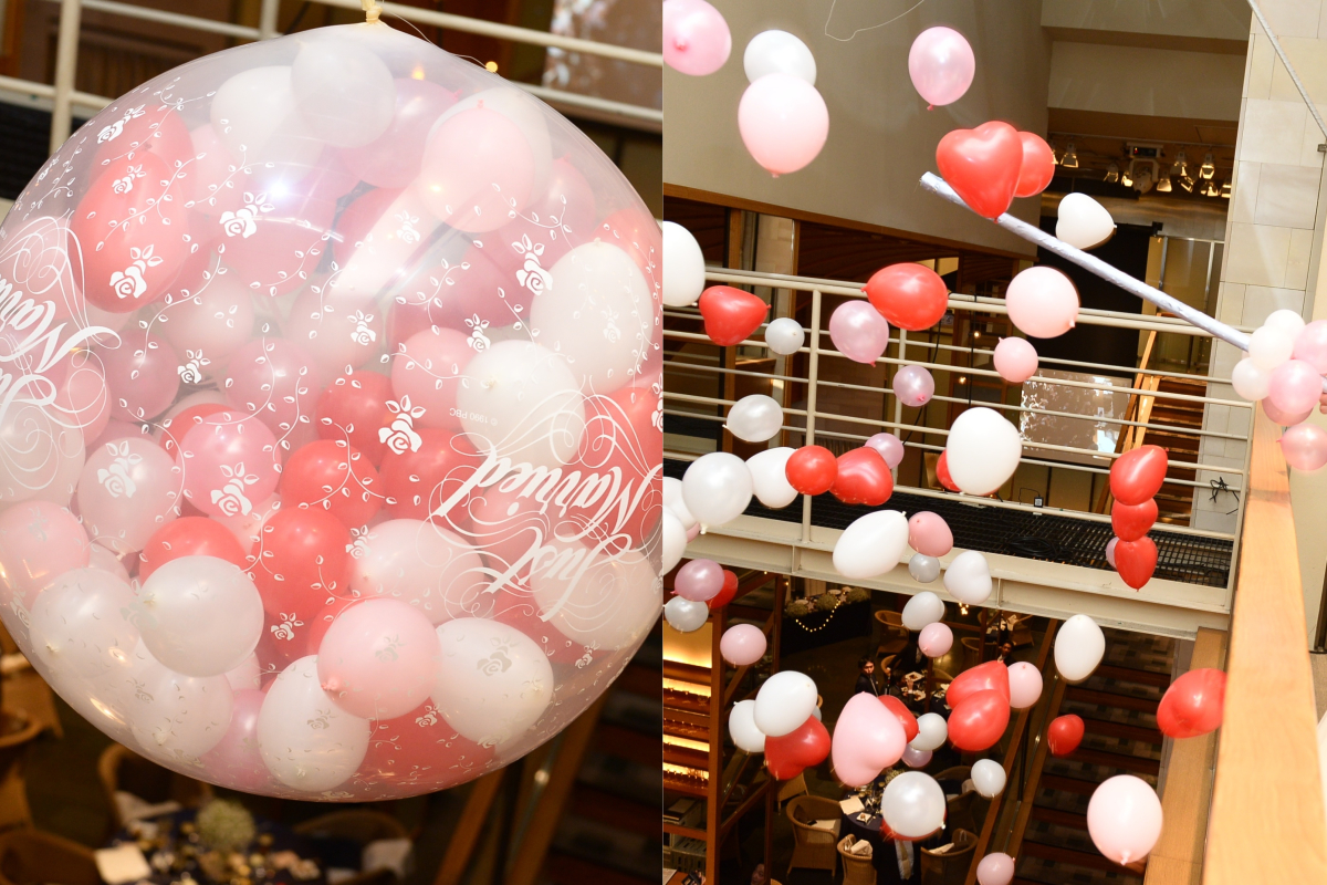 演出は、どんな方にもリラックスして楽しんでほしいという思いから、余興や友人スピーチは行わなかったので、再入場ではバルーンスパークを行い、当たりのバルーンを取った方にはプレゼントを用意しました。バルーンスパークの為に階段から再入場しましたが、階段下にゲストの皆さんが集まっているので、再入場してすぐゲストの皆さんに対面できて楽しかったです!