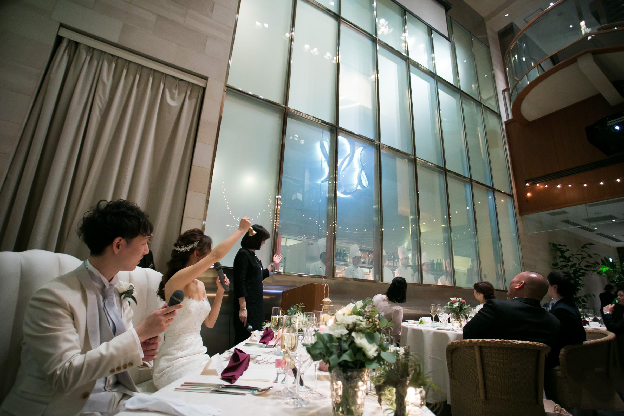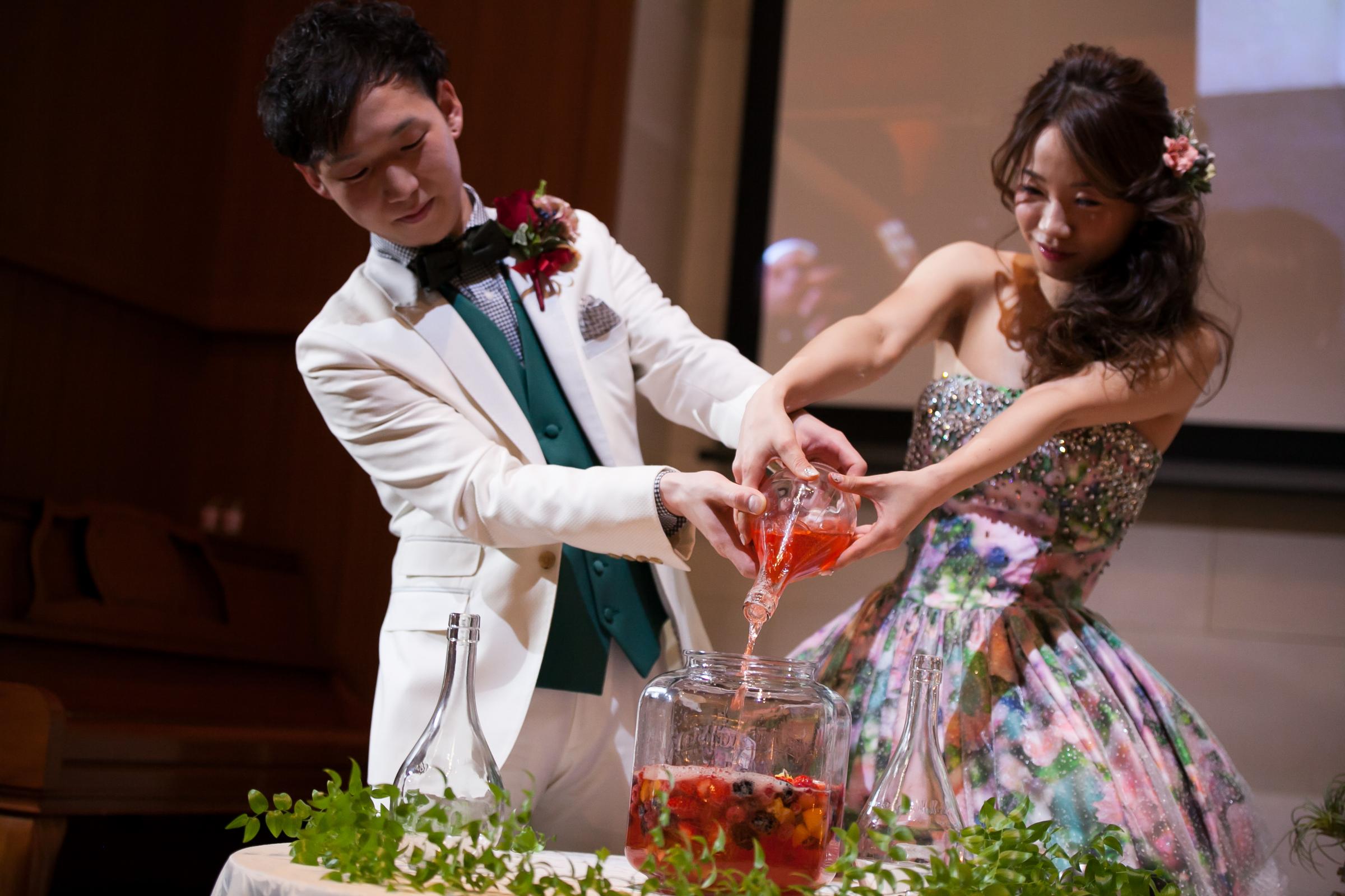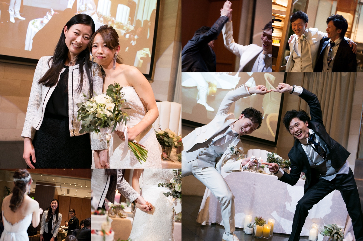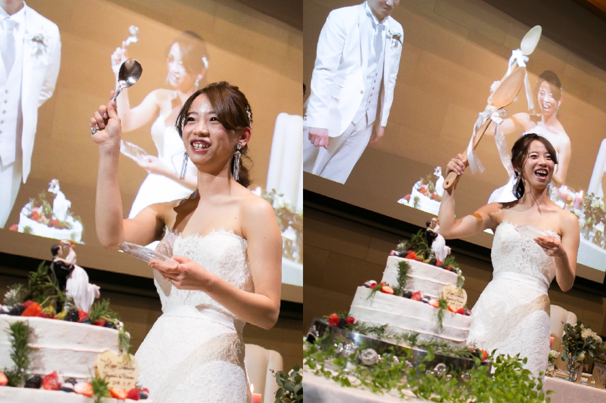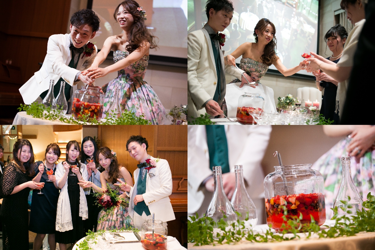 ブーケトスでは女性しか参加できないのでゲスト全員を対象にしたバルーンスパークをしたところ、とても盛り上がり一体感のある披露宴スタートにつなげられたと思います。ファーストバイトでは新郎へのサプライズでビッグスプーンを使用しましたが、一番の盛り上がりで大成功でした。テーブルラウンドのフルーツカクテル作りでは一人ひとりとしっかり言葉を交わせたのでよかったです。