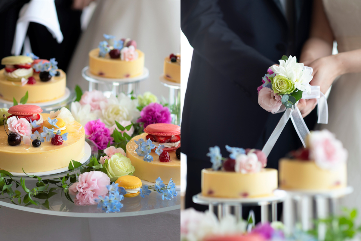特に余興や演出を行ったわけではありませんが、みんなゆっくりとお食事をとってもらえてよかったと思いました。ウェディングケーキは他の会場では選ぶことのできないムースケーキにしました。ムースケーキの見た目もとてもかわいらしく、もちろん味もとてもよかったです。ウェディングケーキが登場したときに「かわいいー!」とみんなから言ってもらえました。プロフィールムービーとエンドムービーを入れましたが、ゲストのみなさんに一休みしてもらう時間になったとも思いました。