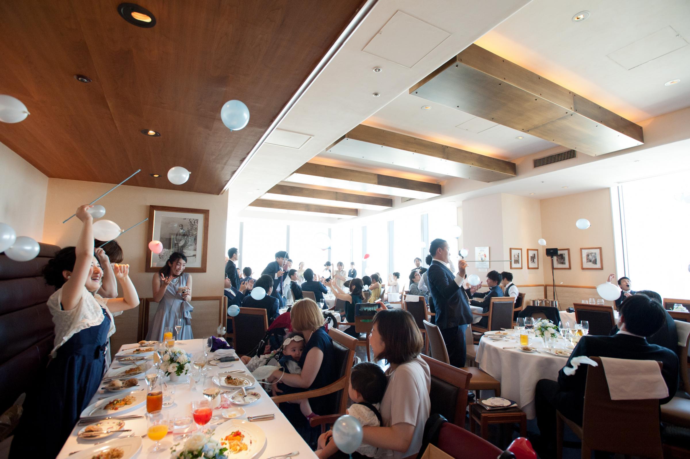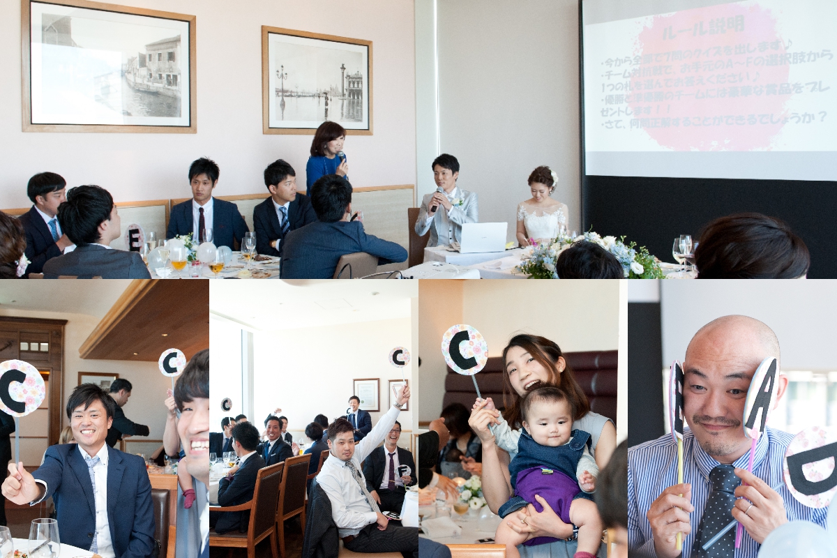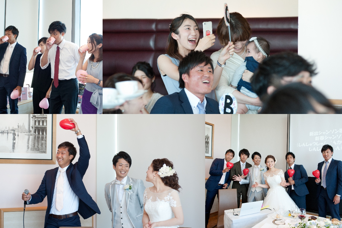 今回は友人のみを招いた1.5次会として利用させていただきました。堅苦しい雰囲気ではなく、みんなが楽しめるパーティーという雰囲気をテーマに演出や余興を考えました。長くなりがちな挨拶などはインタビュー形式にし、子供のころの友達から職場の同僚まで思い出を交えながらお話いただき、温かい雰囲気になりました。テーブルラウンドではバルーンスパークを行いました。会場が華やかになり、風船をみんなで割るということは非日常的でワクワクし、皆さん楽しんでいただけたように思います。また、中に入れてあるベビーバルーンをそれぞれ手に取っていただき写真を撮ったり、小さいお子さんも風船には大喜びでした。余興のクイズ大会は新婚旅行の旅先での宿泊先や食事の様子を紹介しながらその内容をクイズにしたり、挙式を行った日光東照宮にまつわるクイズにしました。また、ゲストも楽しめるように参加型のクイズも行い、盛り上がりました。