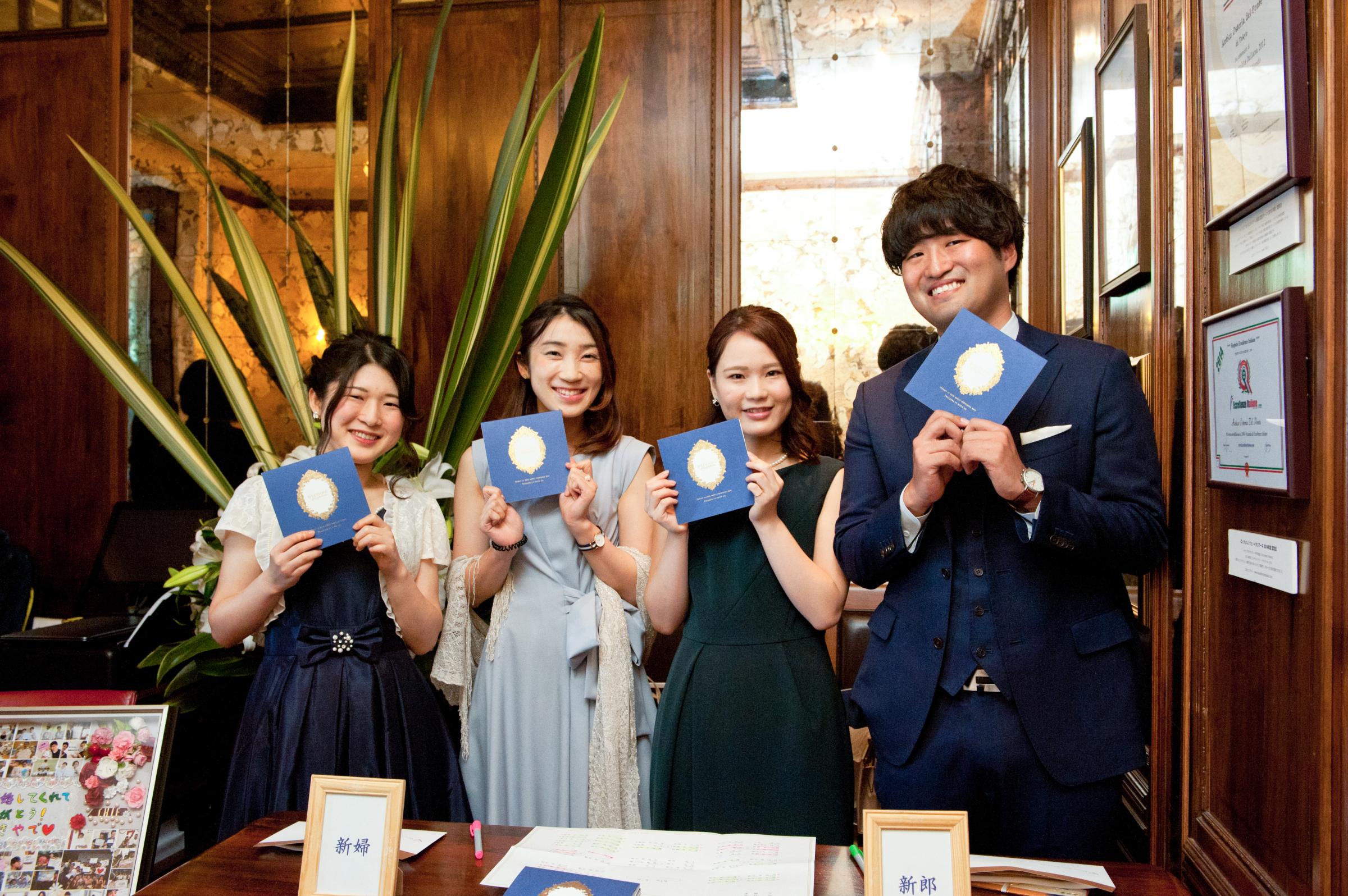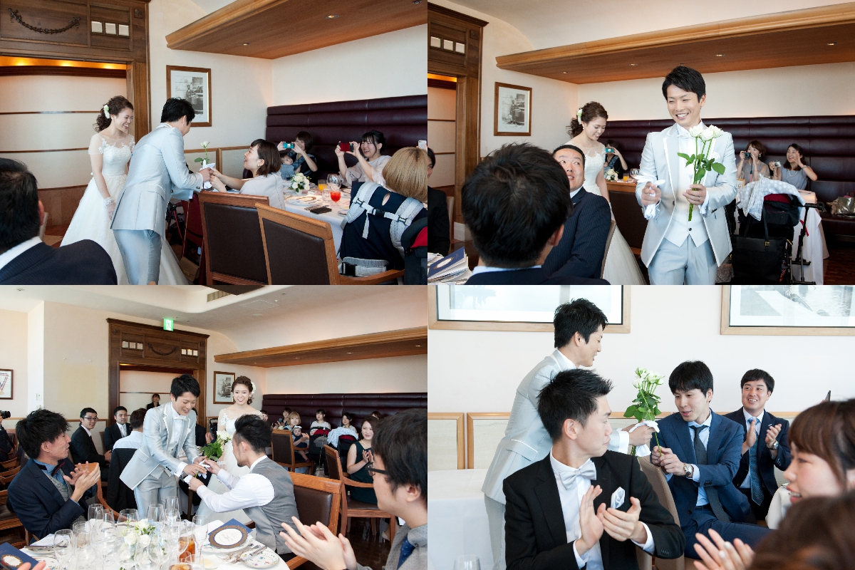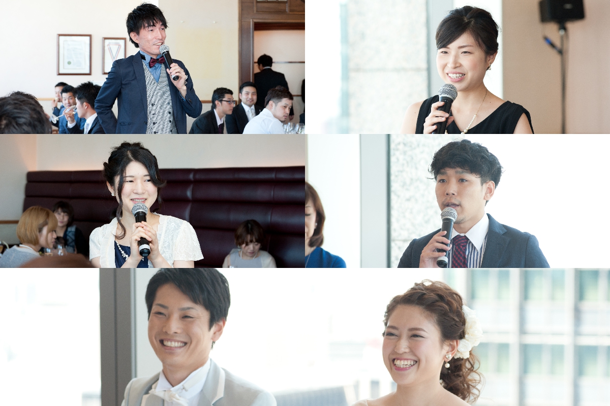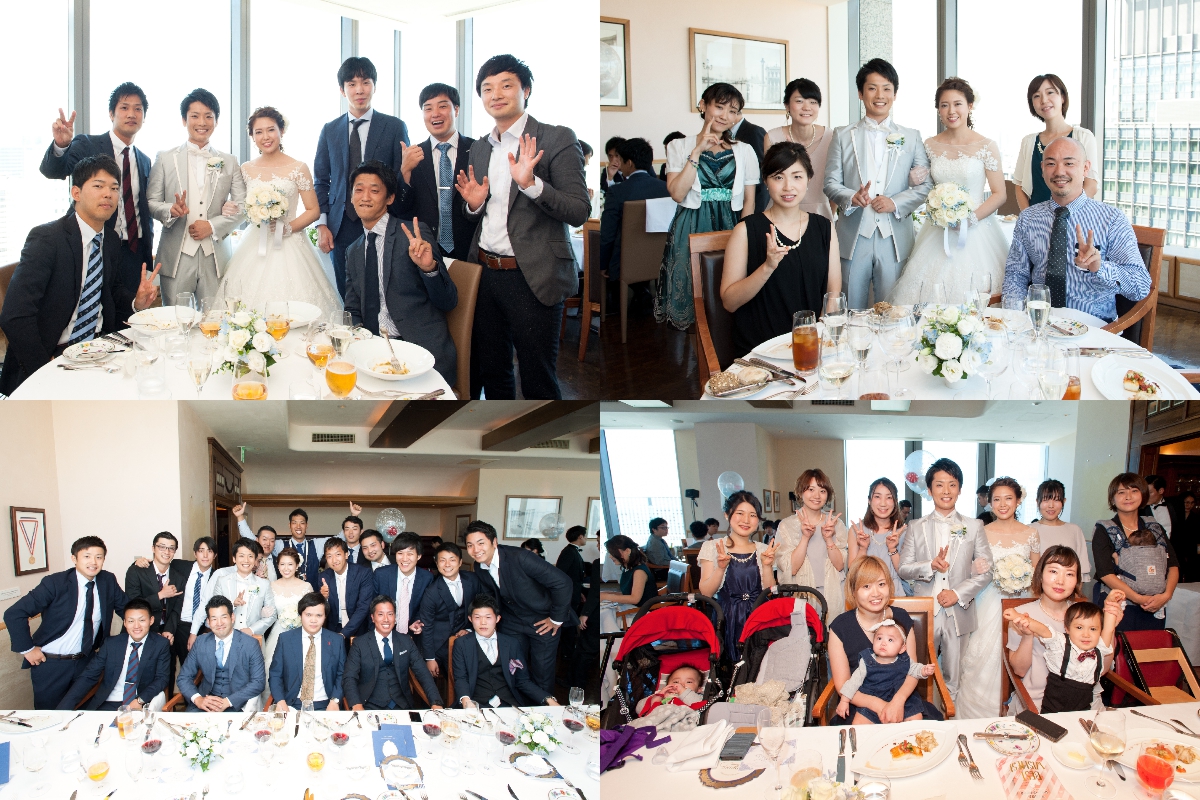 今回は友人のみを招いた1.5次会として利用させていただきました。堅苦しい雰囲気ではなく、みんなが楽しめるパーティーという雰囲気をテーマに演出や余興を考えました。長くなりがちな挨拶などはインタビュー形式にし、子供のころの友達から職場の同僚まで思い出を交えながらお話いただき、温かい雰囲気になりました。テーブルラウンドではバルーンスパークを行いました。会場が華やかになり、風船をみんなで割るということは非日常的でワクワクし、皆さん楽しんでいただけたように思います。また、中に入れてあるベビーバルーンをそれぞれ手に取っていただき写真を撮ったり、小さいお子さんも風船には大喜びでした。余興のクイズ大会は新婚旅行の旅先での宿泊先や食事の様子を紹介しながらその内容をクイズにしたり、挙式を行った日光東照宮にまつわるクイズにしました。また、ゲストも楽しめるように参加型のクイズも行い、盛り上がりました。