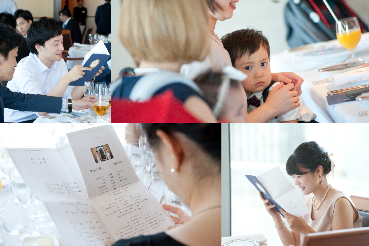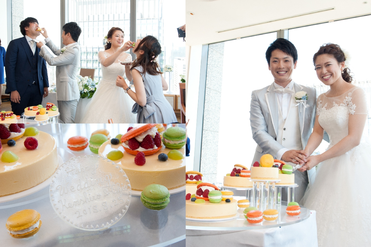 今回は友人のお子さんも招いたお昼のパーティーであったため、親しみやすいお料理が良く、イタリアンを選択しました。また、男性の割合も多かったため、おなか一杯食べていただけるように一口前菜・前菜・パン・パスタ・お魚・お肉・ケーキ・プチフールと品数も量も多めとなりました。イタリアンですのでわかりやすく美味しいお料理ばかりで苦手な食べ物がある方はいなかったと思います。ウェディングケーキは生クリームとスポンジの一般的なものは甘さが強く、食べ疲れてしまうため、ムースとベリーのさっぱりとした味のケーキで、たくさんのお料理をいただいた後でもおいしく召し上がっていただけたと思います。たくさんの結婚式に出席経験のある友人からも、トップレベルでおいしかったと感想をいただきました。