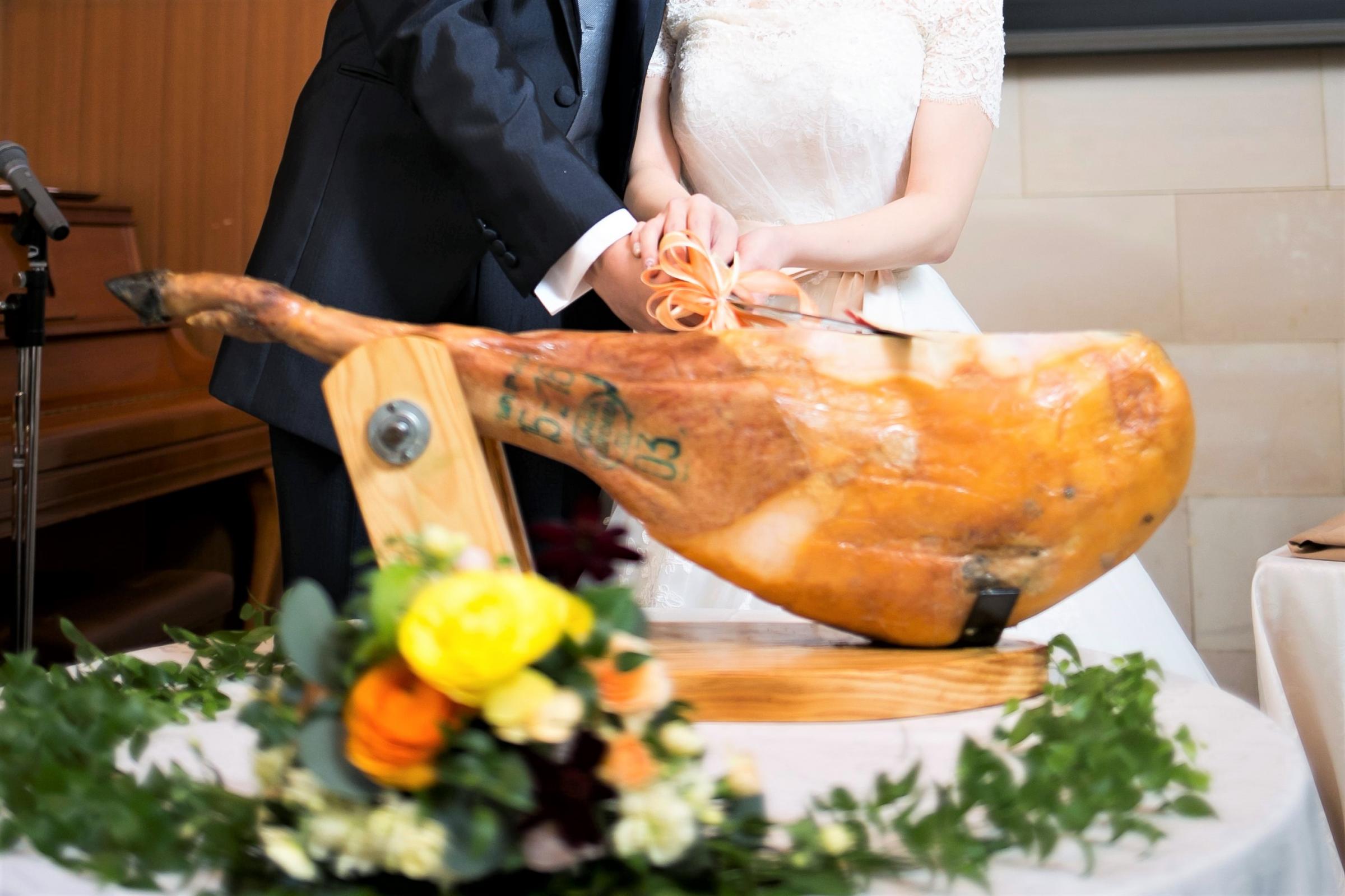 ゲストの平均年齢が高かったため、余興は少なめにしました。少なめでしたが、時間が経つのがあっという間に感じたので良い塩梅だったかと思います。ケーキ入刀を止め、生ハム入刀+チーズブッフェを行いました。