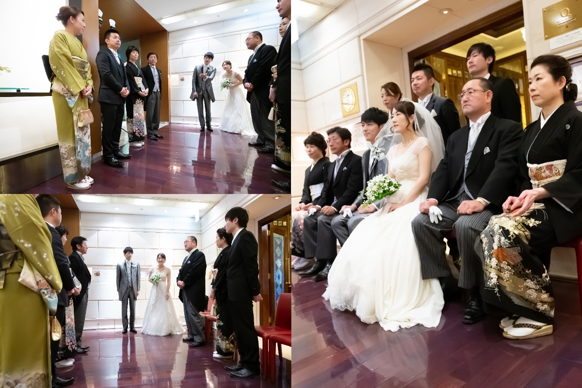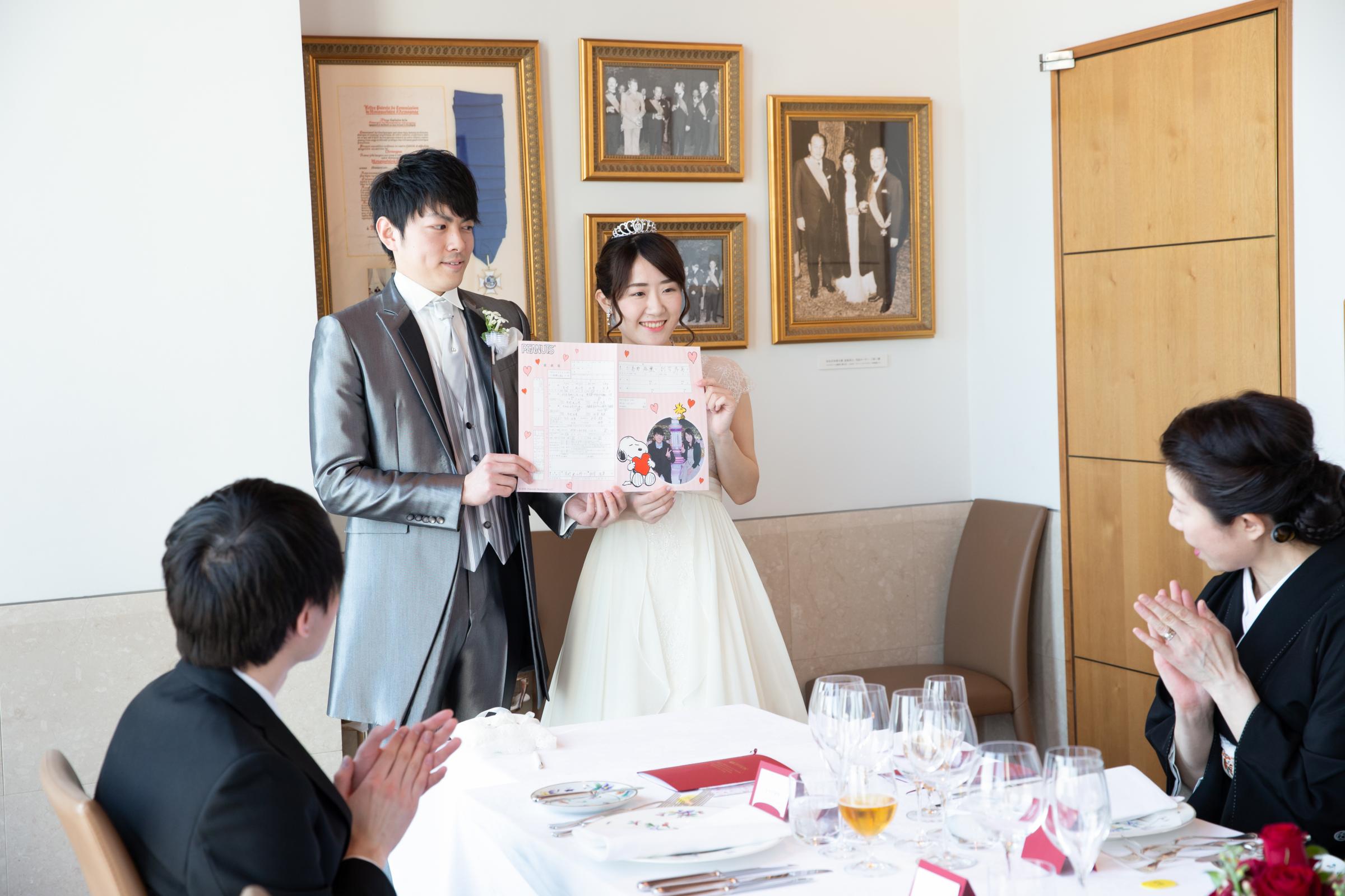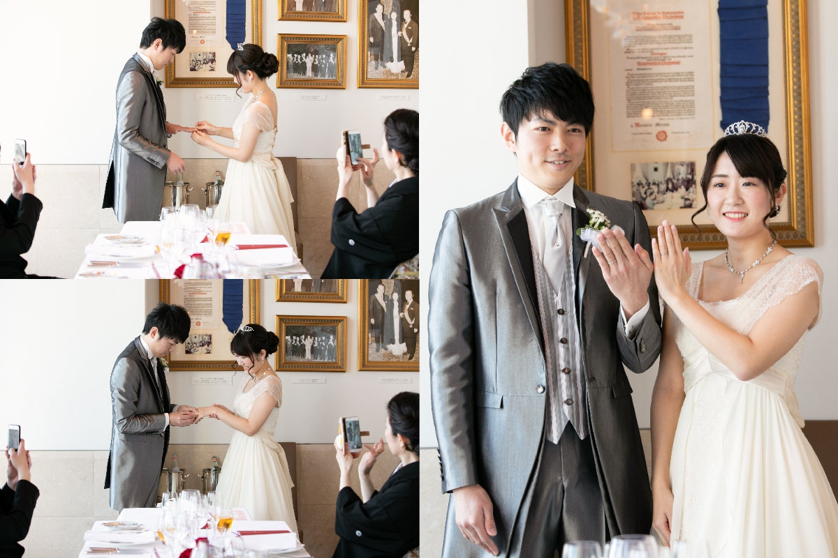 そんなに大々的な式を挙げたいわけではなかったので、大切な家族に感謝の気持ちを伝えられるように、アットホームながらも、それなりに披露宴の要素も入った演出にこだわりました。私達は、婚姻届に両親からの証人のサインをもらいたかったので、婚姻式という形を選びました。家族に見守られながら、簡易的な式をして、誓いの言葉や指輪交換をして、そのあとは食事会でした。9人という少ない式でしたので、そこまで緊張しすぎずに、終えることが出来ました。
