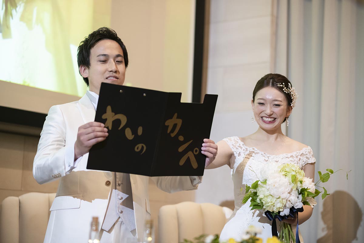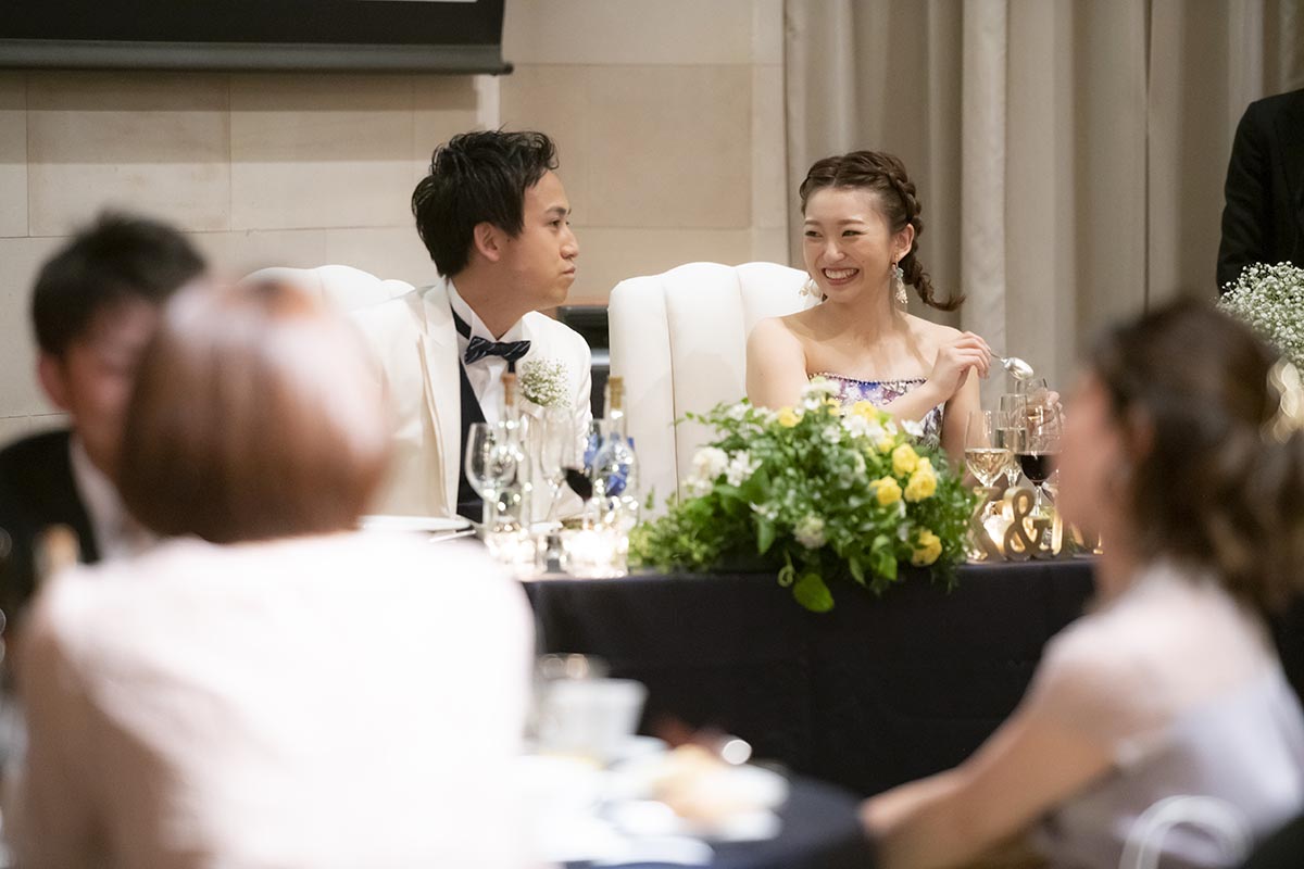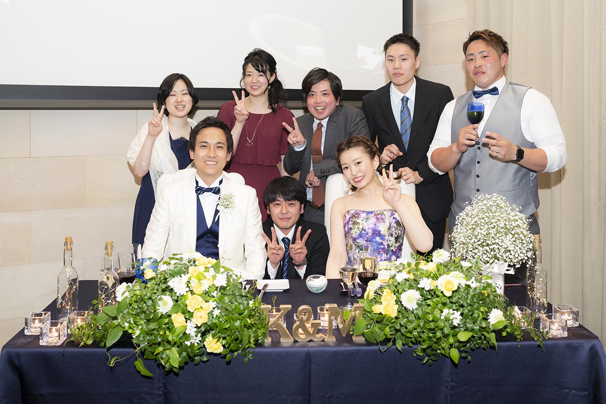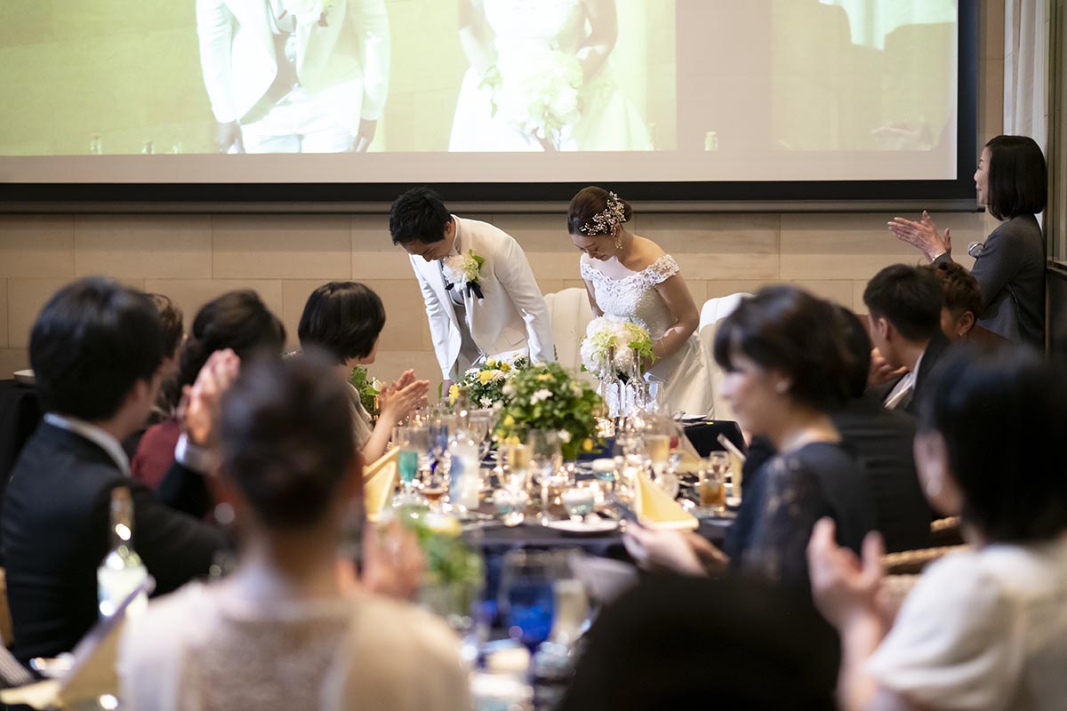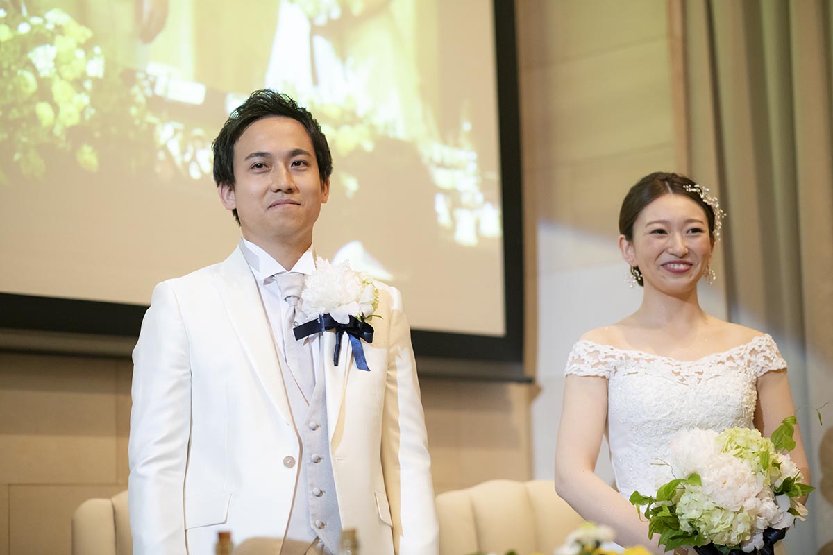 遠方からのゲストが多く、各地に散っていることもあり依頼がしづらく、思い切って余興は無しにしました。食事や歓談の時間を多くとることができ、思った以上に間延びする感じもなかったので安心しました。また、挙式は親族のみ、披露宴も来賓や職場関連の上司を呼ばず、かなりフランクな式だったことも相まって、初対面の友人同士が仲良くなっていたり、友人側から親族席へあいさつに行ってくれたり、自由に席を行き来して写真を撮ったり、話をしたりする様子が見られて嬉しかったです。2人の理想だった「アットホームさ」が、かなり出せたように思いました。特に親族からは好評で、「とても暖かくていい式だった」「たくさん、いいお友達を持ったね」と言ってもらえました。サプライズで旦那さん宛のお手紙を電報と一緒に読んでいただき、旦那さんは全然聴いていなかったそうですが、ゲストの方が盛り上がったようで安心しました。