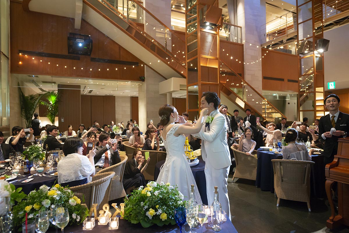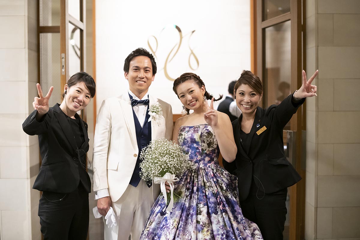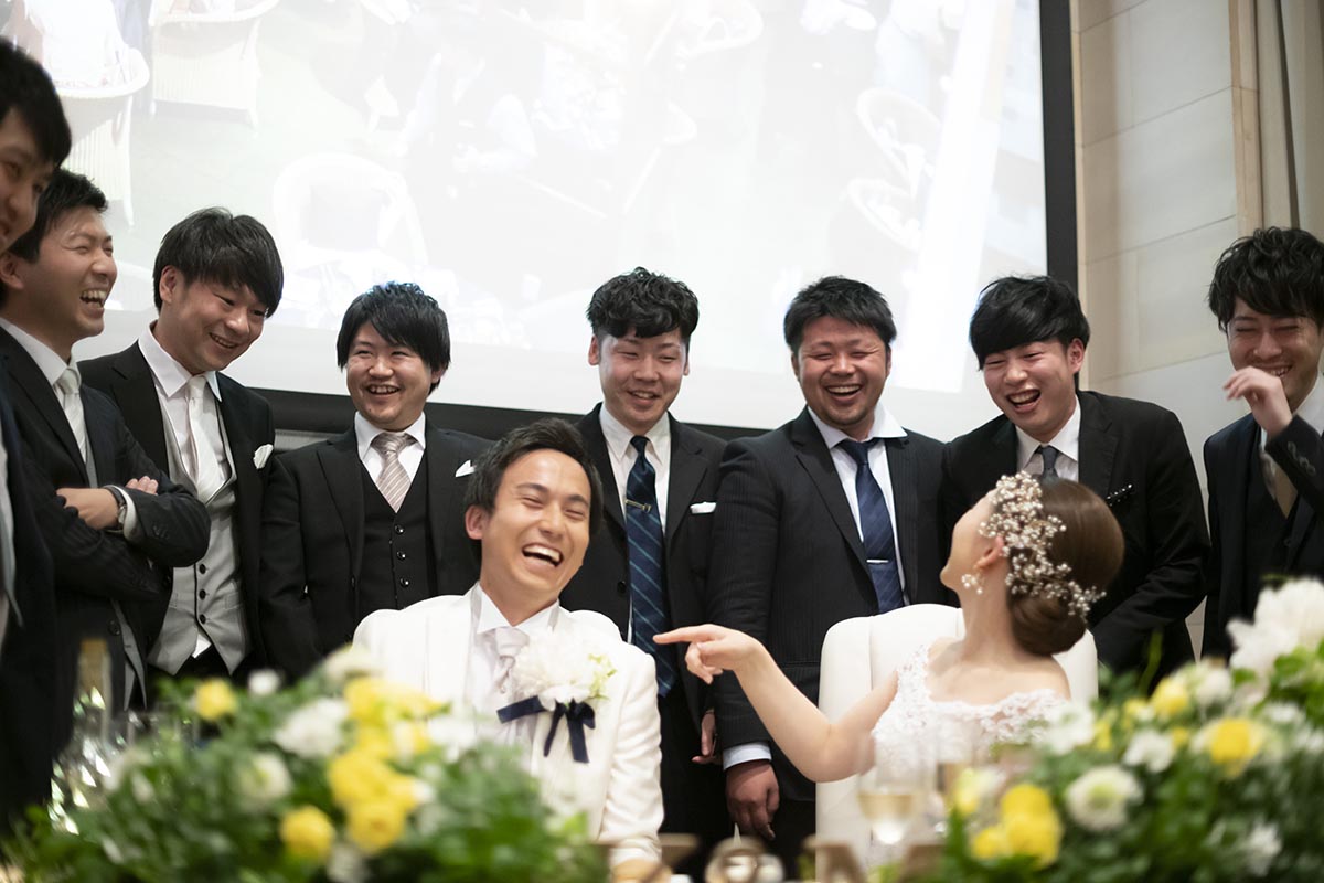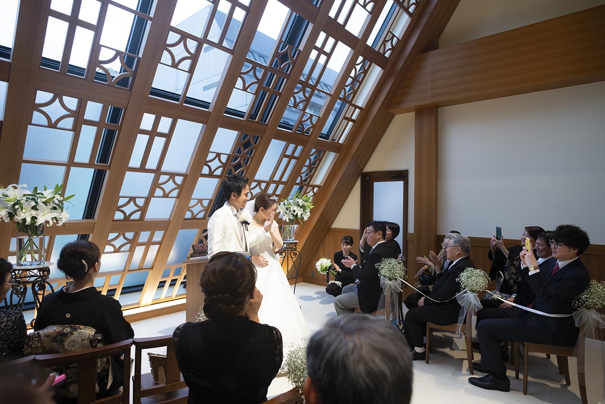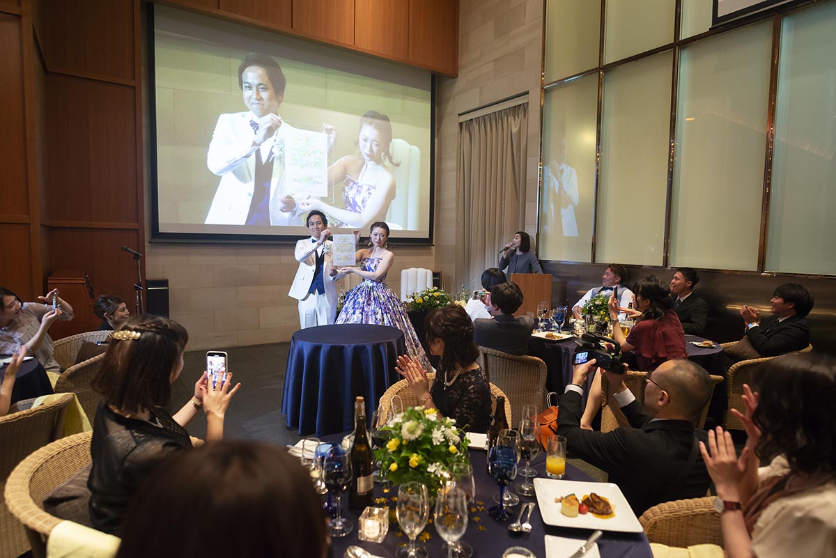 遠方からのゲストが多く、各地に散っていることもあり依頼がしづらく、思い切って余興は無しにしました。食事や歓談の時間を多くとることができ、思った以上に間延びする感じもなかったので安心しました。また、挙式は親族のみ、披露宴も来賓や職場関連の上司を呼ばず、かなりフランクな式だったことも相まって、初対面の友人同士が仲良くなっていたり、友人側から親族席へあいさつに行ってくれたり、自由に席を行き来して写真を撮ったり、話をしたりする様子が見られて嬉しかったです。2人の理想だった「アットホームさ」が、かなり出せたように思いました。特に親族からは好評で、「とても暖かくていい式だった」「たくさん、いいお友達を持ったね」と言ってもらえました。サプライズで旦那さん宛のお手紙を電報と一緒に読んでいただき、旦那さんは全然聴いていなかったそうですが、ゲストの方が盛り上がったようで安心しました。