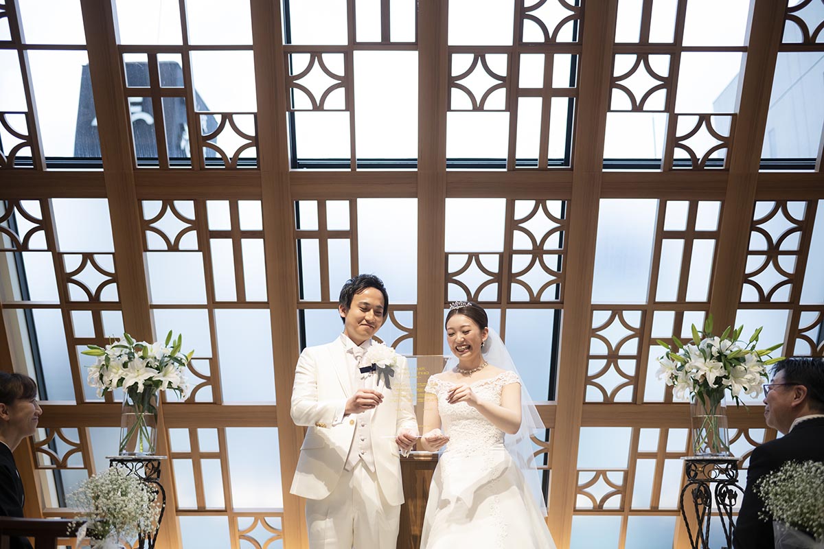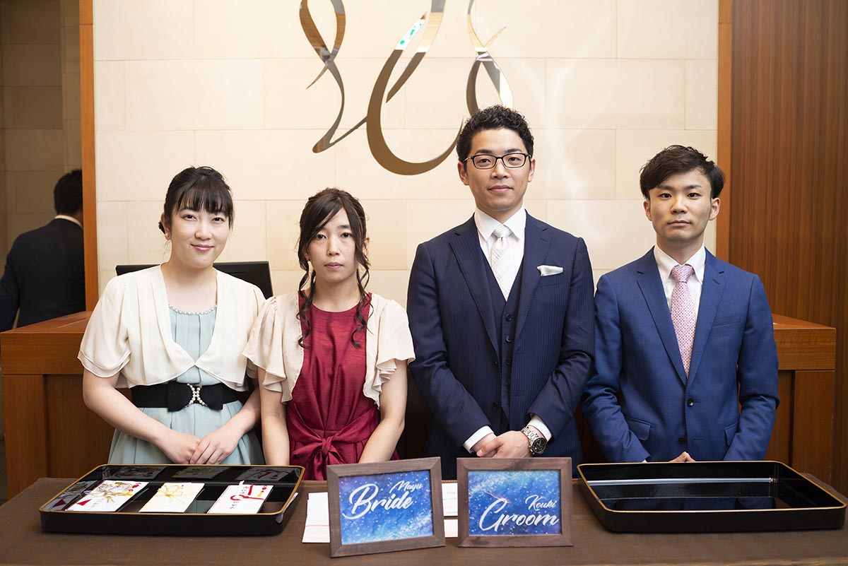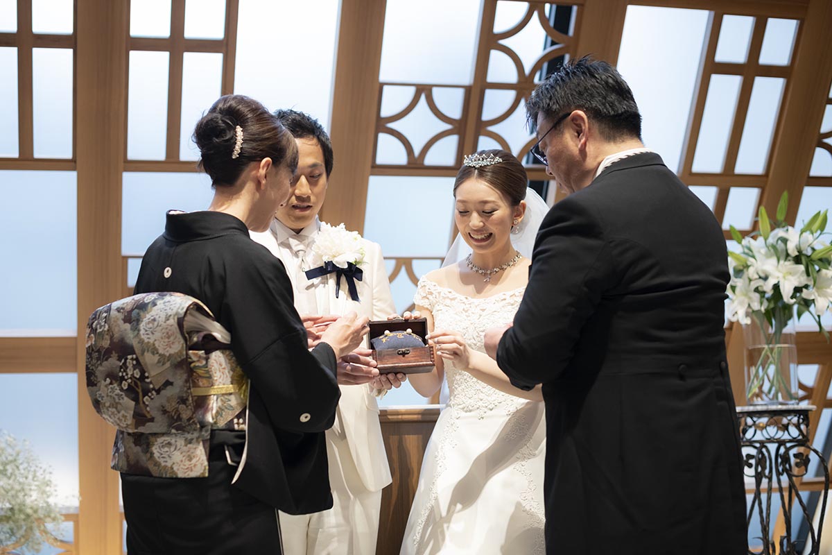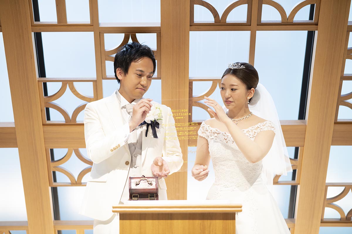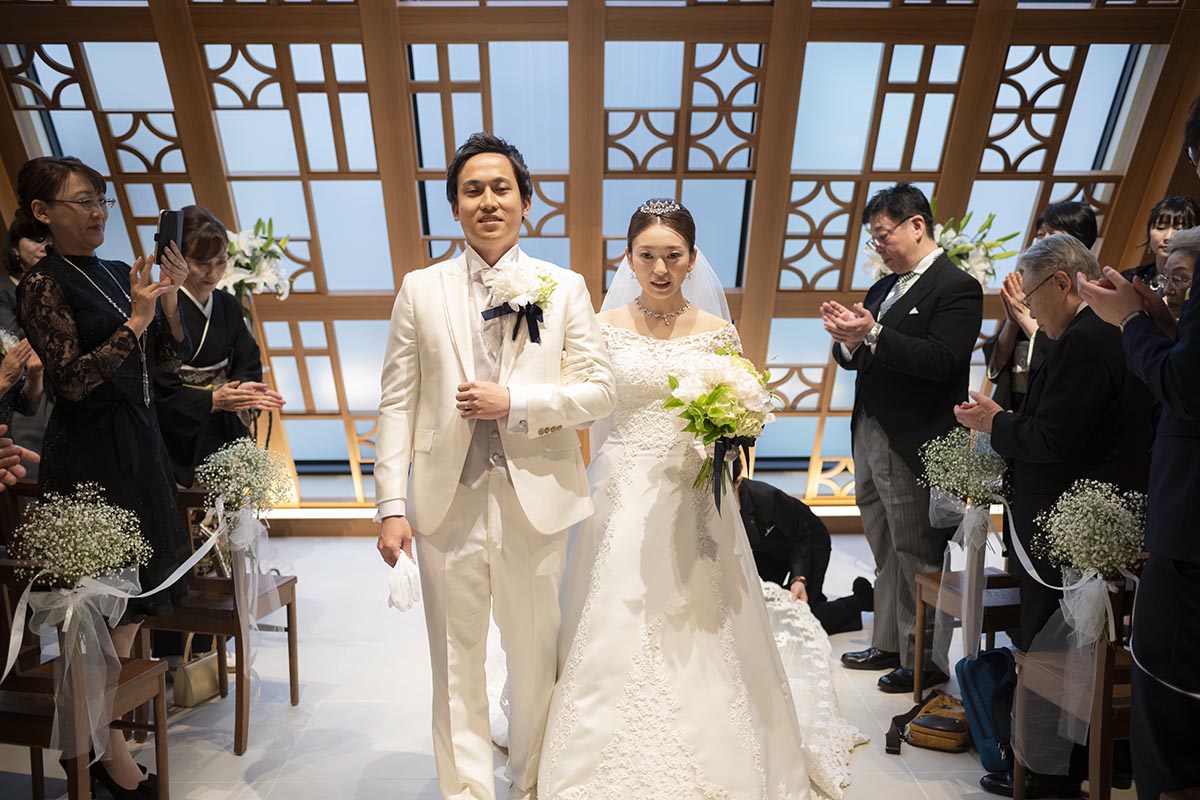 遠方からのゲストが多く、各地に散っていることもあり依頼がしづらく、思い切って余興は無しにしました。食事や歓談の時間を多くとることができ、思った以上に間延びする感じもなかったので安心しました。また、挙式は親族のみ、披露宴も来賓や職場関連の上司を呼ばず、かなりフランクな式だったことも相まって、初対面の友人同士が仲良くなっていたり、友人側から親族席へあいさつに行ってくれたり、自由に席を行き来して写真を撮ったり、話をしたりする様子が見られて嬉しかったです。2人の理想だった「アットホームさ」が、かなり出せたように思いました。特に親族からは好評で、「とても暖かくていい式だった」「たくさん、いいお友達を持ったね」と言ってもらえました。サプライズで旦那さん宛のお手紙を電報と一緒に読んでいただき、旦那さんは全然聴いていなかったそうですが、ゲストの方が盛り上がったようで安心しました。