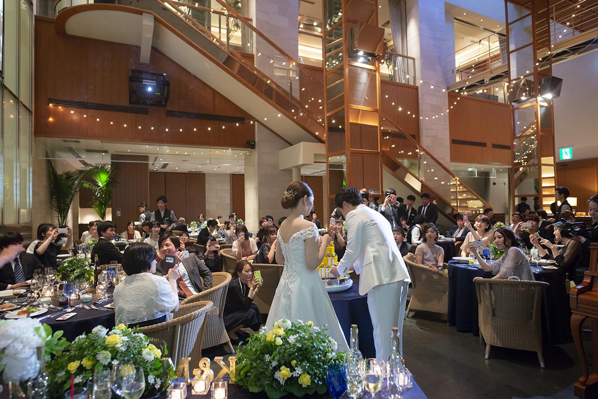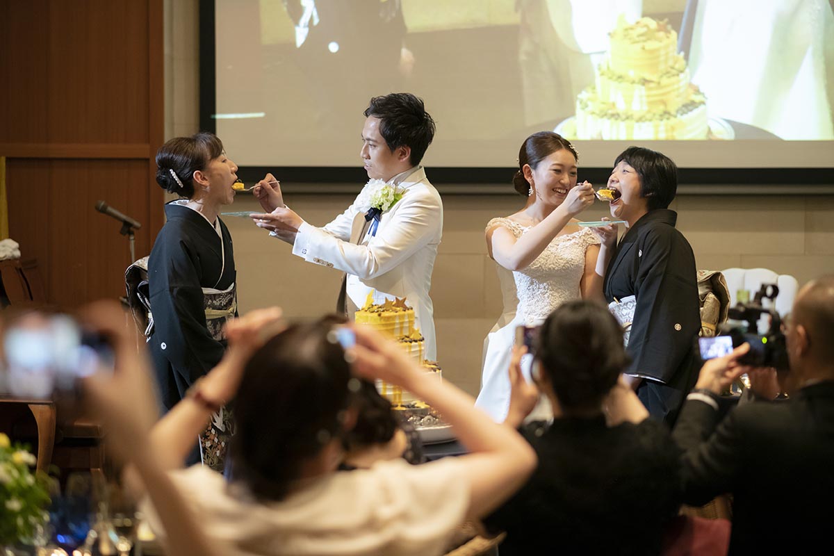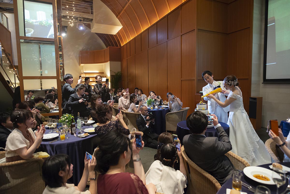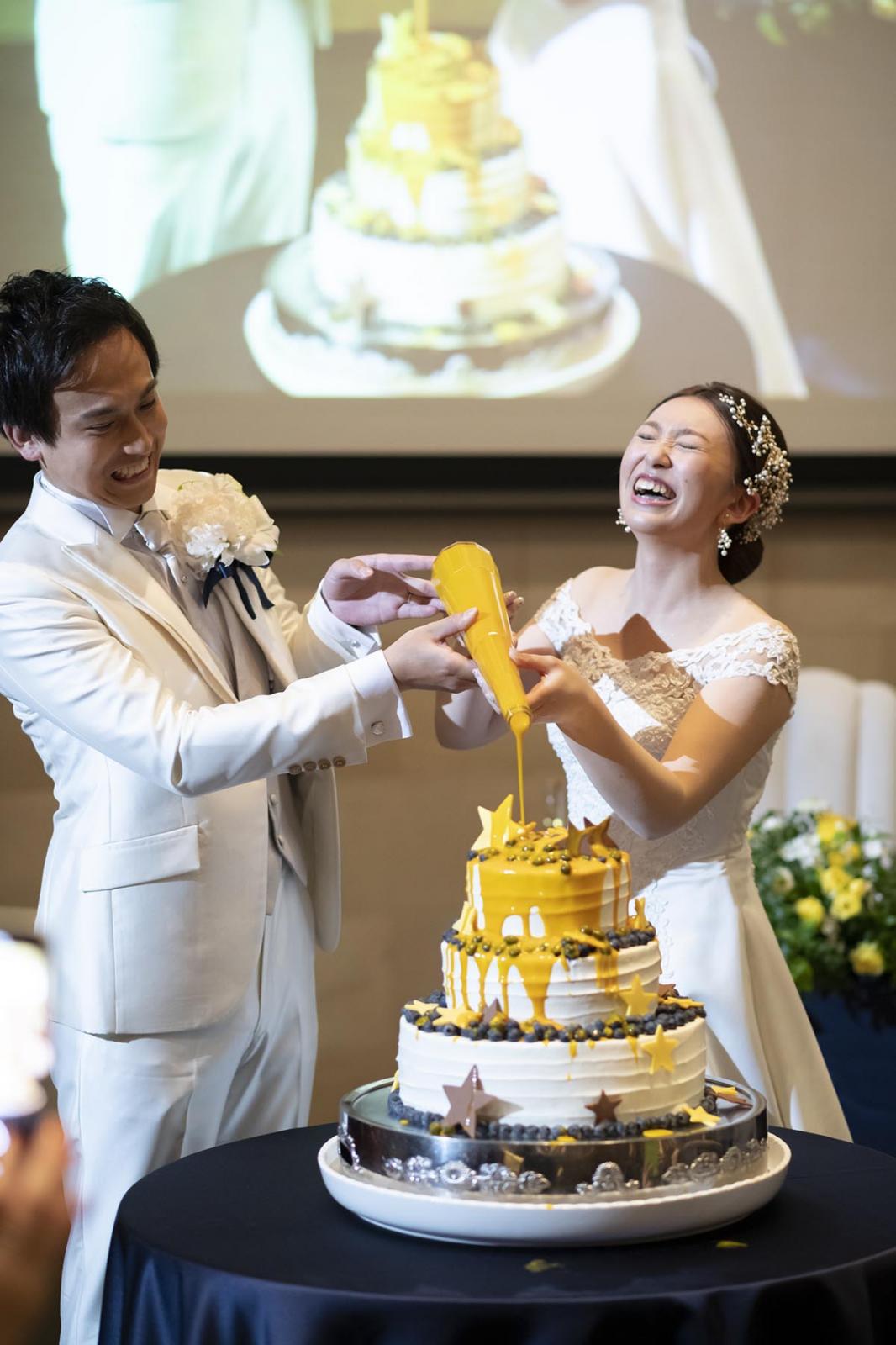 金額的に悩みましたが、ランクを上げて選べるコースを選択しました。レストランならではの演出と感じましたし、選ぶのも楽しいし、結婚式で隣の人とメニューが違うことで、久々に会う友人や1人で出席してくれたゲストの方にとっても会話を楽しむ糸口になると思いました。また、招待状を出すタイミングでも「悩む~」「どっちがどういう感じなの?」などとゲストの方から連絡があったりで、式前の段階からたくさんコミュニケーションが取れて楽しかったです。ケーキは標準のものにするかかなり悩んだのですが、オリジナルで作っていただいて正解でした。食べるのがもったいないくらいかわいらしく、超甘党の新郎も、甘いものがあまり得意でない新婦も二人とも大満足のおいしさでした。ケーキカットではなくシロップをかける演出もすごくよかったです。(プロフィールブックにひっそり書いた「ケーキ入”糖”」がひっそりウケていたみたいで満足…笑)