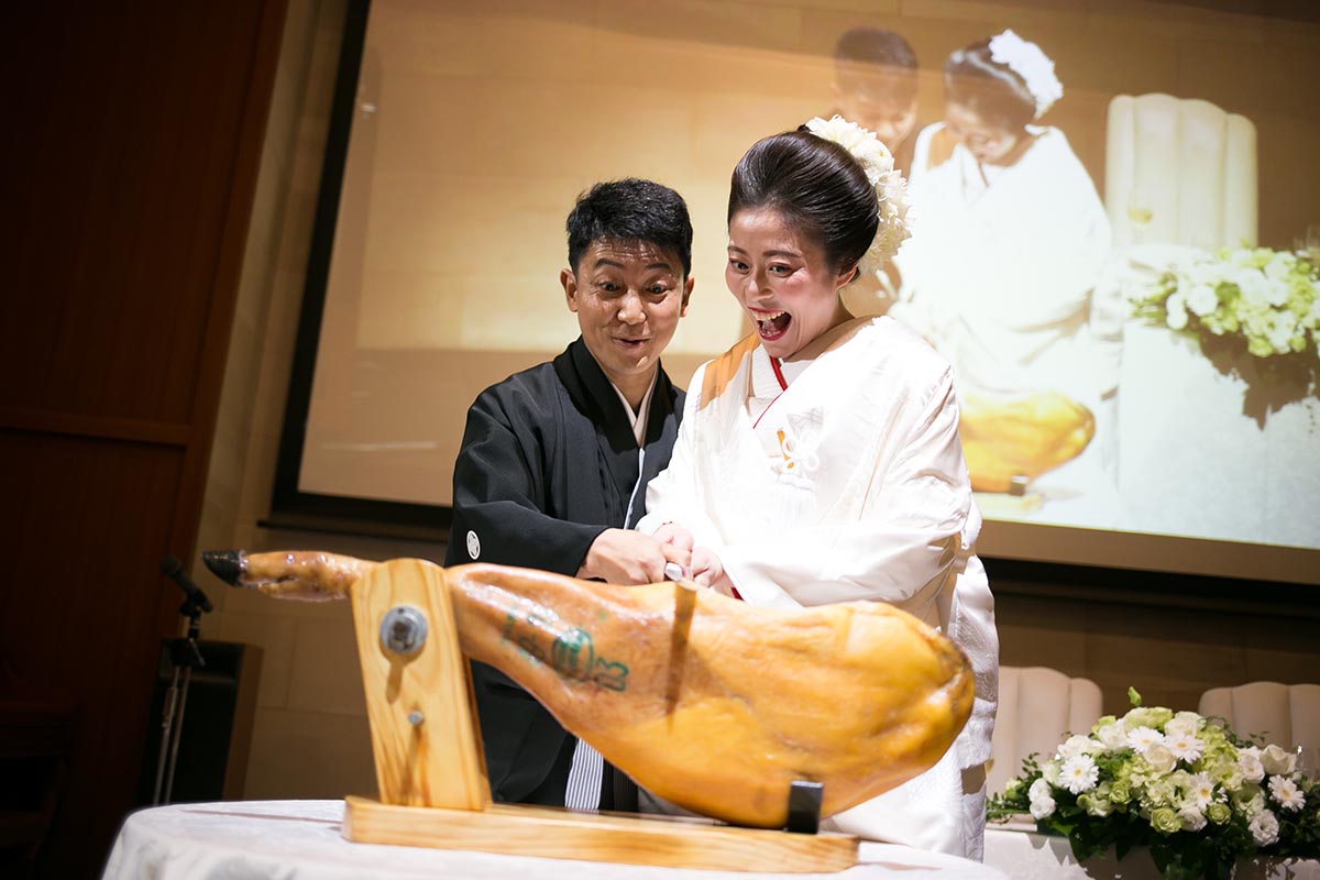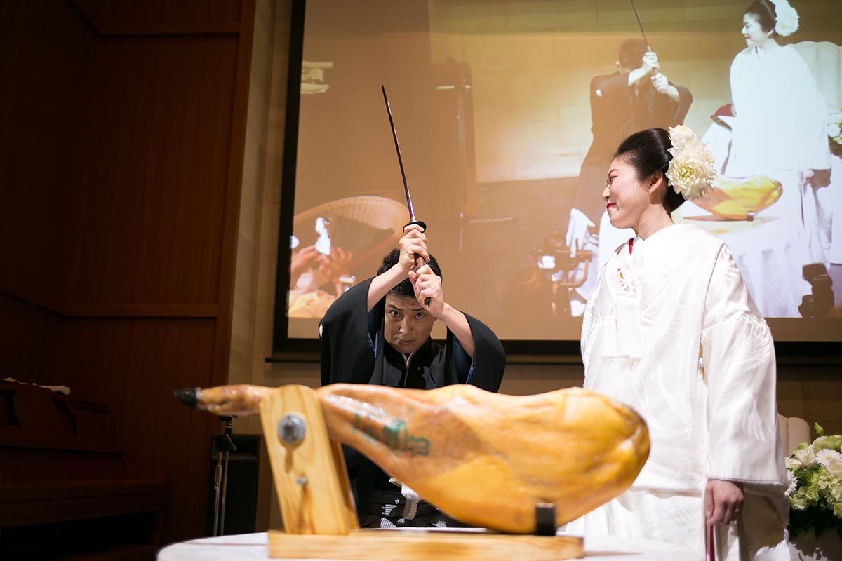 迎賓の曲から生ハム投刀に日本刀、忍者の登場、プチギフト製作まで、自分らしい披露宴を演出できたと思っています
