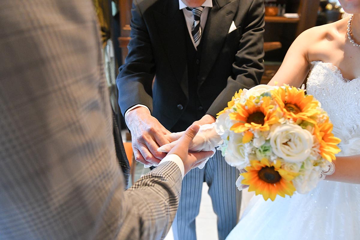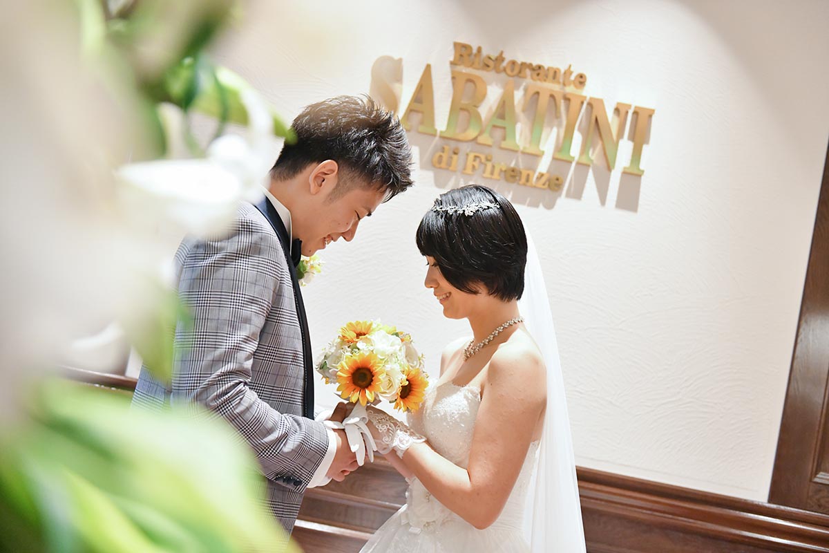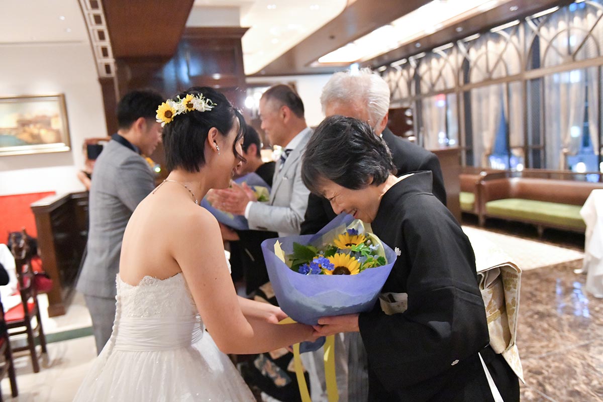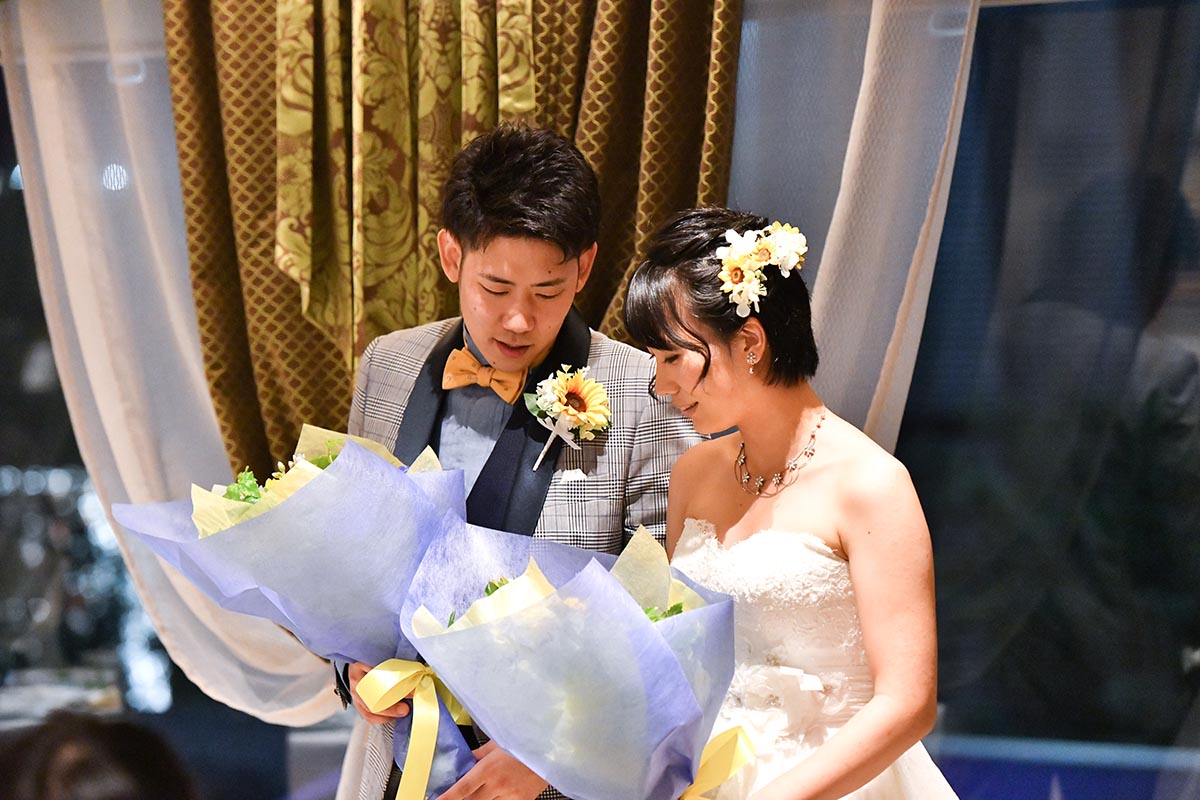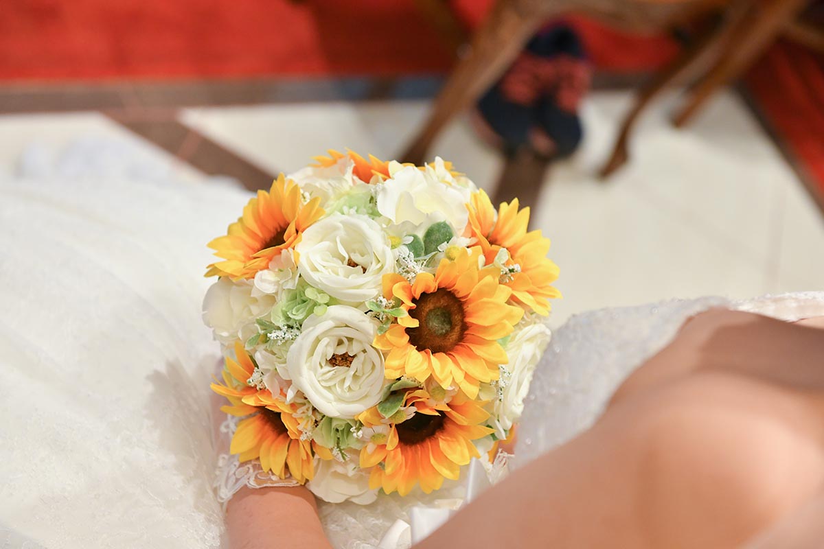 ・新婦セレクト(持ち込み)のひまわりのブーケ、ブートニアを当日持参し、季節感を演出した。