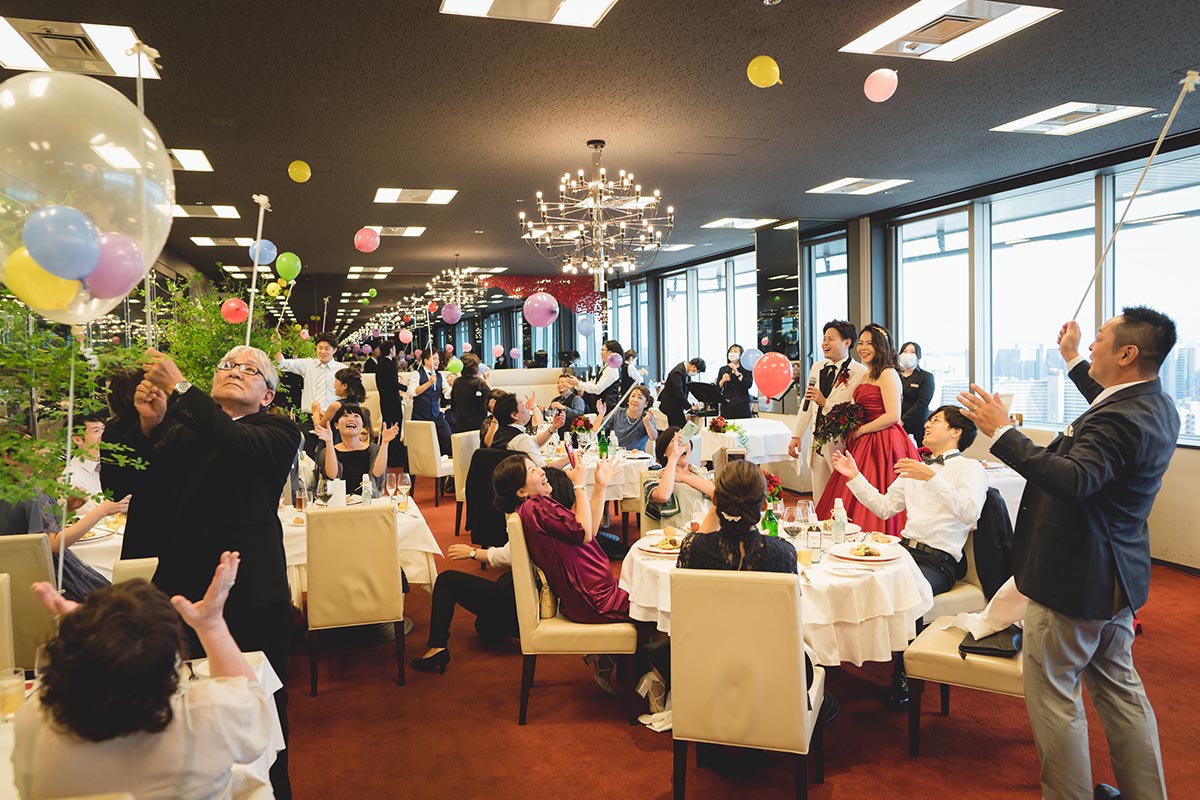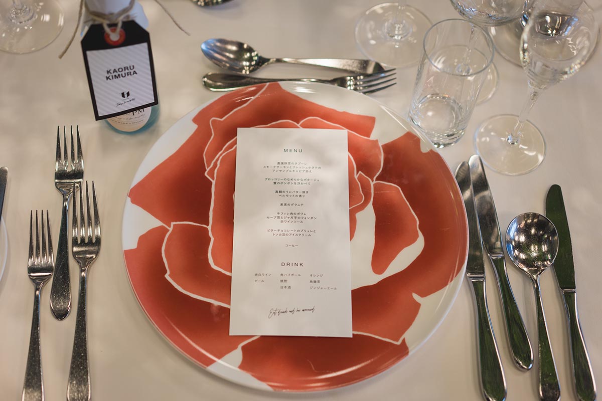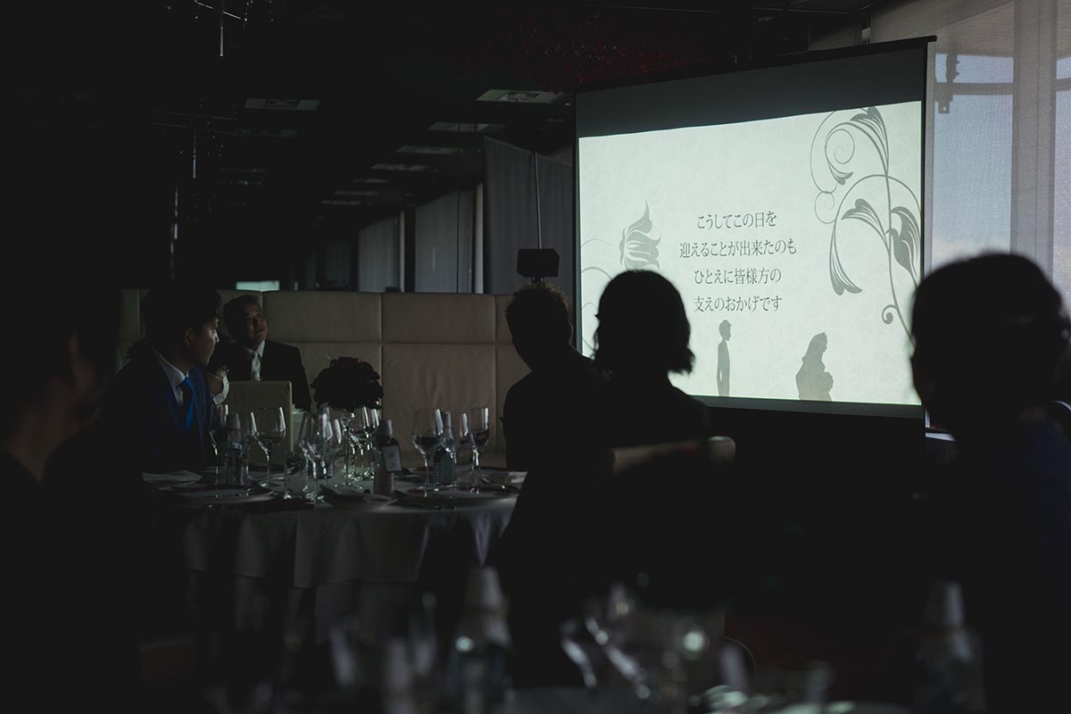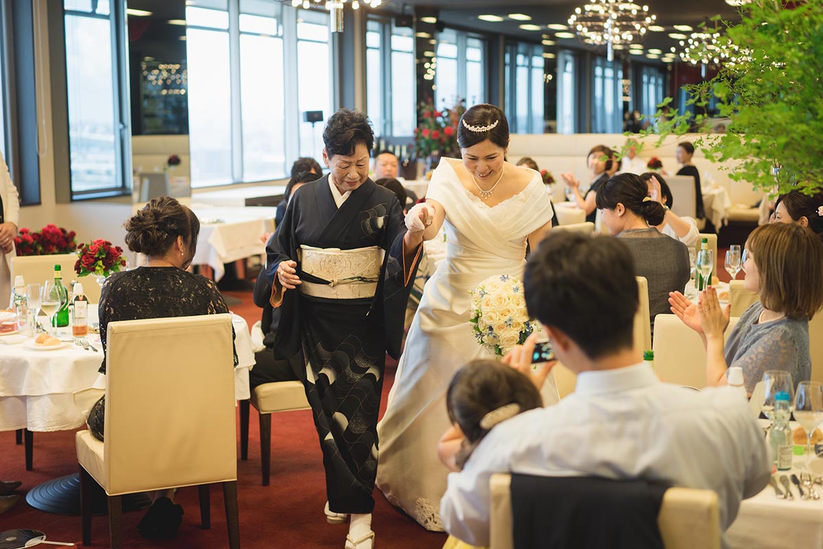 普通の式の流れとは少し変えたかった。テーブルを飾るお花も、緑(新緑)をどうしても加えたかった。夏だし、最高のロケーションのガラス張りの会場なので、清々しい雰囲気を出したかった。
