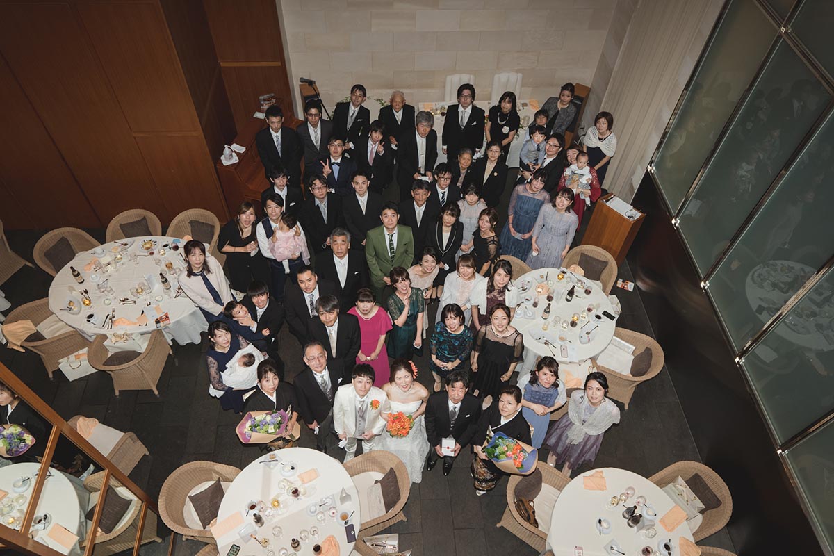 また、会場の装花は、ラリアンスの高い吹き抜け天井に負けない華やかさが欲しかったので、テーブルの装花は、自分達で用意した小さい木箱を2段重ねたものに活けて、ボリューム感を出しました。お花の色味もばっちり思った通りに仕上げていただいて嬉しかったです。