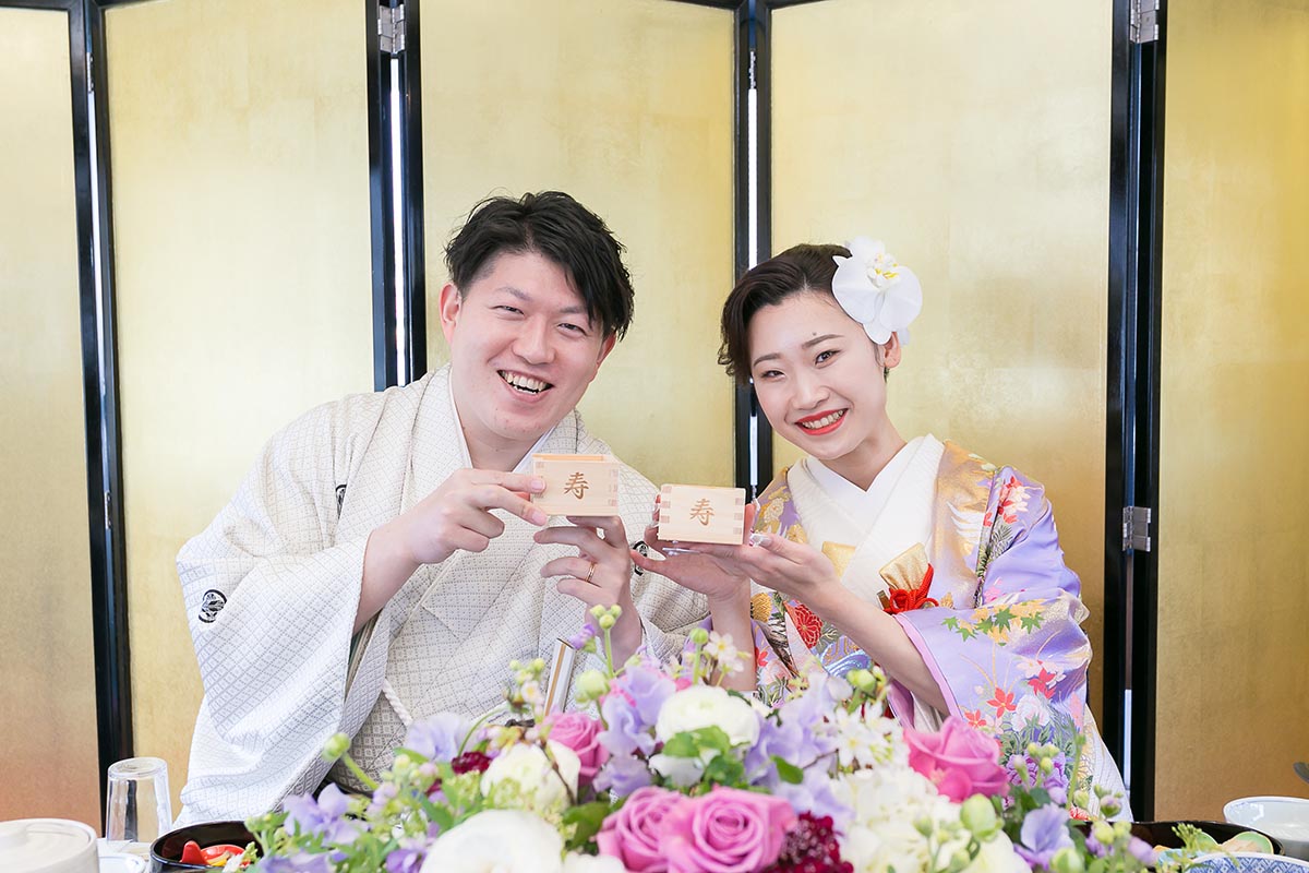 和装、鏡開き、席札はゲストの名前入りの枡にするなど、和婚らしいものを沢山取り入れました。