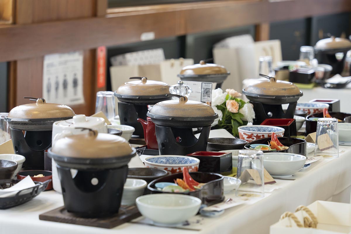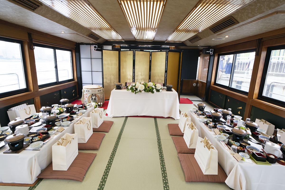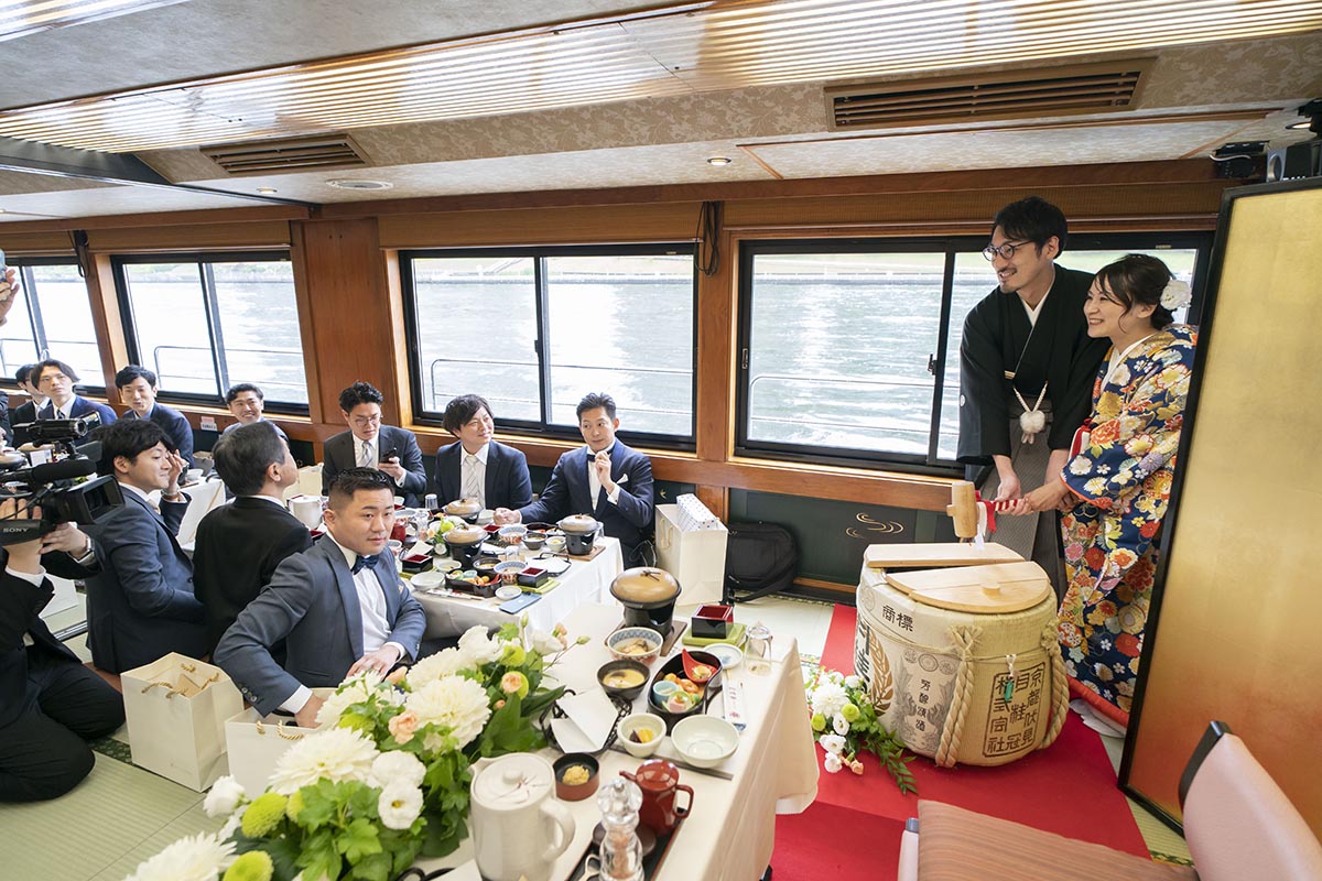 演出で鏡開きを行い、その日本酒を乾杯酒にしました。その後も自由に飲んでいただくようにしており、皆さんも沢山飲んでくれていました。高砂のすぐ横に酒樽を置いていたので、ゲストがお酒を汲みに来た際は私たちが汲んでお渡しすることが出来、お礼やご挨拶をする機会にもなりました。後日ゲストからあの日本酒がとても美味しかったと好評のお声も多数頂きました。お料理も、屋形船に合わせ日本食にしました。天ぷらは揚げたてが次々と運ばれてきたので、アツアツをいただくことが出来、こちらもとても好評でした。