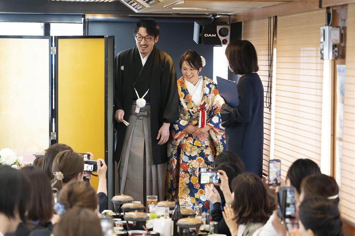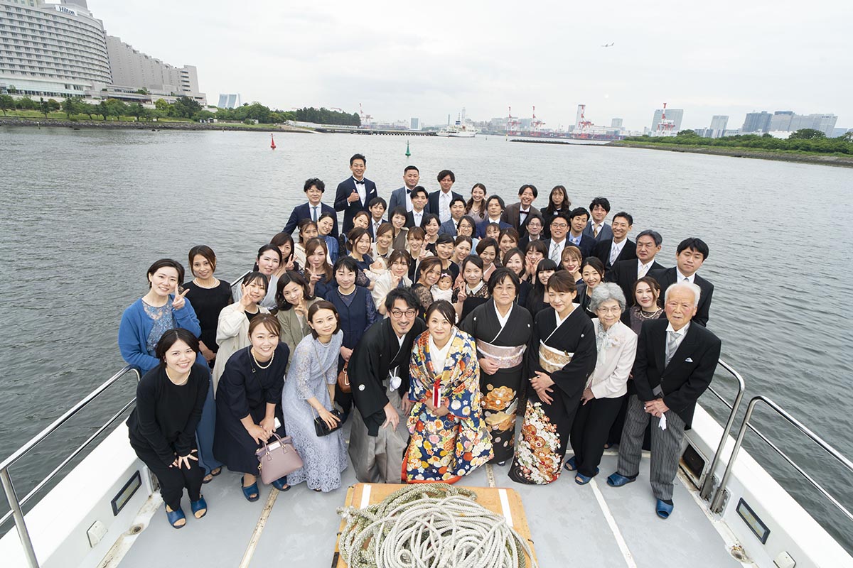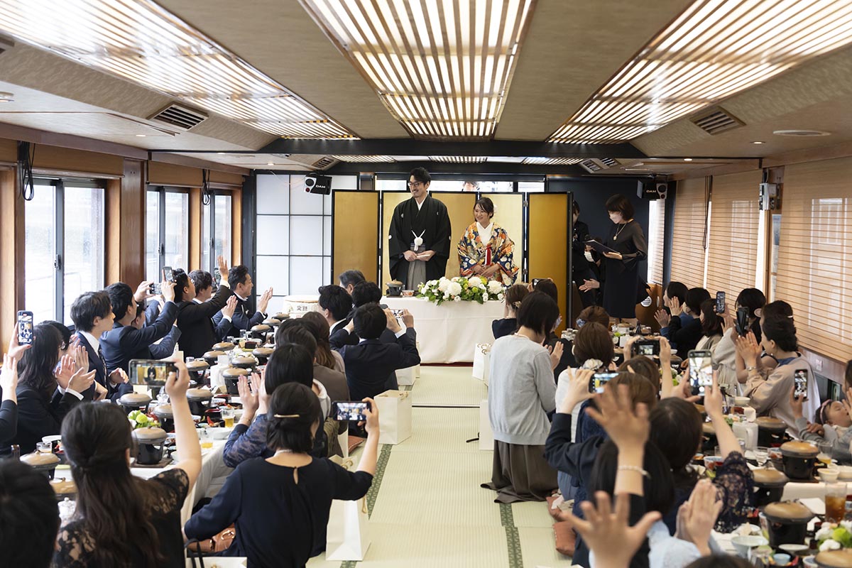 気取らない感じの楽しい式にしたいと思い、最初は1.5次会くらいで考えていました。しかし職場の上司も招待する予定だったため、カジュアルすぎてもな、と悩んでいました。そんな時に屋形船での披露宴を見つけ、これなら披露宴というちゃんとした形も取れ、その一方でゲスト皆さんとわいわい出来るのではと思い、決めました。招待状を送った段階でも、皆さんとても興味を示してくれて、楽しみだという声を沢山頂きました。実際の披露宴も、皆さんも家族も私たちも、とても楽しく過ごせていたと思います。余興はゲストにお願いするのではなく、私たちで謎解きゲームを用意し、テーブルごとにチャレンジするというものを行いました。こちらも皆さんすごく真剣に取り組んでいて、答え合わせや商品贈呈の時もすごく盛り上がりました。こだわりの強い披露宴となりましたが、プランナーさんや司会者さんも快く引き受けてくれ、多大なるお力添えをいただきました。