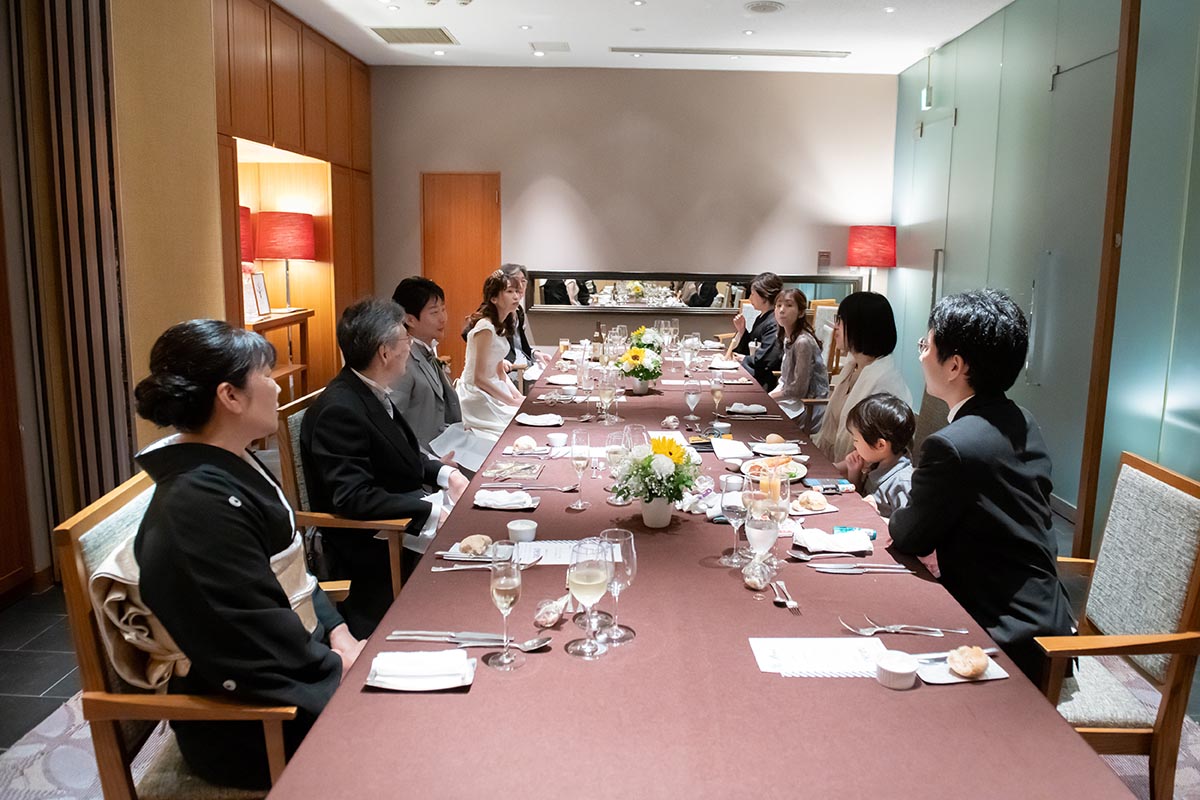 7月の挙式だったので、装飾などを全体的に夏っぽくしました。メニュー表、席札、ウェルカムスペース、プチギフト・ウェディングツリーを手作りにしました。家族婚らしくアットホームな雰囲気を出せたので良かったです。披露宴の席には、ヒマワリを飾ったので家族にも季節を感じられて良かったと好評でした。あとは、食事中は歓談をメインにしたかったので、お色直しはカットしました。歓談をメインにしたので新郎新婦でも料理を完食できました。披露宴中も家族みんなが同じテーブルで過ごせたので、大勢でやる結婚式とは違い距離が近くて会話がしやすかったです。