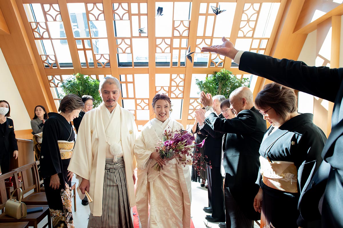 折り鶴シャワーは手作りの鶴を持ち込みました。(折り鶴は自身の仕事先の常連様達に折って頂きました!)