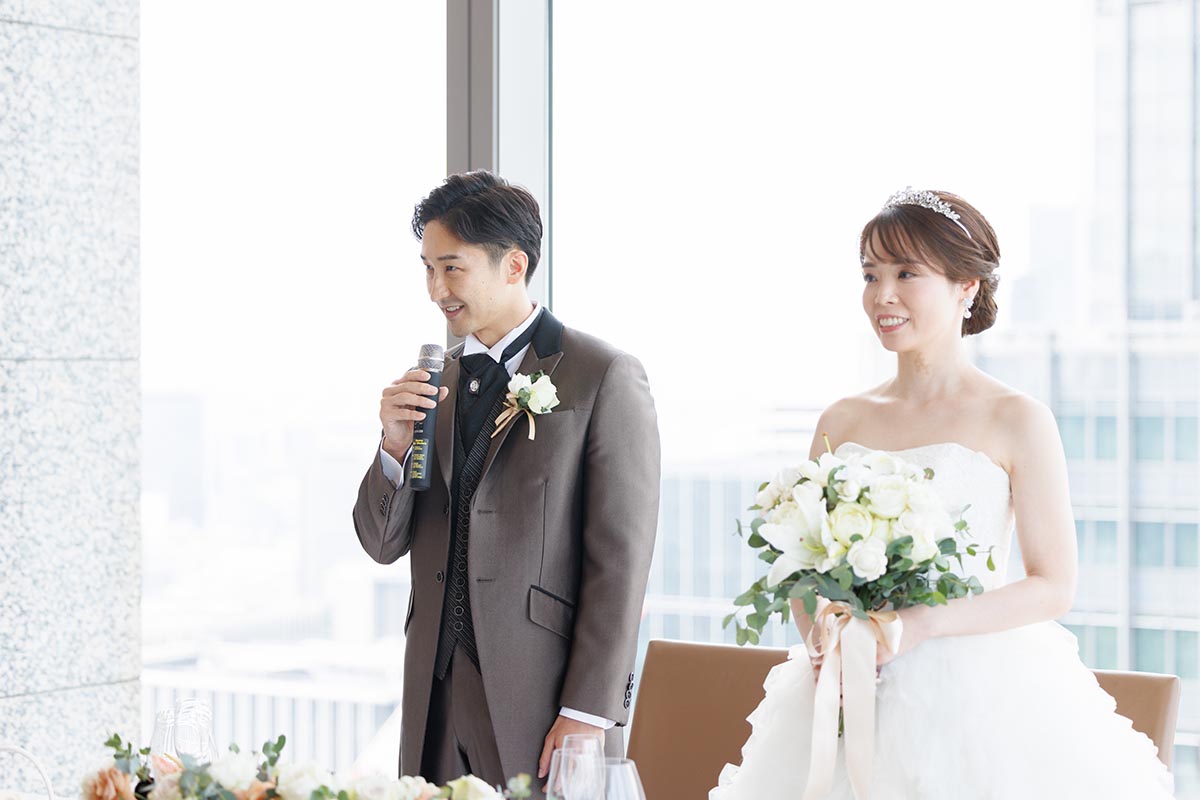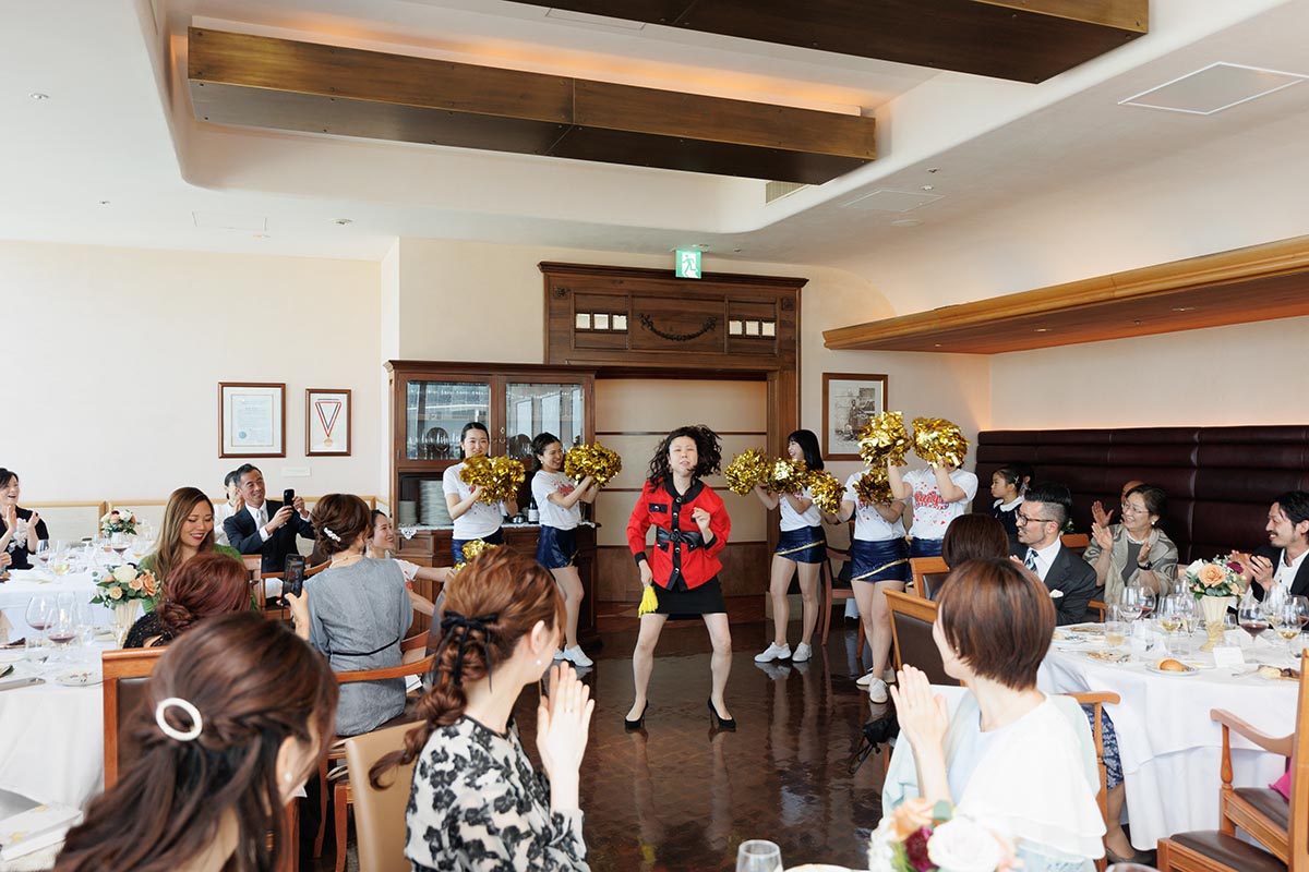 ・スピーチ:新郎友人代表スピーチの入場シーンを新婦側ゲストによるチアダンスで盛り上げ。一番盛り上がるタイミングでできるように、乾杯前ではなくお色直し後にスピーチの時間をとりました
