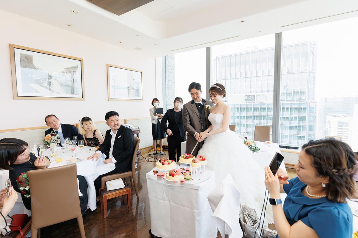 個人的には、着席したときのテーブルコーディネートで配置されるお花柄のお皿とウエディングケーキには珍しいマカロンの装飾がとても可愛くて気に入りました。