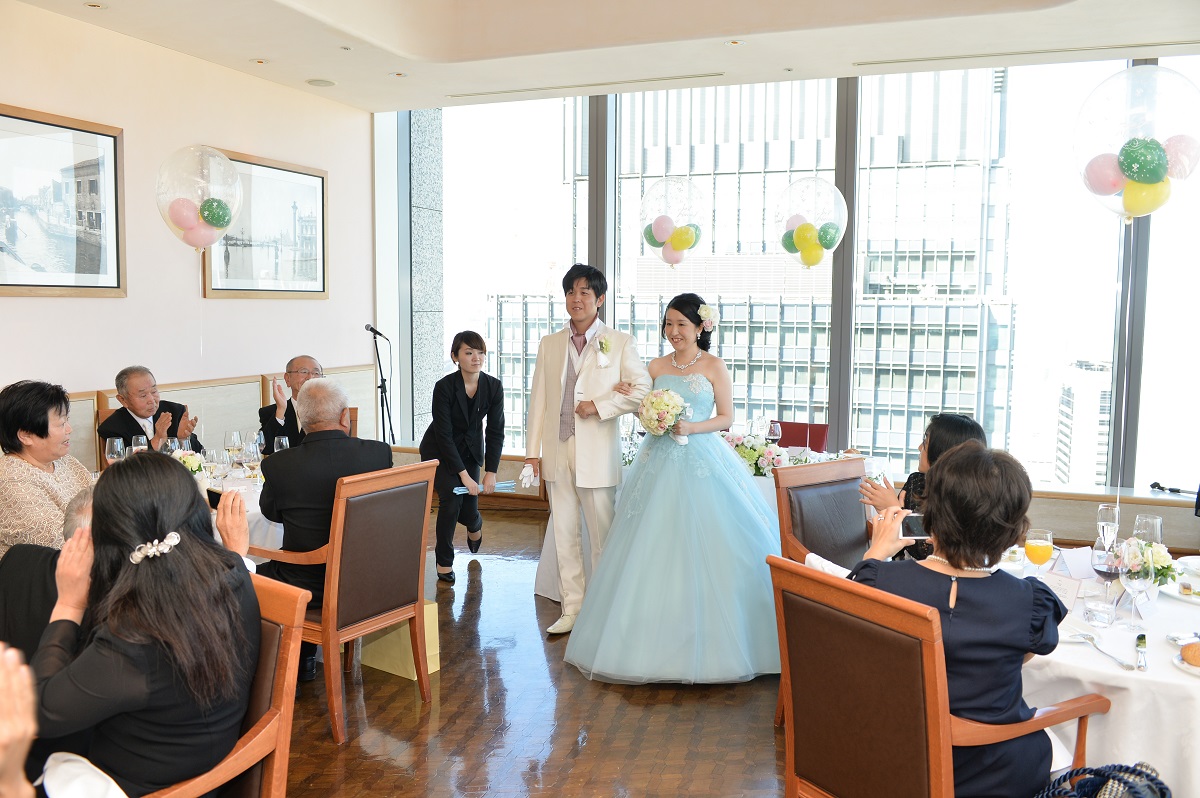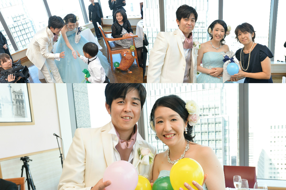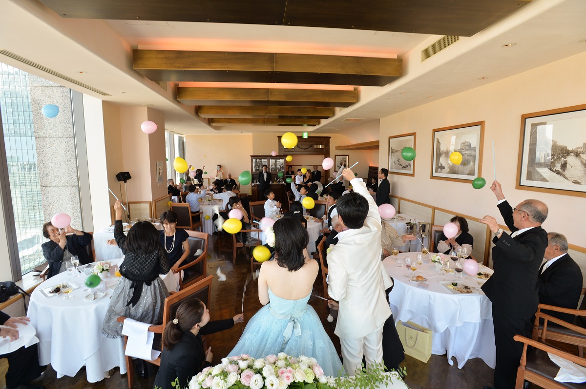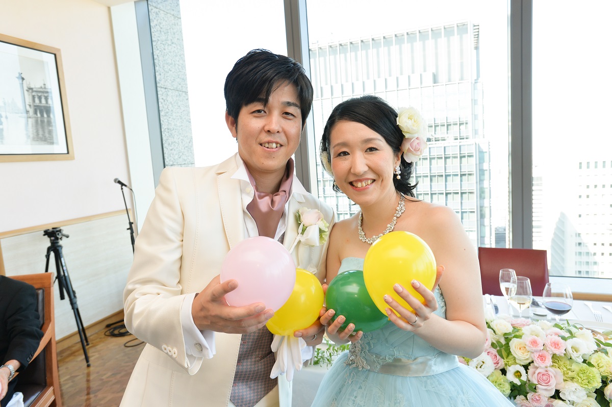 ゲストも参加できるバルーンを使った余興にしました。最初は子供達が楽しめるように用意していましたが、当日は大人も楽しんで頂けたので良かったです。身内だけの披露宴なので余興というよりゲストとゆっくり過ごしたいと思っていました。私達の席からゲストとの距離も近い事もありゲストの表情や美味しそうにお料理を楽しんでいる様子が見えたのも良かったです。落ち着いた雰囲気の会場はイタリアンアンティークの内装になっていたので写真も良い感じに写っていた事もゲストに喜ばれていました。