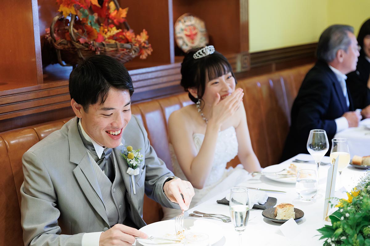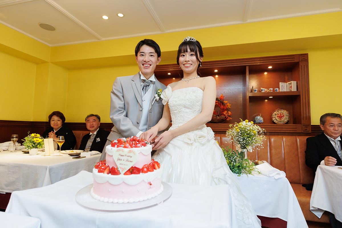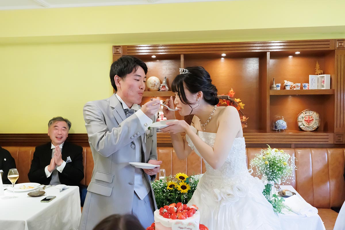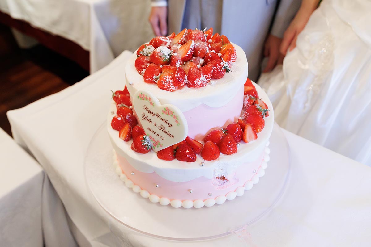 また、ウエディングケーキは要望に沿って作っていただくことができ、妻の希望でピンクのクリームを使ったケーキを作っていただきました。新郎新婦のケーキ食べさせあいの前に両親に見本として食べさせあいをしてもらう演出もご提案いただきました。本番ではかなり盛り上がったので良かったです。