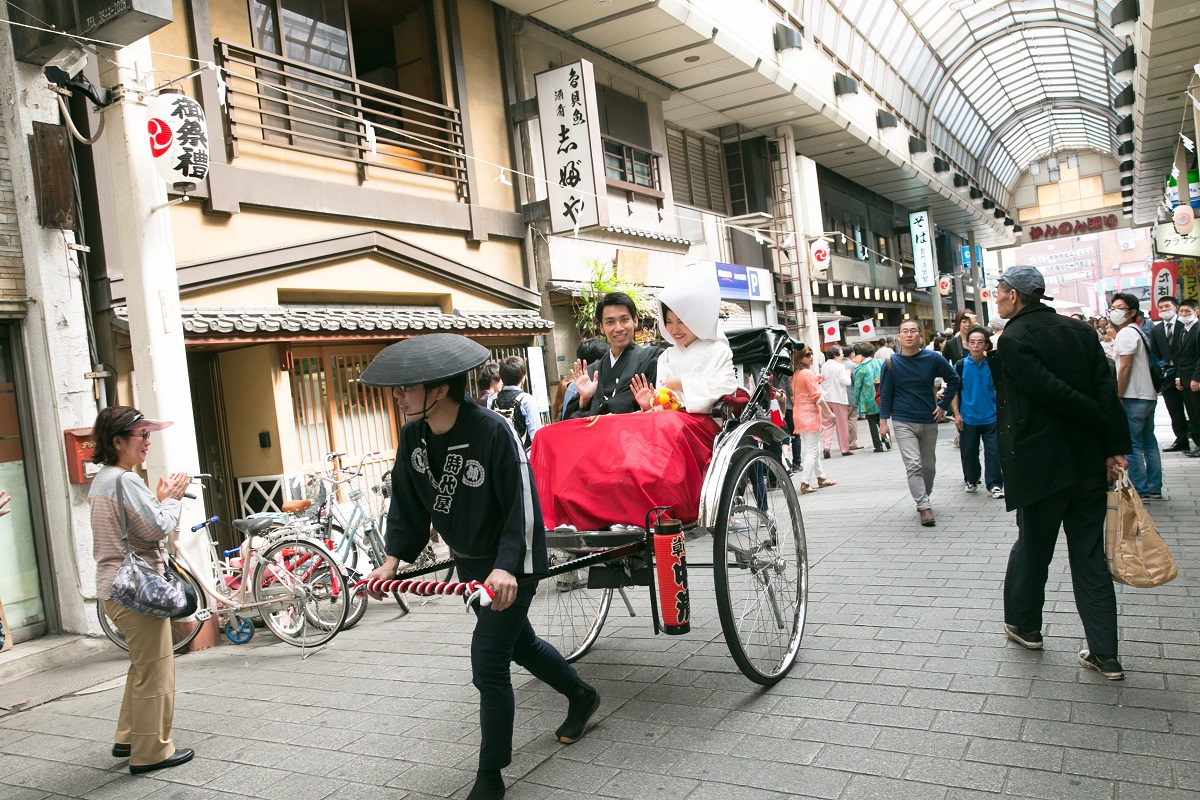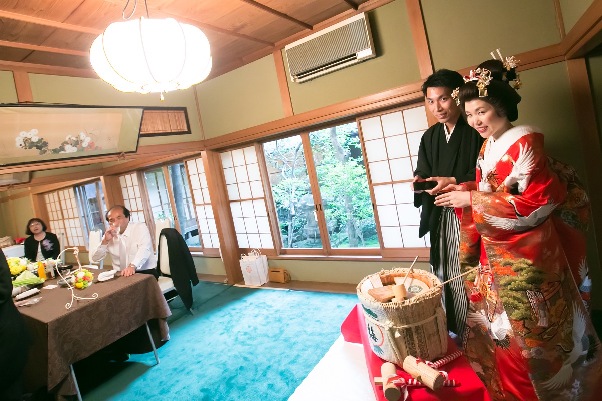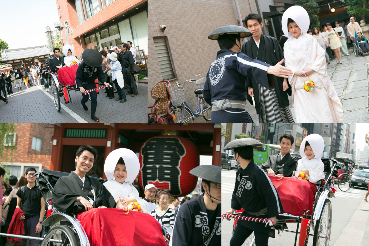 浅草といえば人力車。着物と人力車はとても絵になると思います。当日は中清さんから乗車して見送っていただきました。GW真っ只中で人が多かったのですが、見ず知らずの本当にたくさんの皆さんが「おめでとう!」と声を掛けてくださったり手を振ってくださったりとても暖かい気持ちになり、とても良い経験になりました。また、和婚ということでケーキカットではなく鏡開きをさせていただきました。人数が少なくてお酒が余ってしまいましたが中清の皆さんがビンに詰めて下さったりと本当にお世話になりました。もし浅草で式をあげる際はぜひ花嫁道中して下さい。