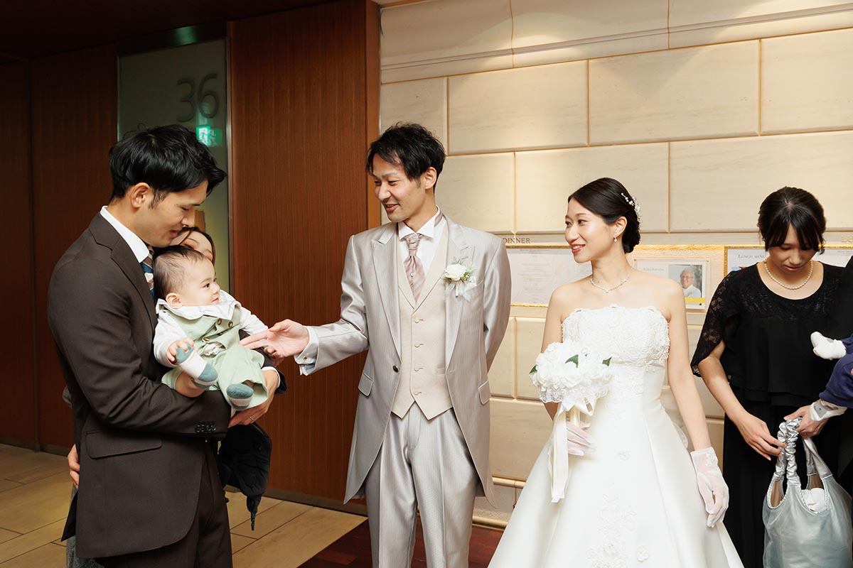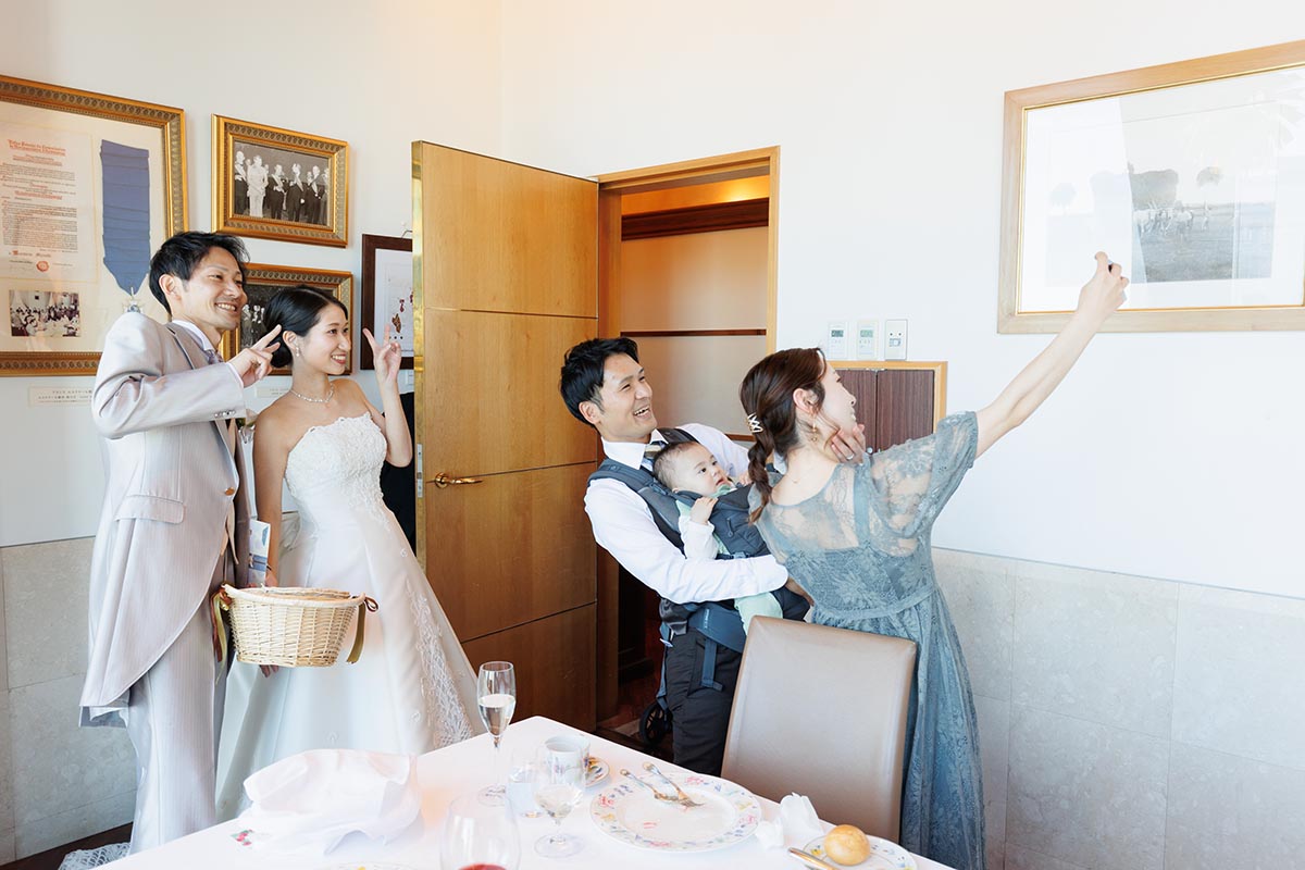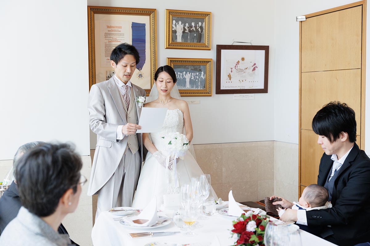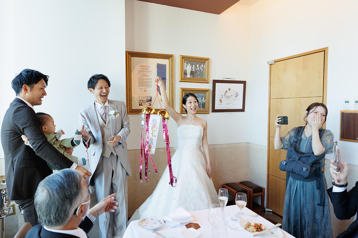 親族のみでの小規模なレストランウェディングとし、お食事を楽しんでもらいながら、親族間で歓談しるアットホームな場にしたかったため、大規模な演出、余興などはあえて取り入れませんでした。1つ行ったのは、産まれてくる子供のジェンダーリビールです。妊娠8ヶ月目でのマタニティウェディングで、既に性別が分かっていたため、くす玉を使ってこの場で発表を行いました。さらに、新郎新婦とも、それぞれ兄弟夫婦の子供(0歳児)がいたため、パパに抱っこしてもらいながら赤ちゃんにくす玉を割ってもらったりと、赤ちゃん達の写真も沢山撮ってもらえるようにしました。